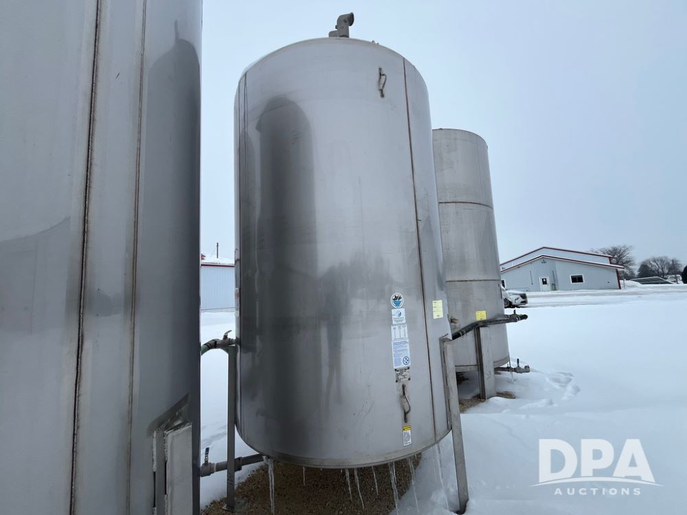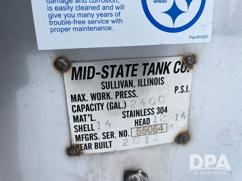 2013 Mid-State Stainless Steel Tank (JN3597), 2013 Mid-State 2,400 gallon vertical stainless steel liquid tank, stainless steel stands, valve.