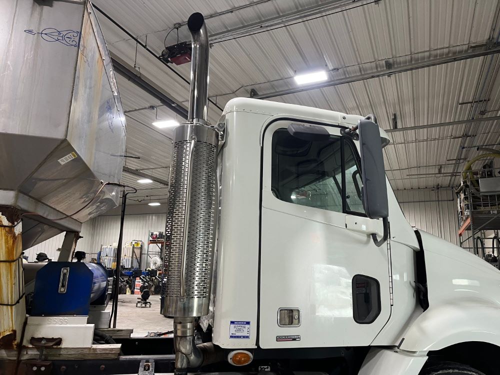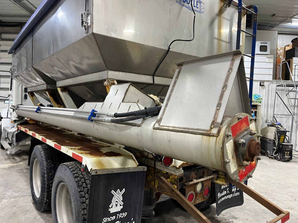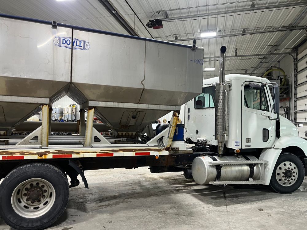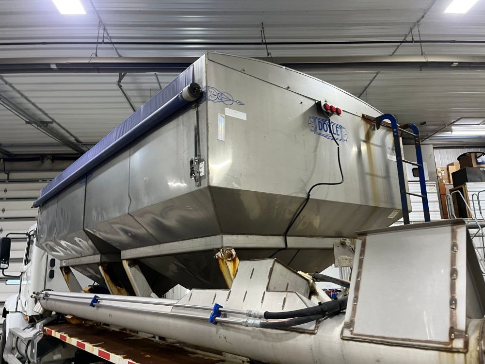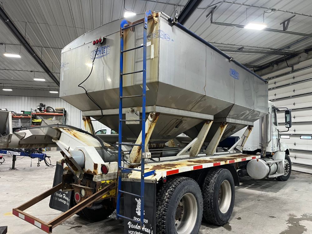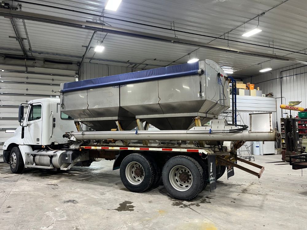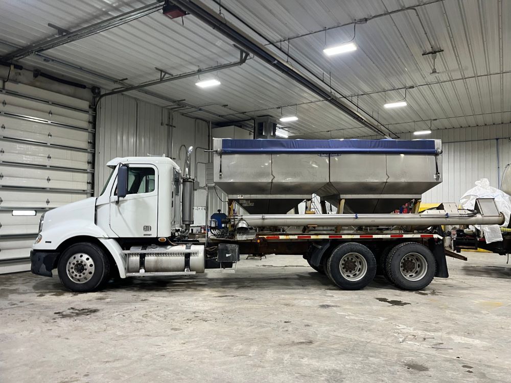 2007 Freightliner Columbia Dry Tender Truck (JN3619, Unit 1453), Mercedes-Benz diesel engine, Eaton Fuller 10 speed transmission, air conditioning, heat, Am/Fm CD radio, cruise control, engine brake, tandem axle, full screw, air ride suspension, Doyle 16 ton stainless steel dry tender box (S/N S533), side discharge auger, all hydraulic, roll over tarp, 295/75R22.5 tires, aluminum rims, shows 451,134 miles.