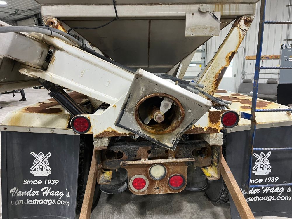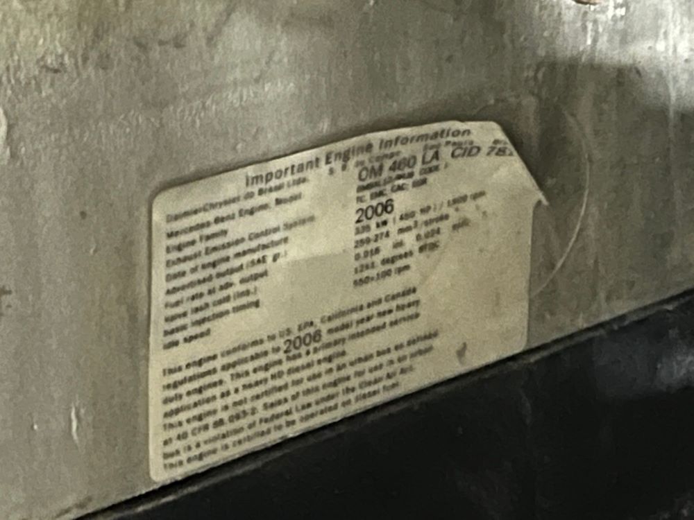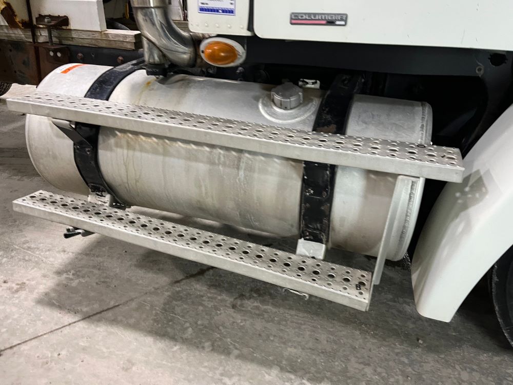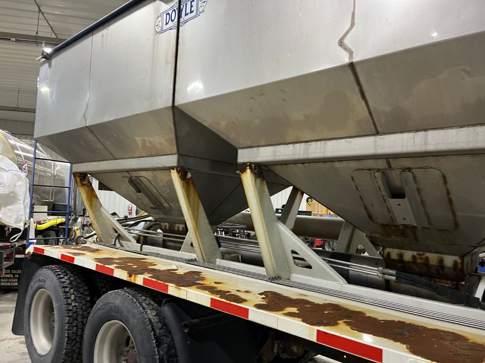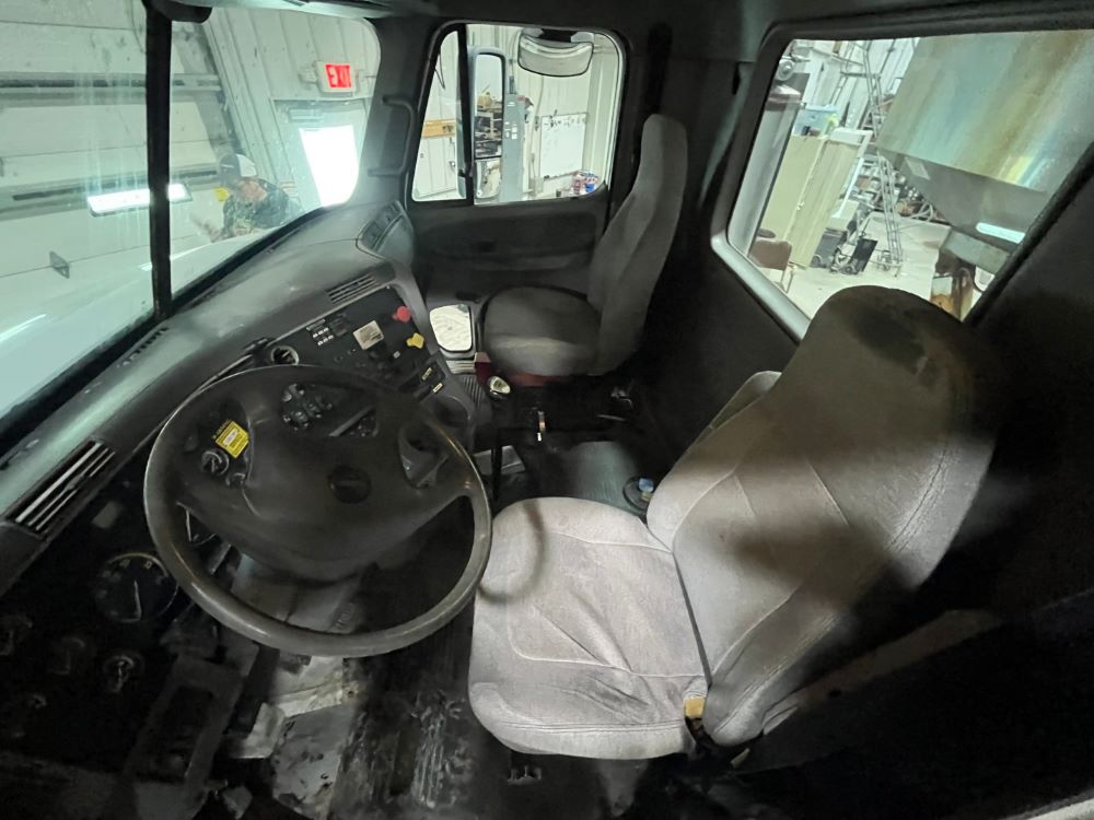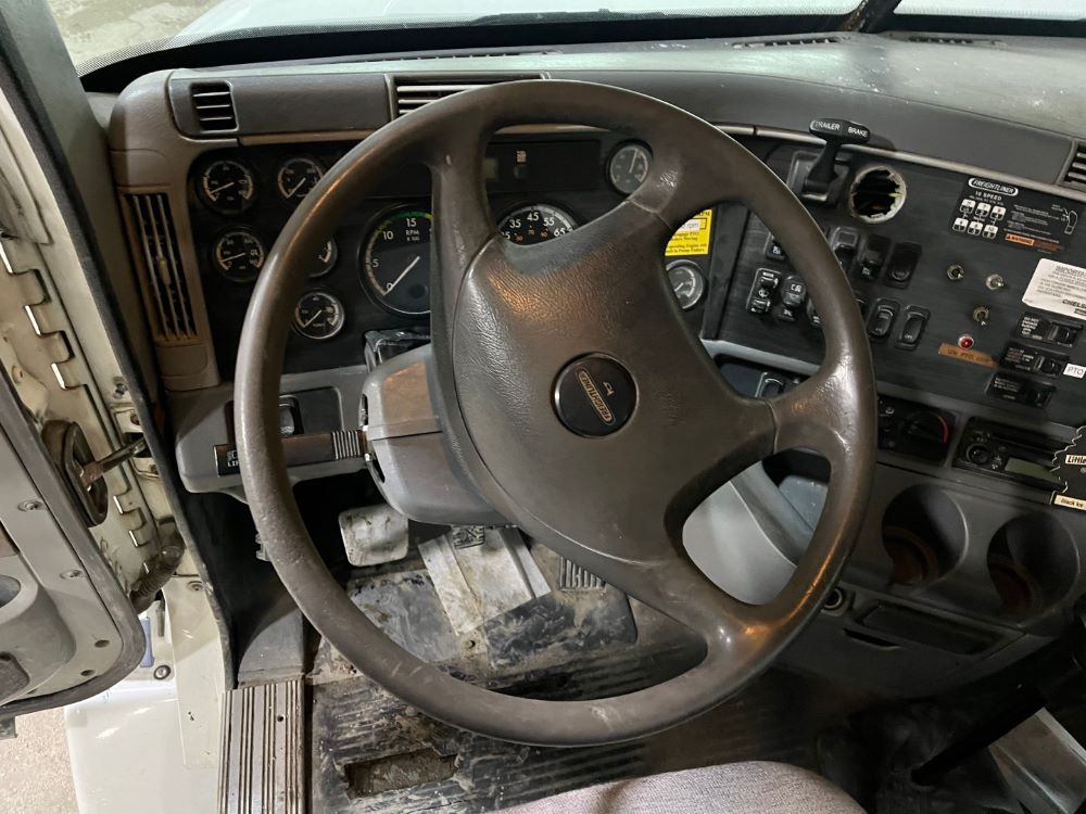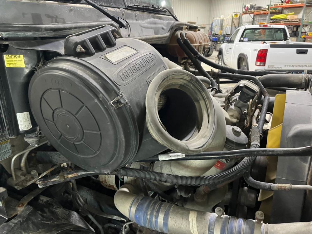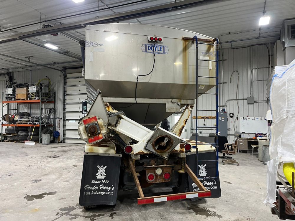 2007 Freightliner Columbia Dry Tender Truck (JN3619, Unit 1453), Mercedes-Benz diesel engine, Eaton Fuller 10 speed transmission, air conditioning, heat, Am/Fm CD radio, cruise control, engine brake, tandem axle, full screw, air ride suspension, Doyle 16 ton stainless steel dry tender box (S/N S533), side discharge auger, all hydraulic, roll over tarp, 295/75R22.5 tires, aluminum rims, shows 451,134 miles.