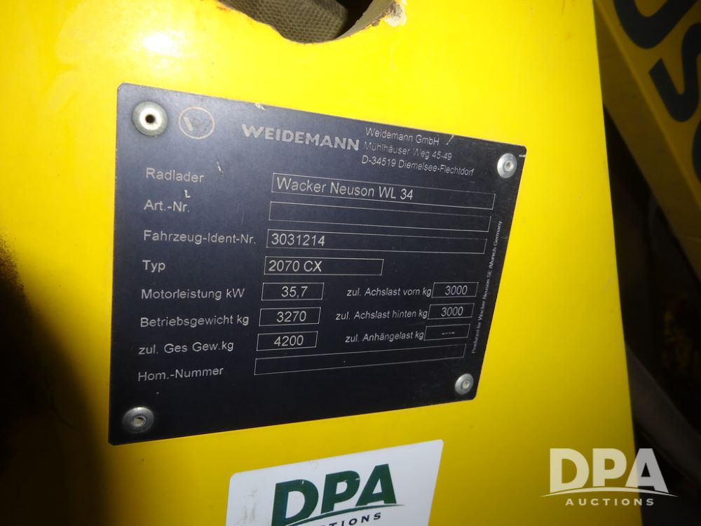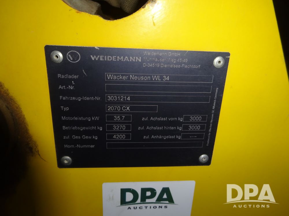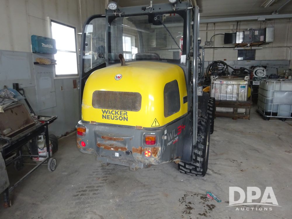 2017 Wacker Neuson WL34 Loader (PZ14231, Unit 100981), diesel engine, shuttle shift transmission, cab, lights, heat, Am/Fm radio, bucket, auxiliary hydraulics, 15.5/55R18 tires, fenders, shows 2,178 hours.