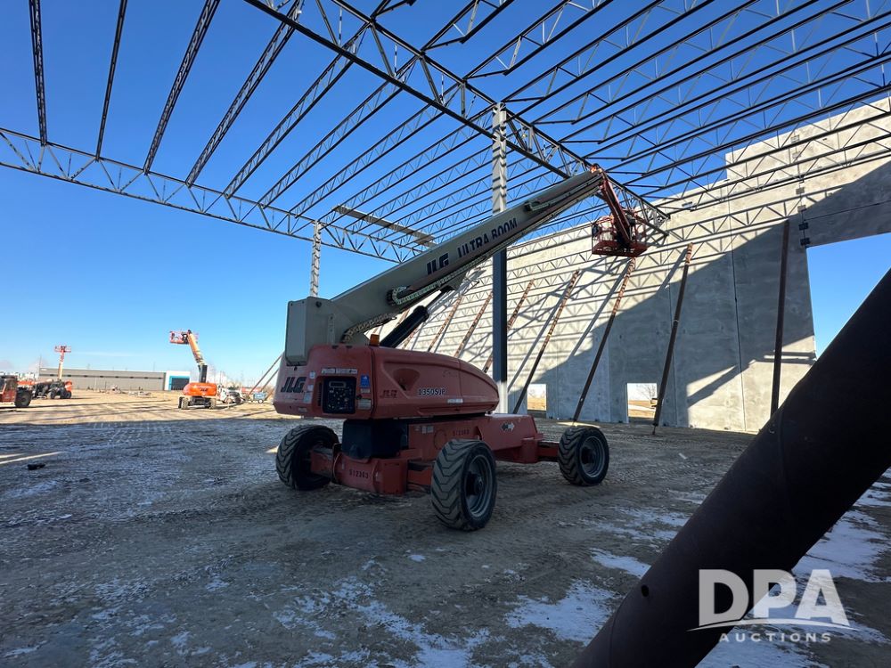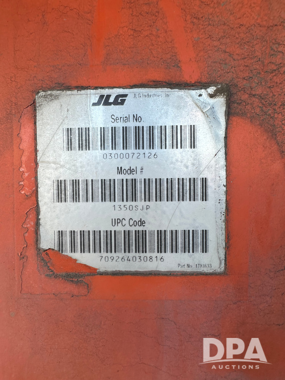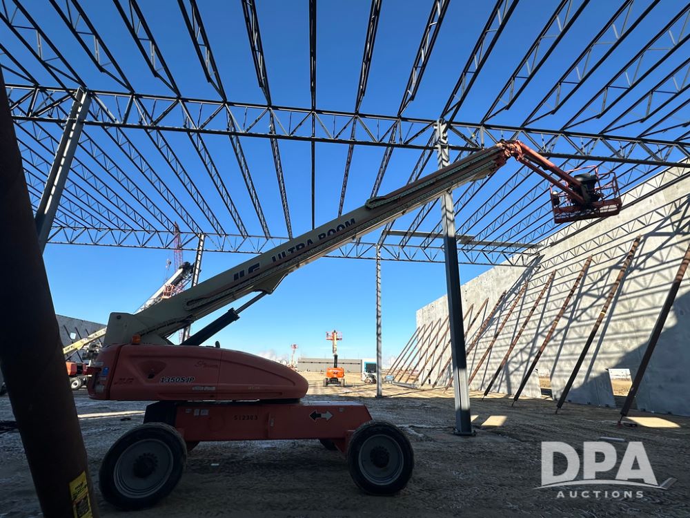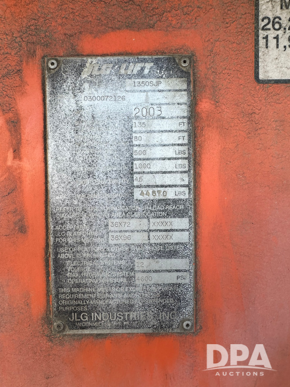 2003 JLG 1350 SJP 4x4 Ultra Boom Lift (NP6354), diesel engine, man basket, sky power generator, maximum platform height 135 feet, maximum horizontal reach 80 feet, unrestricted rated capacity 500 pounds, maximum capacity 1,000 pounds, machine weight 44,870 pounds, shows 5,156 hours.
