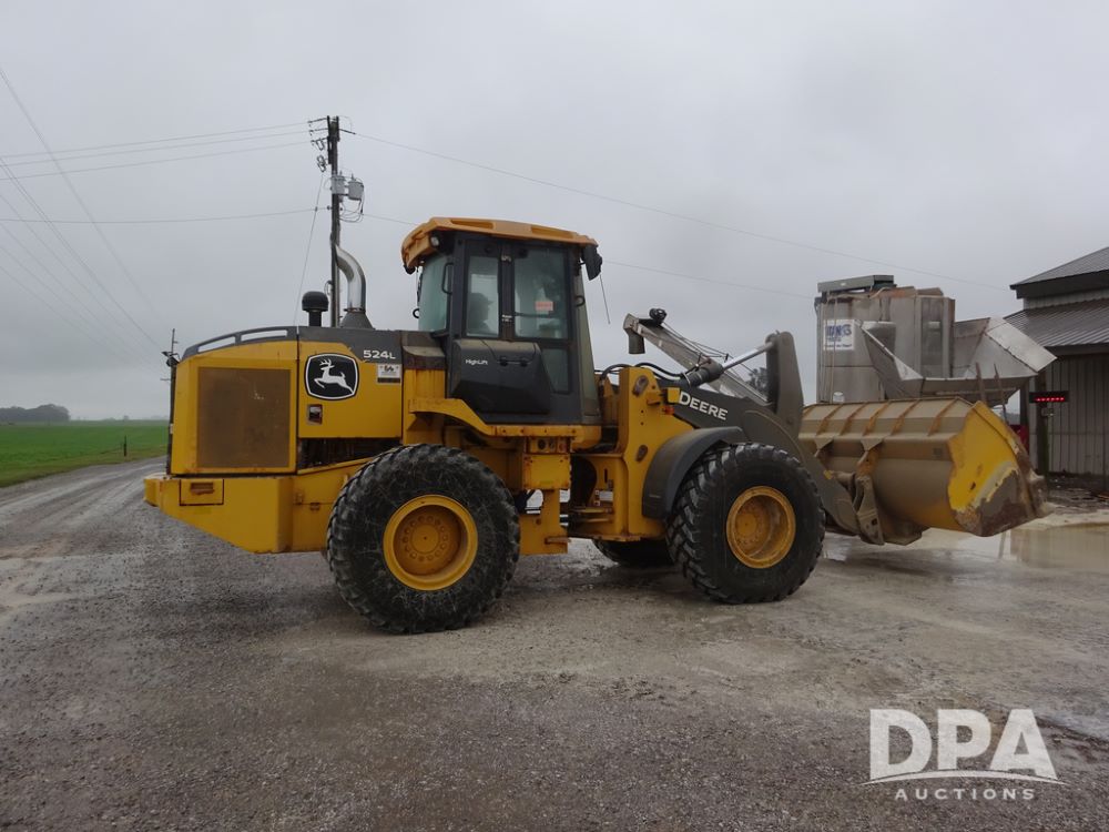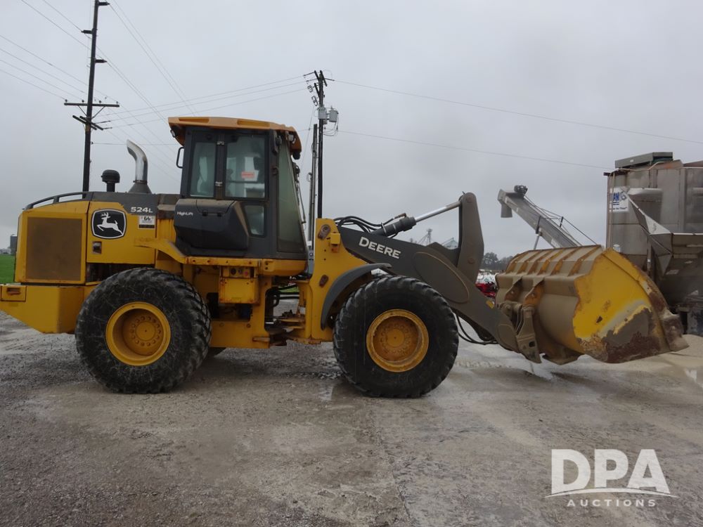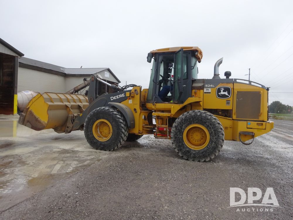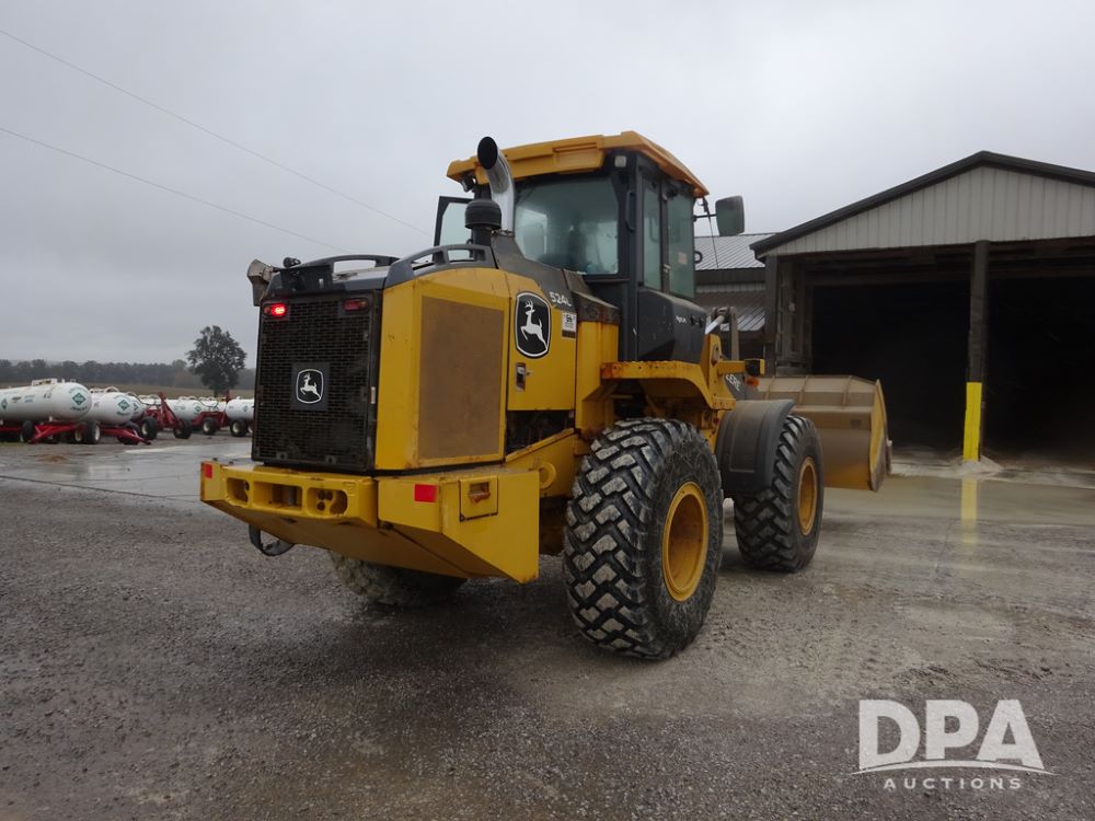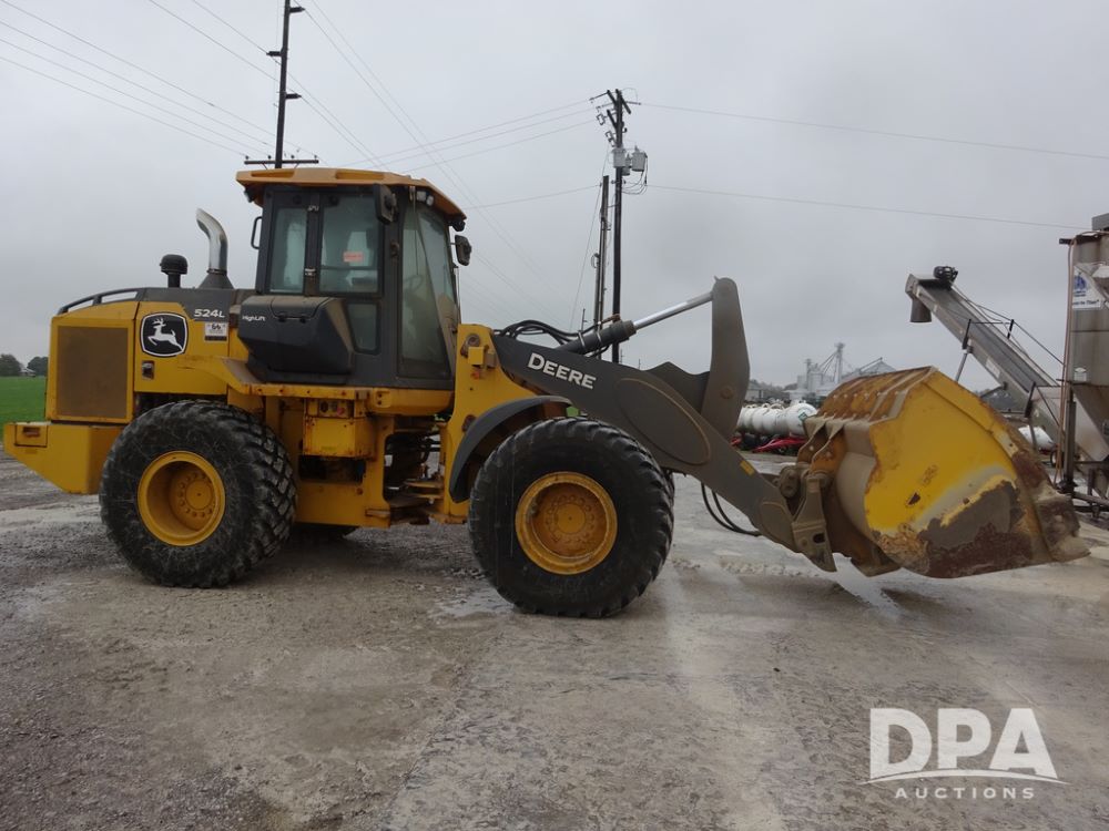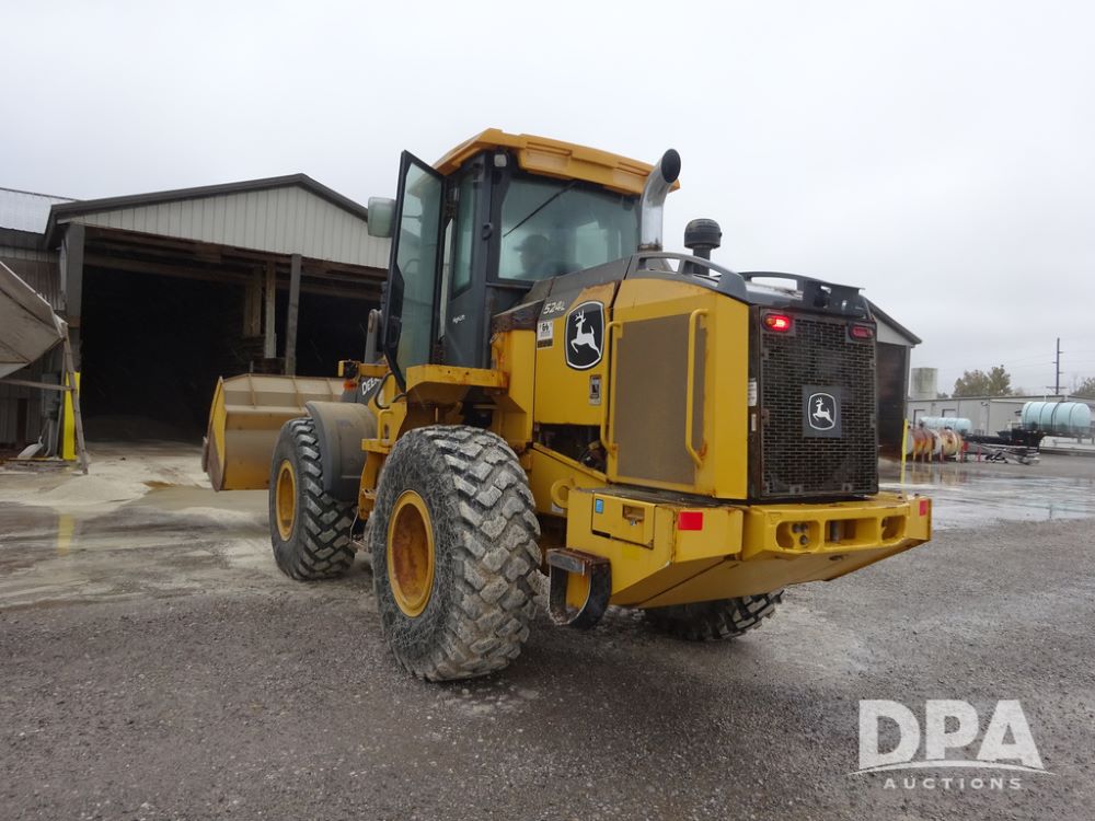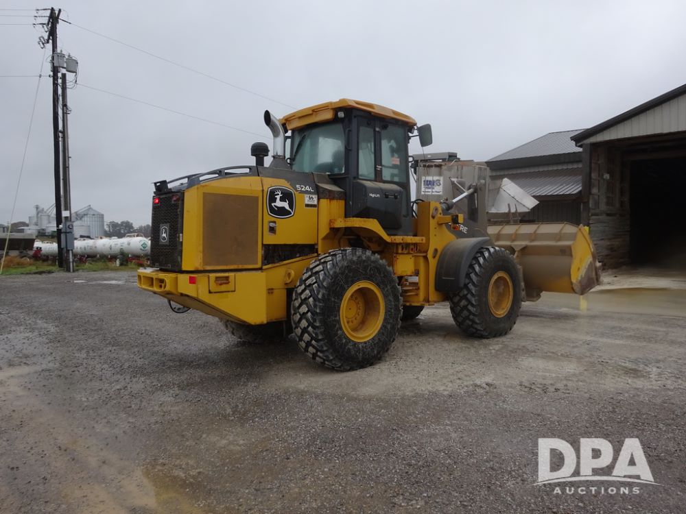 2020 John Deere 524L High Lift Loader (PZ14014, Unit 54324), diesel engine, shuttle shift transmission, air conditioning, heat, Am/Fm radio, rear buckup camera, John Deere STD light material model 444-624 Bucket (S/N PXBUSLM450059), material 5' forks, Michelin 20.5R25 tires, fenders, shows 1,347 hours.