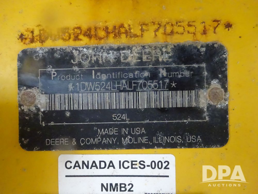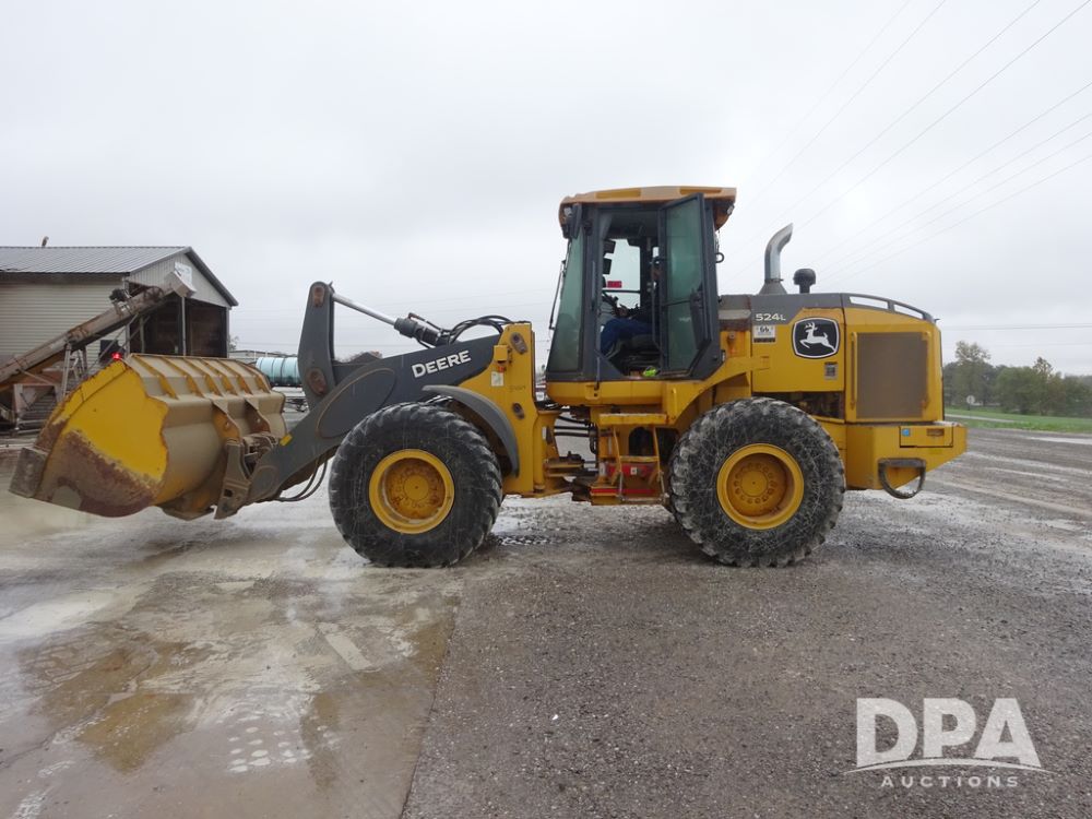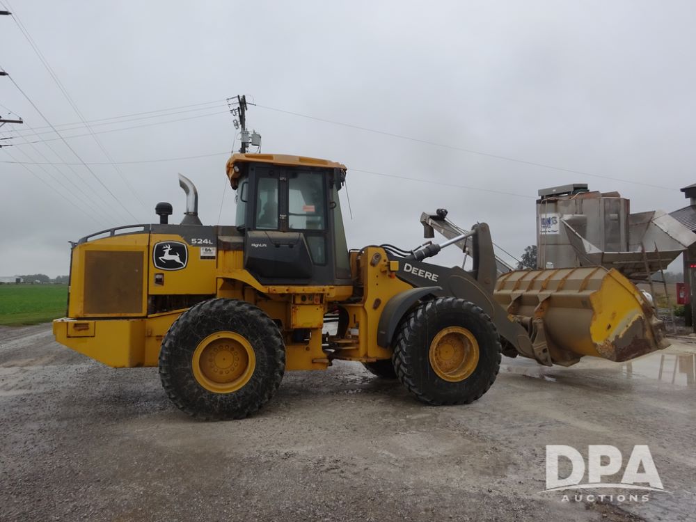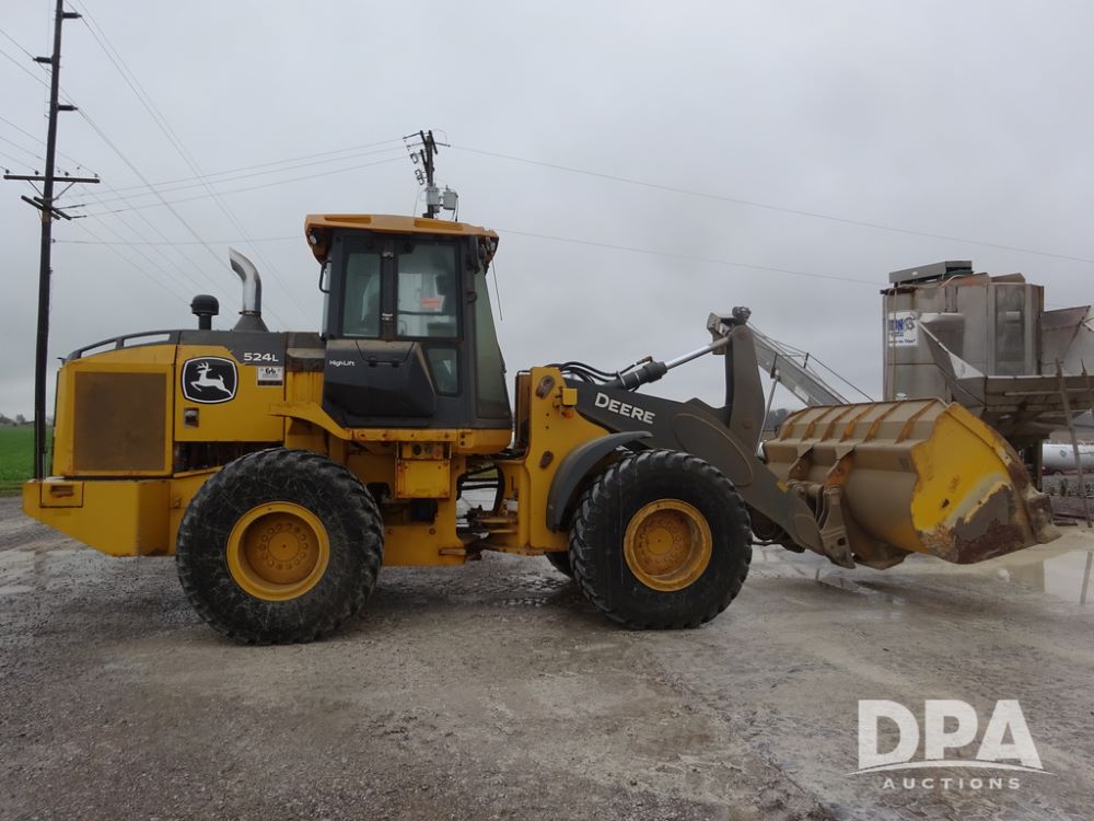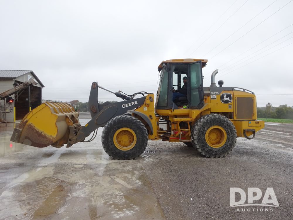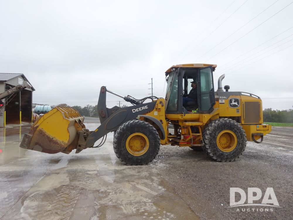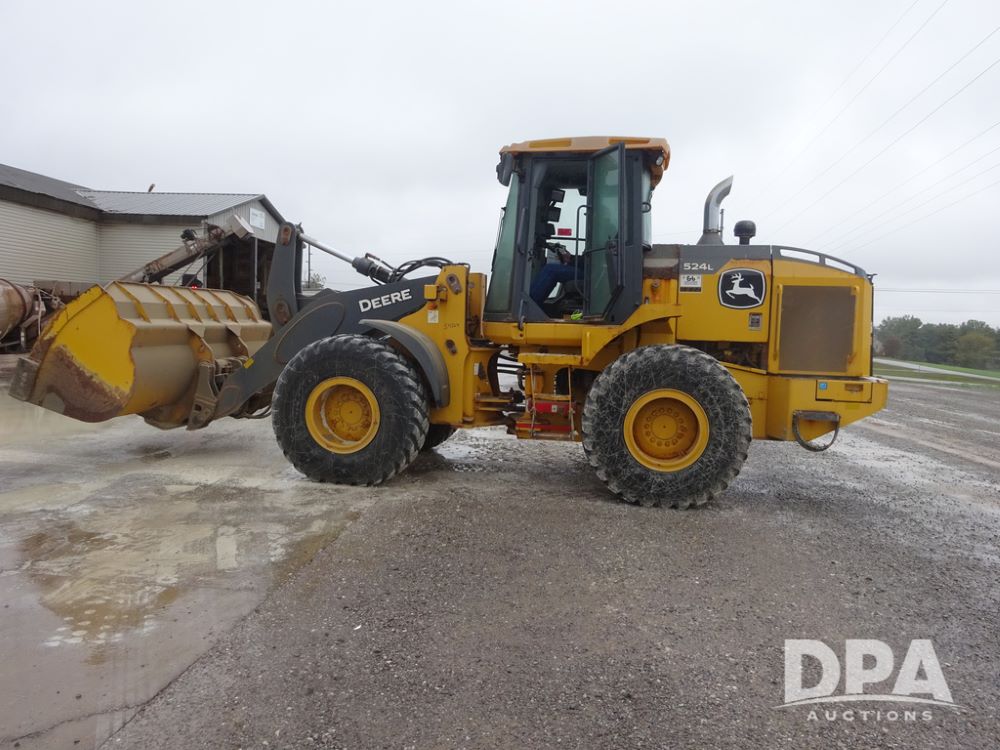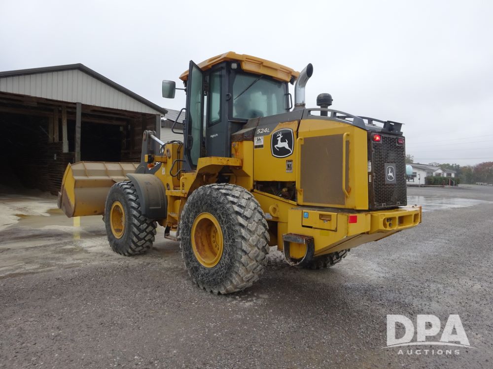 2020 John Deere 524L High Lift Loader (PZ14014, Unit 54324), diesel engine, shuttle shift transmission, air conditioning, heat, Am/Fm radio, rear buckup camera, John Deere STD light material model 444-624 Bucket (S/N PXBUSLM450059), material 5' forks, Michelin 20.5R25 tires, fenders, shows 1,347 hours.