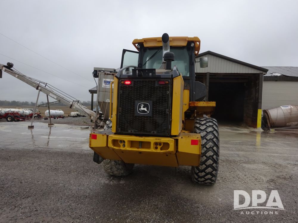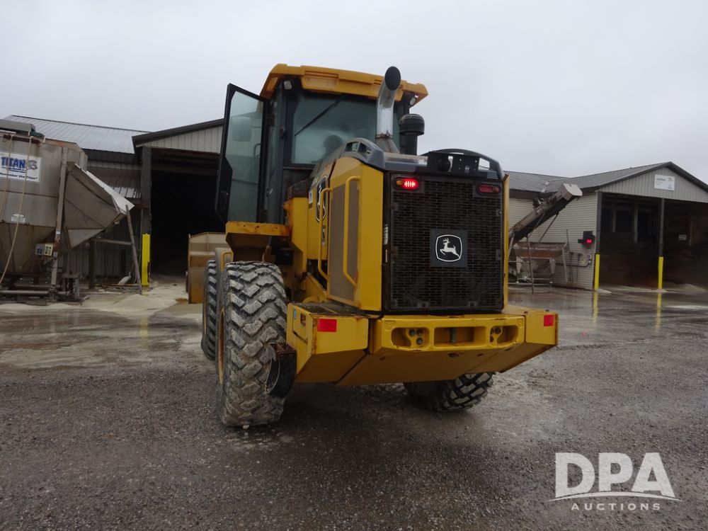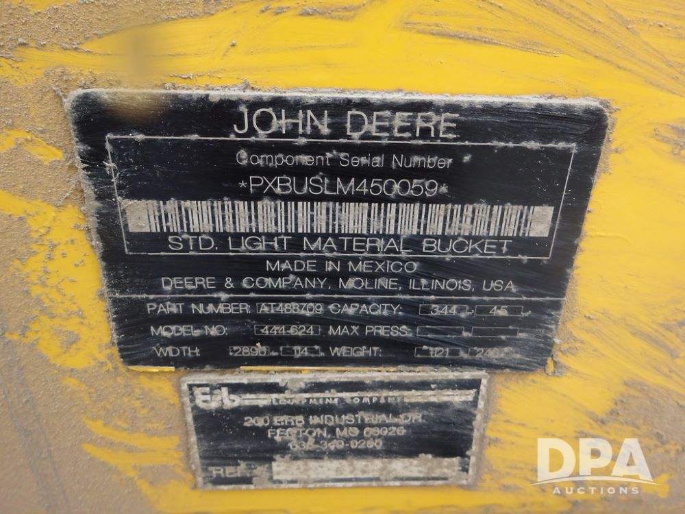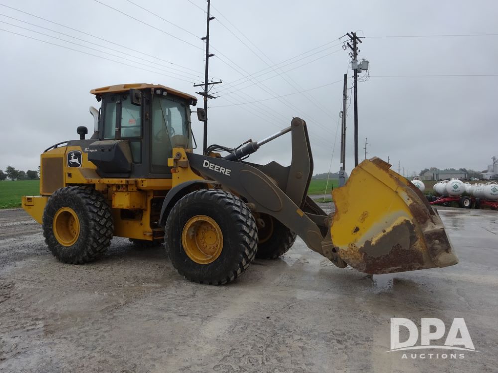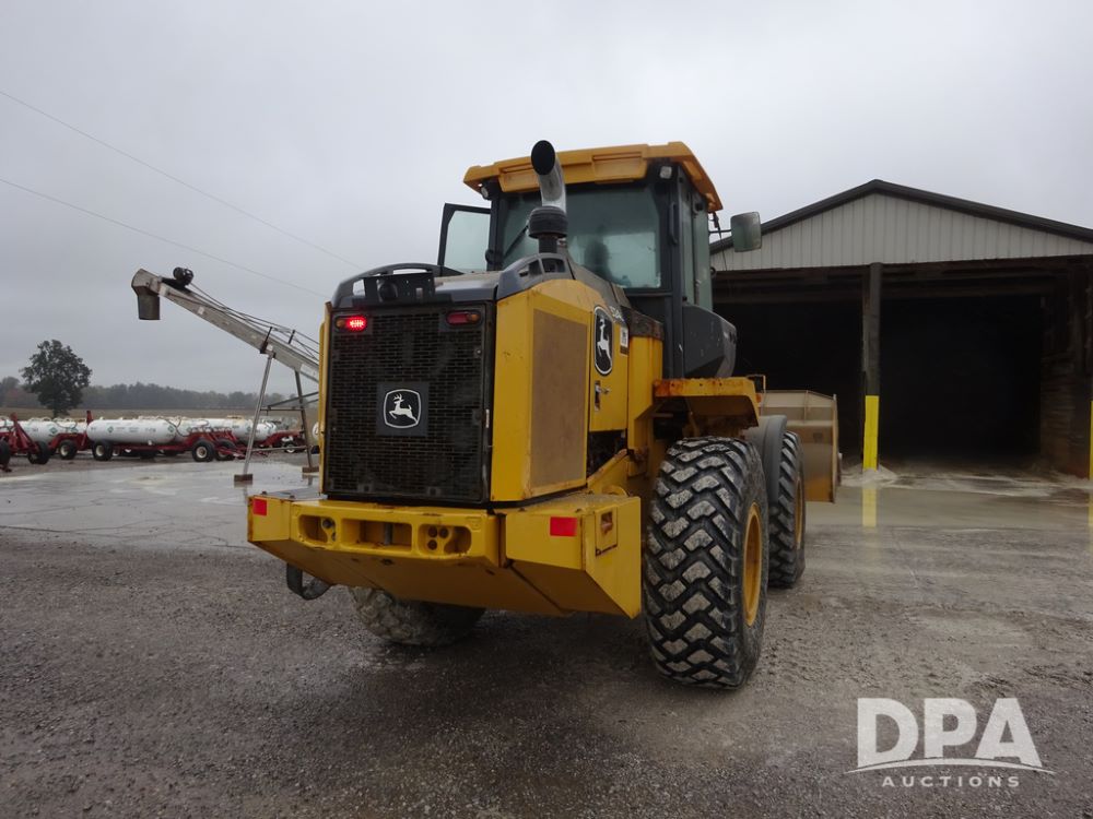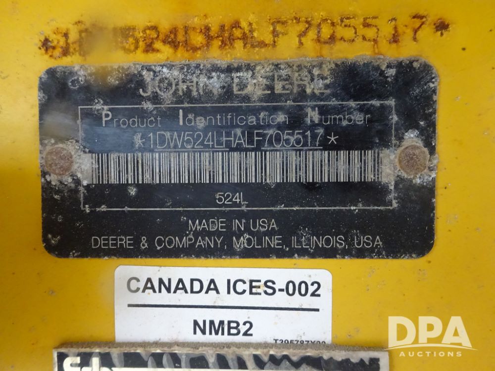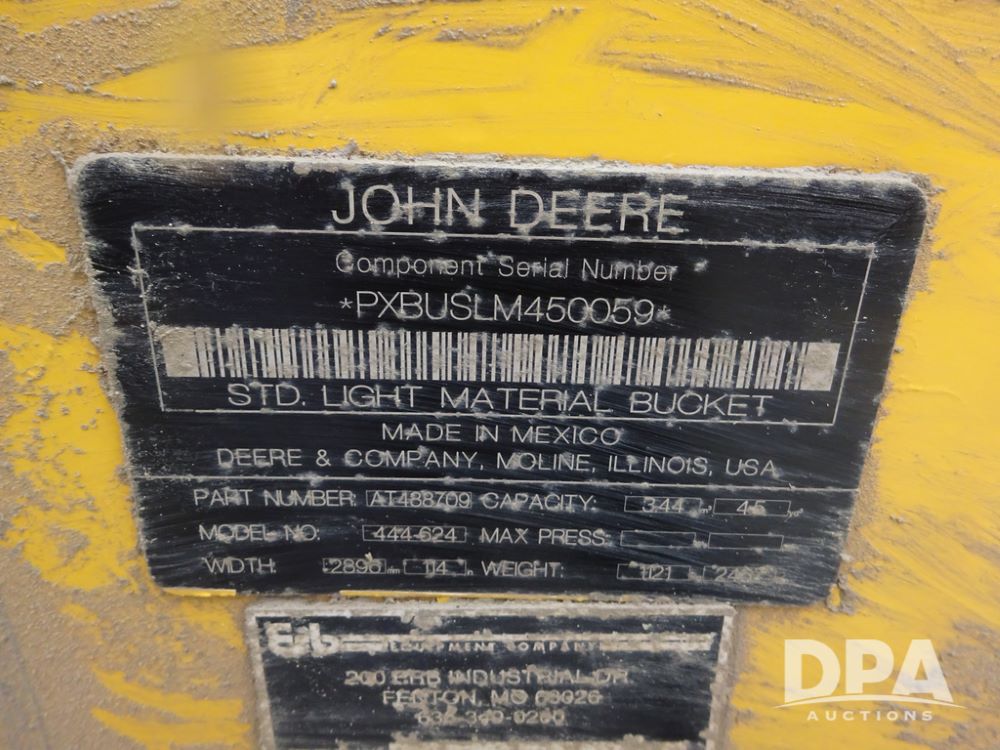 2020 John Deere 524L High Lift Loader (PZ14014, Unit 54324), diesel engine, shuttle shift transmission, air conditioning, heat, Am/Fm radio, rear buckup camera, John Deere STD light material model 444-624 Bucket (S/N PXBUSLM450059), material 5' forks, Michelin 20.5R25 tires, fenders, shows 1,347 hours.