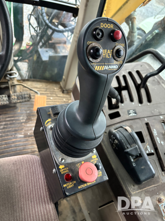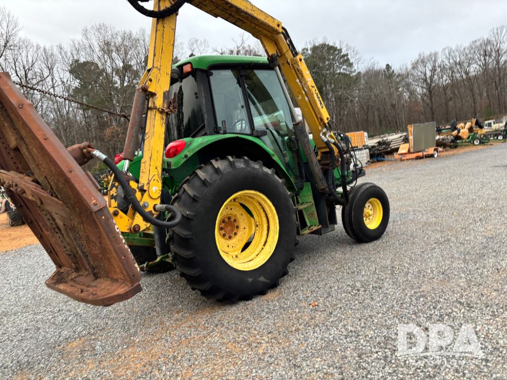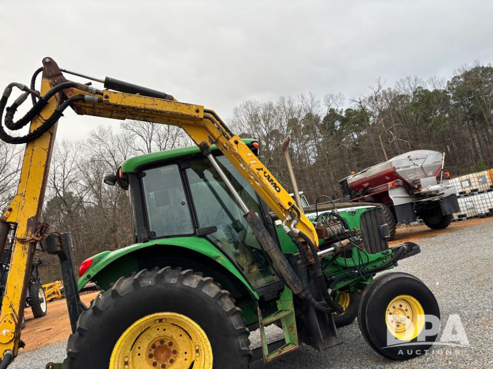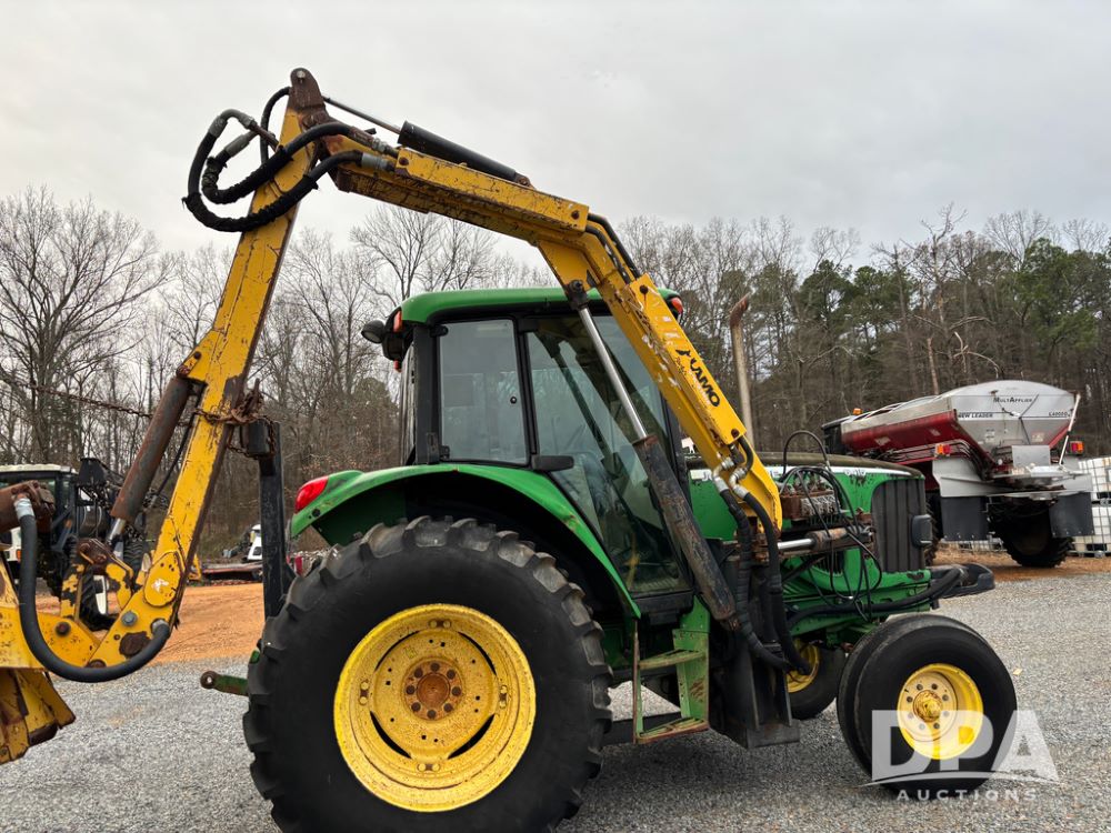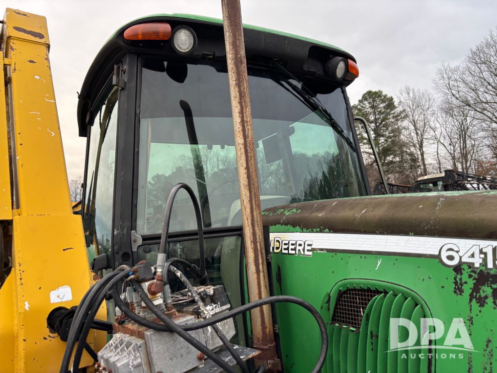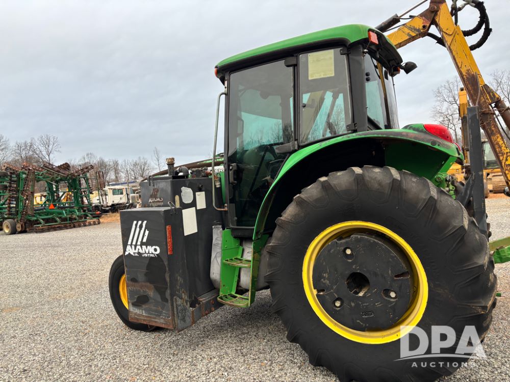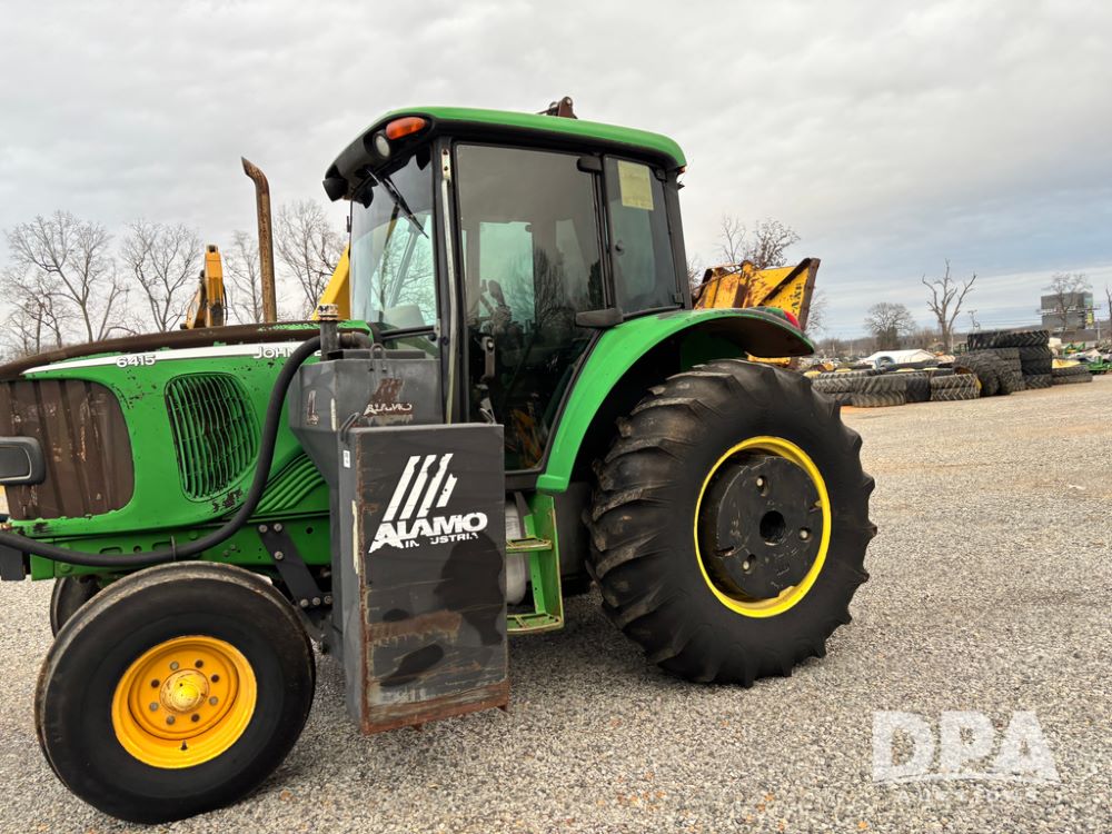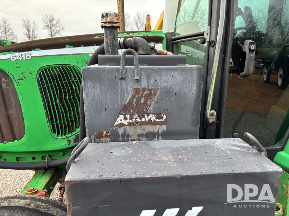 John Deere 6415 Tractor (JY1017), 104hp John Deere diesel engine, 16 speed quad range transmission, Alamo VRSA side arm hydraulic mower, 8' boom, 72'' stick, 66'' mowing deck, joystick cab control, 1,400lb rear weight, single hydraulic remote, 540 PTO, 3 point hitch, dual entry cab, air conditioning, tilt column, 10.00-16 front tires, 18.4-30 rear tires are near new, shows 165.3 hours, not actual. Mower not tested.