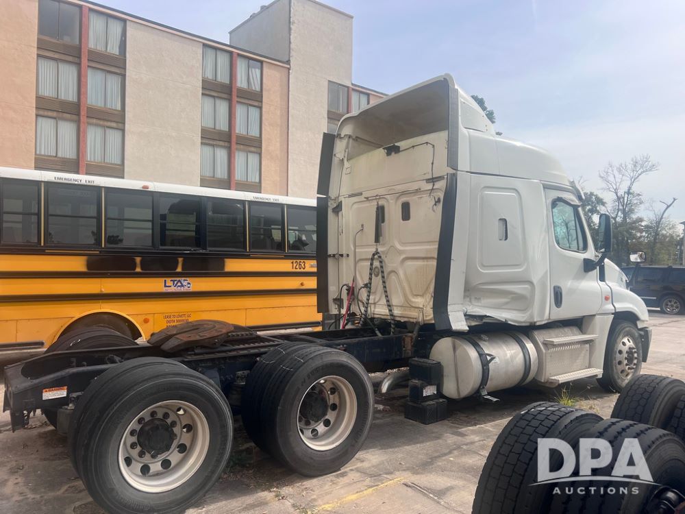 2014 Freightliner Cascadia (LS0528), sleeper cab, Detroit Dd15 diesel engine, automatic transmission, tandem axle, air conditioning system has been replaced, back passenger side cab has a dent, needs air valve and possibly batteries to drive, 80 tire tread, 726,698 miles.