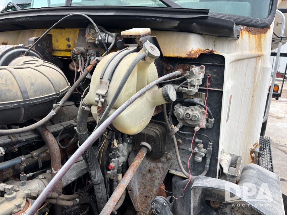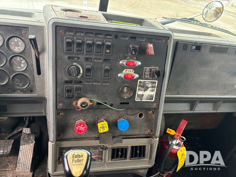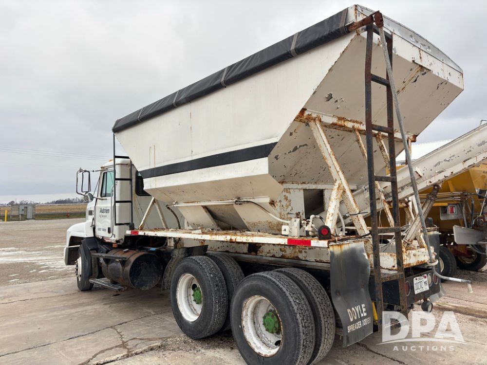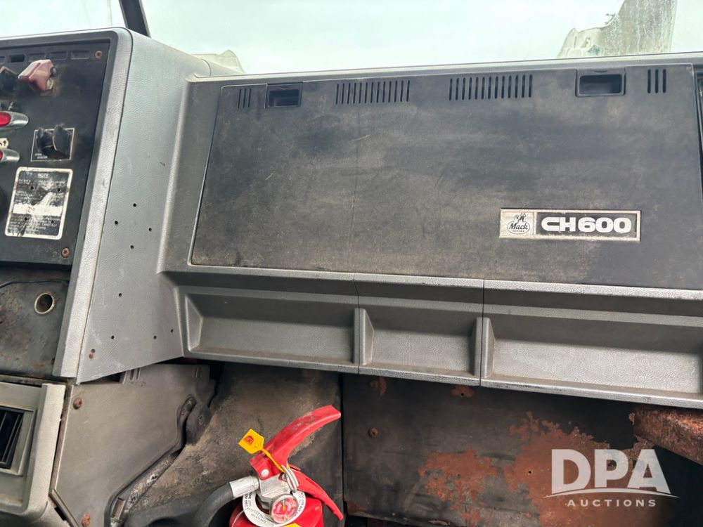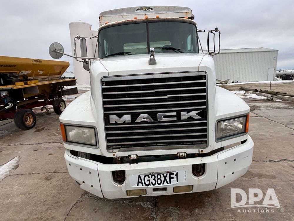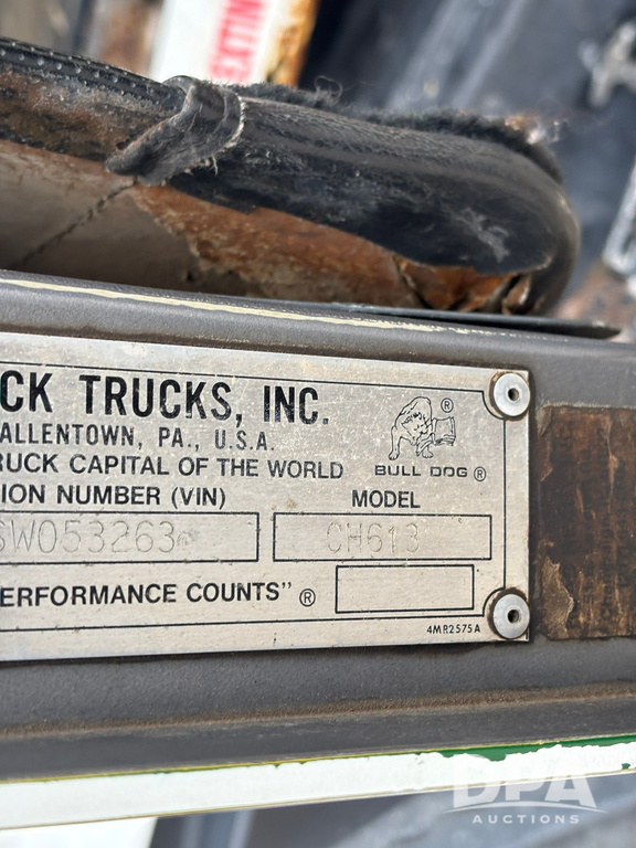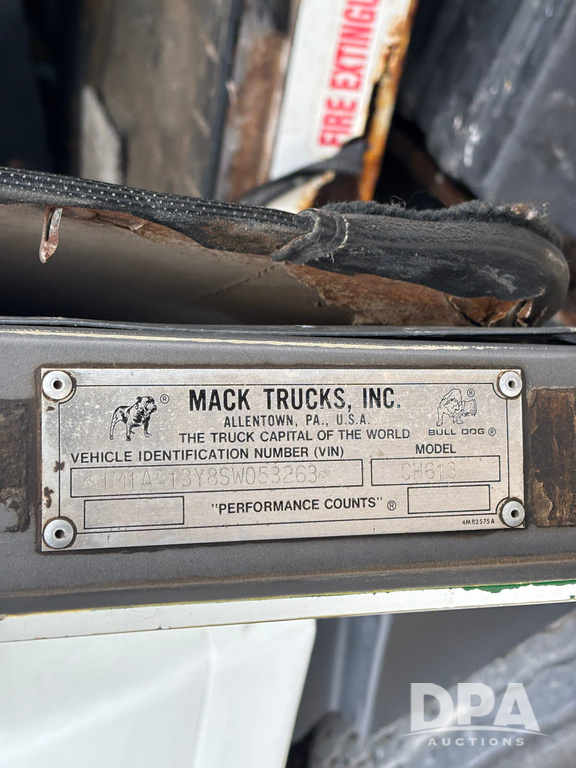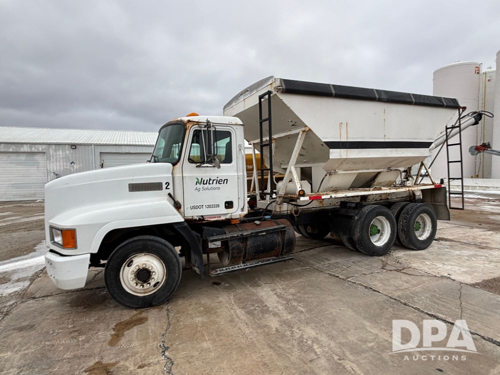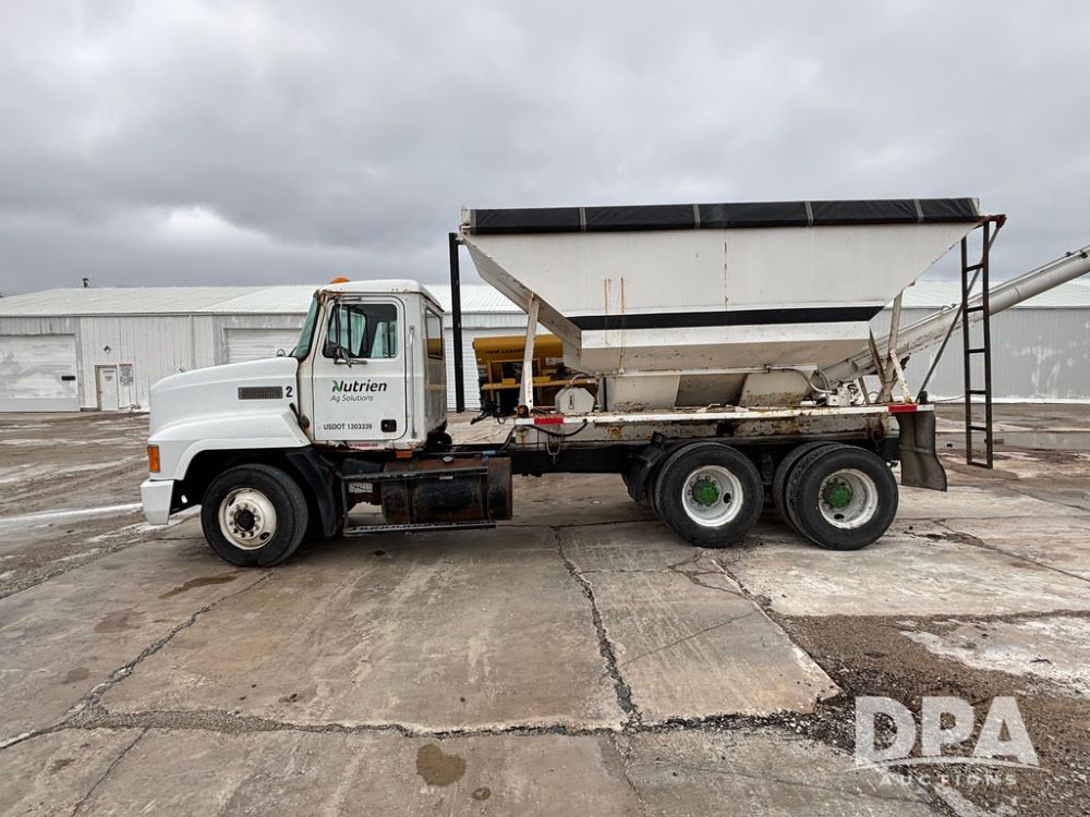 1995 Mack CH613 Dry Tender Truck (GP12184, Unit 11506), Mack E7-350 diesel engine, Eaton Fuller 9 speed transmission, air conditioning, heat, Am/Fm radio, cruise control, engine brake, tandem axle, full screw, air ride suspension, 16 ton dry tender box, rear discharge auger, all hydraulic, roll over tarp, 295/75R22.5 tires.