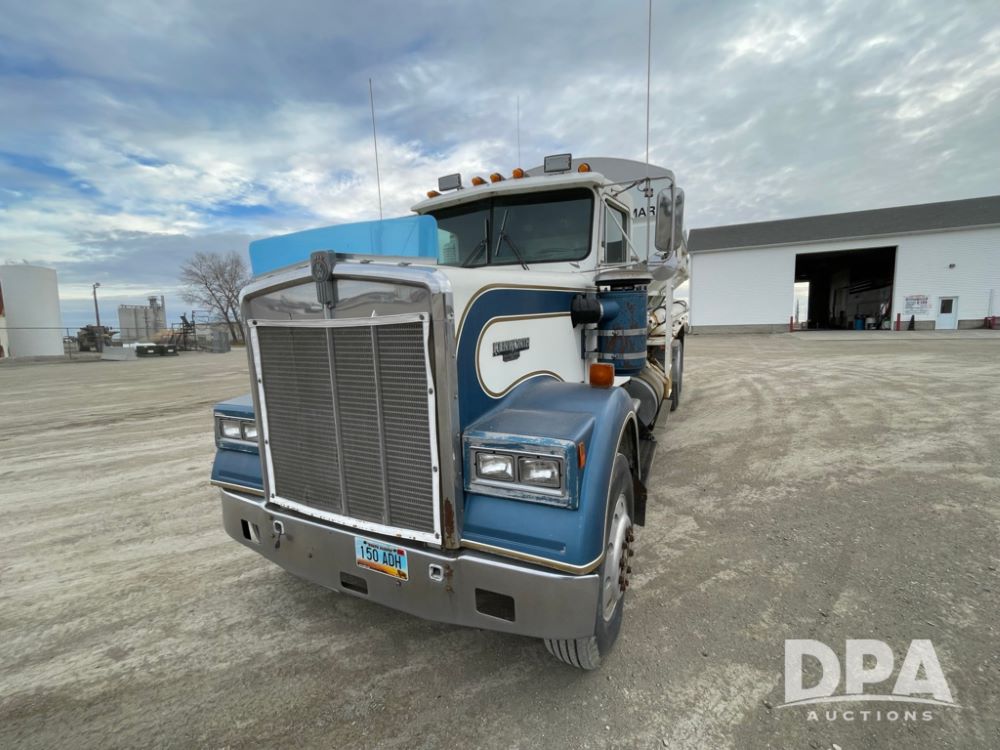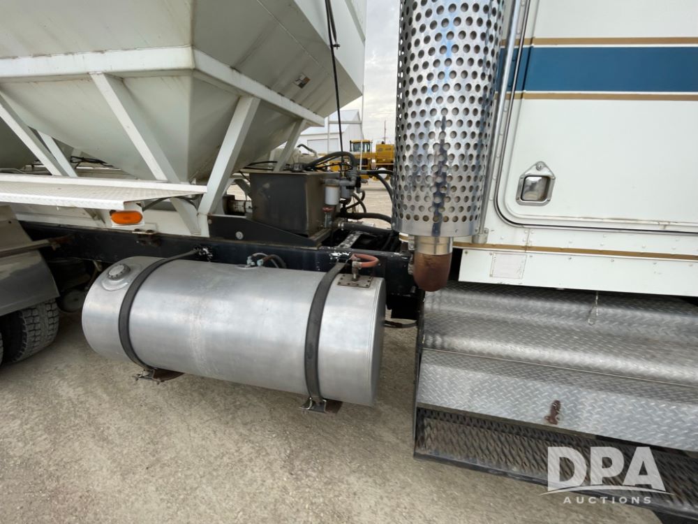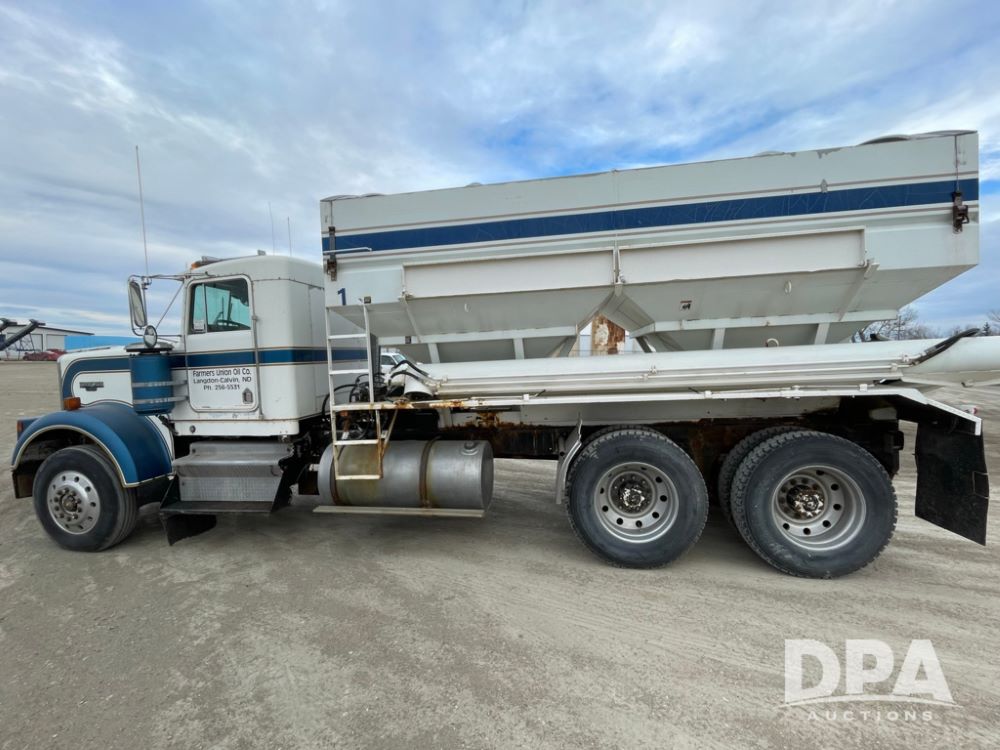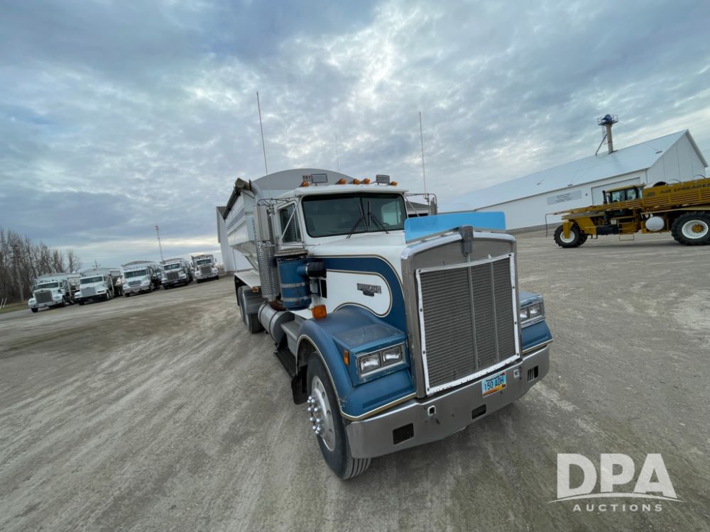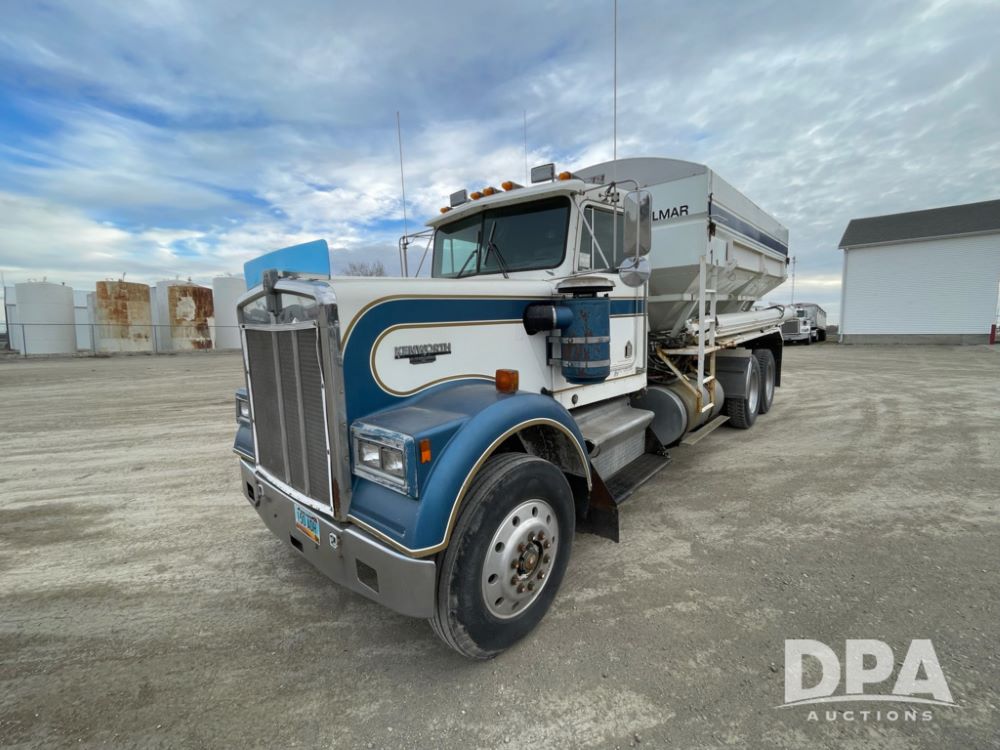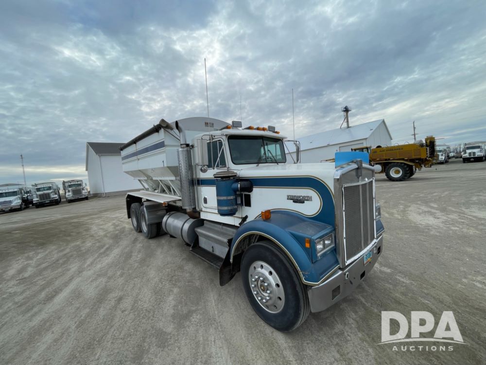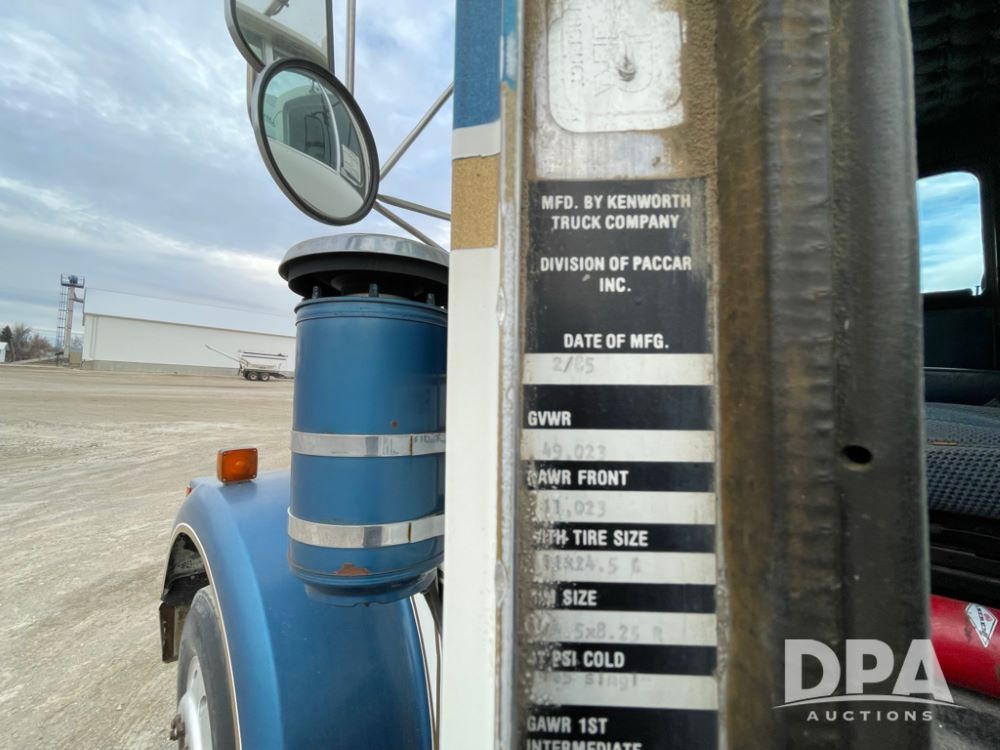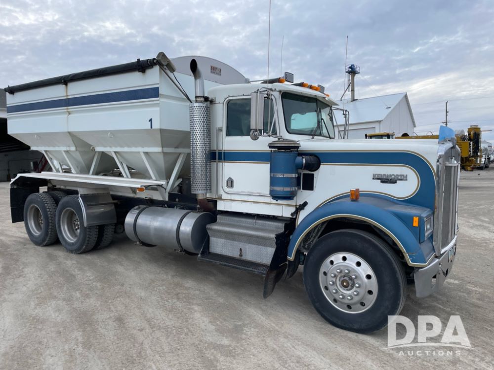 1985 Kenworth W900 Dry Tender Truck (LLD1597, Unit 1), Caterpillar diesel engine, Eaton Fuller 9 speed transmission, AM/FM radio, air ride suspension, tandem axle, dual fuel tanks, Willmar 16 ton stainless steel dry tender box, side discharge auger, all hydraulic, electric roll tarp, 11/24.5 tires, aluminum and steel rims, shows 4,759 miles (truck has turned over on mile meter).
