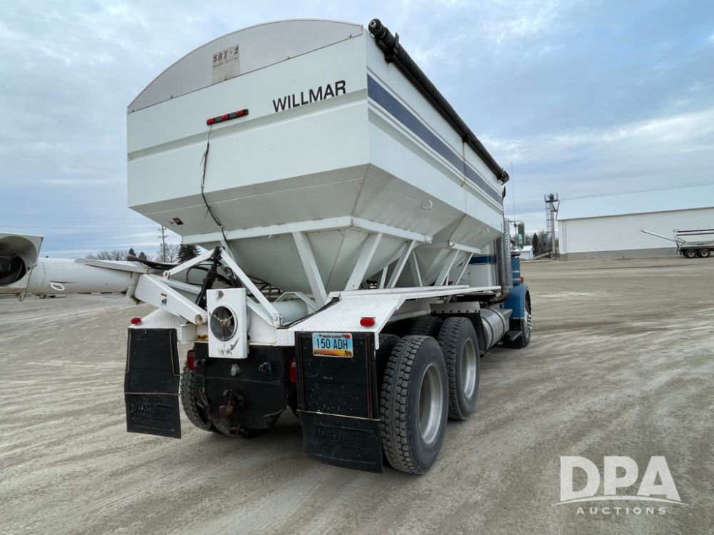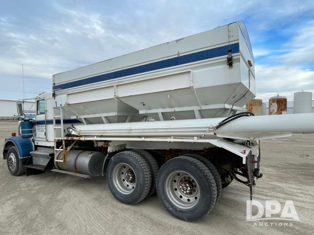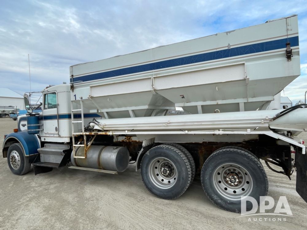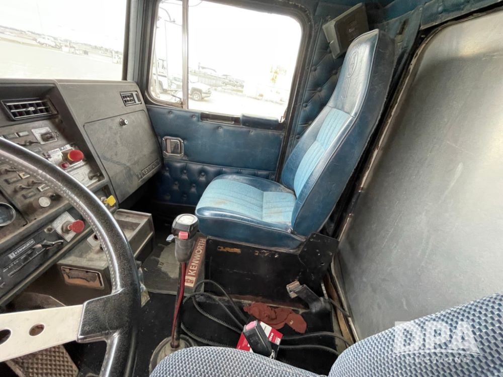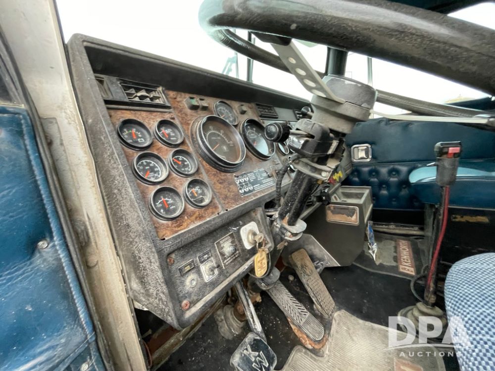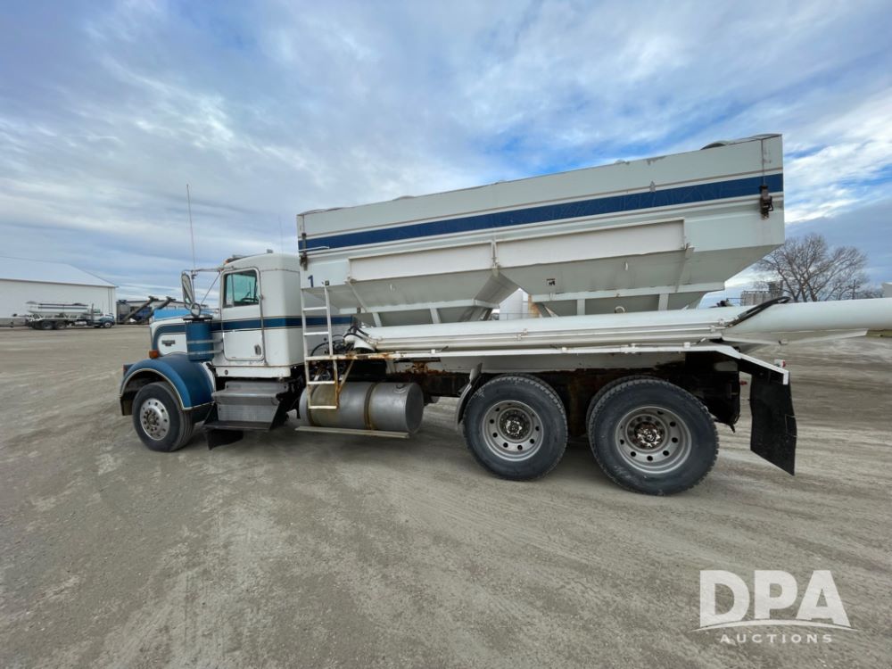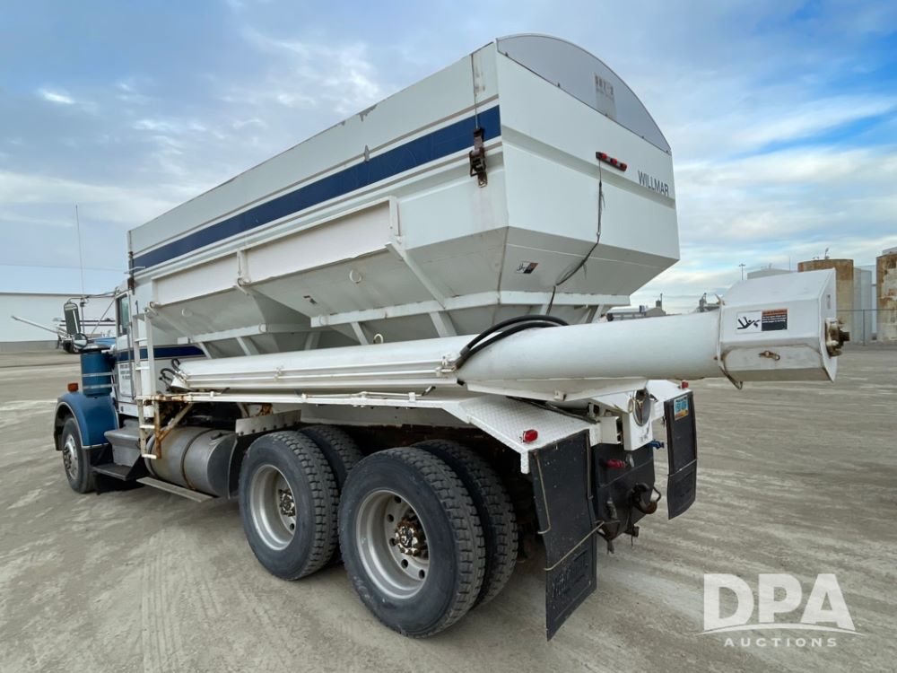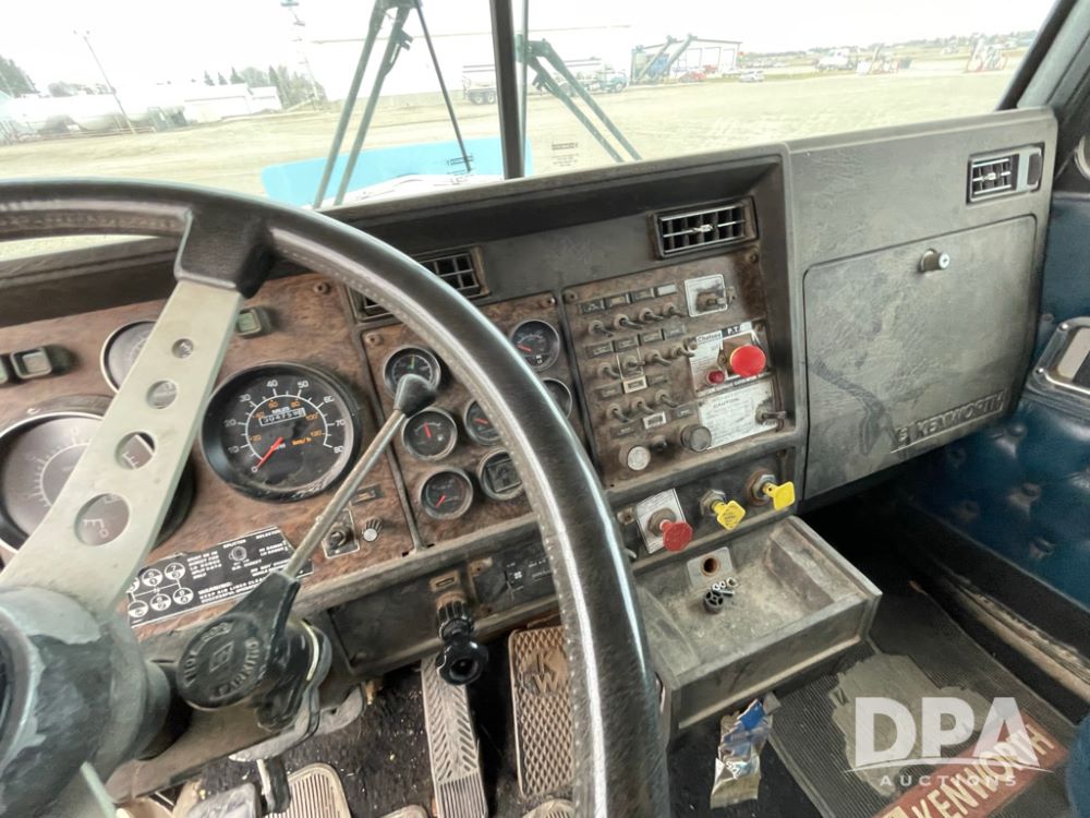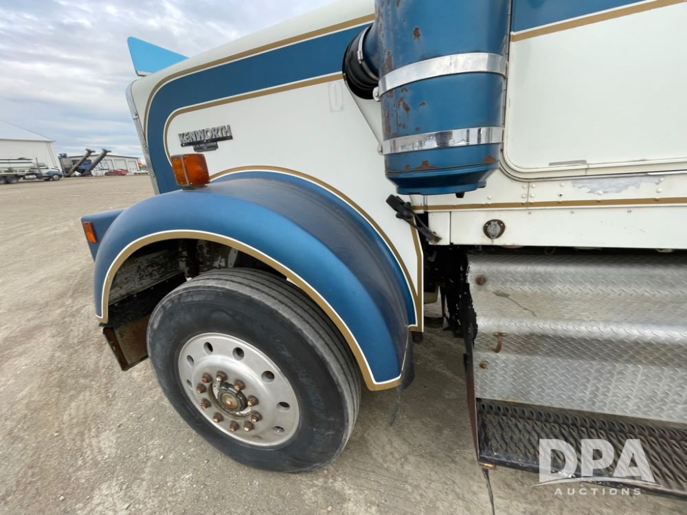 1985 Kenworth W900 Dry Tender Truck (LLD1597, Unit 1), Caterpillar diesel engine, Eaton Fuller 9 speed transmission, AM/FM radio, air ride suspension, tandem axle, dual fuel tanks, Willmar 16 ton stainless steel dry tender box, side discharge auger, all hydraulic, electric roll tarp, 11/24.5 tires, aluminum and steel rims, shows 4,759 miles (truck has turned over on mile meter).