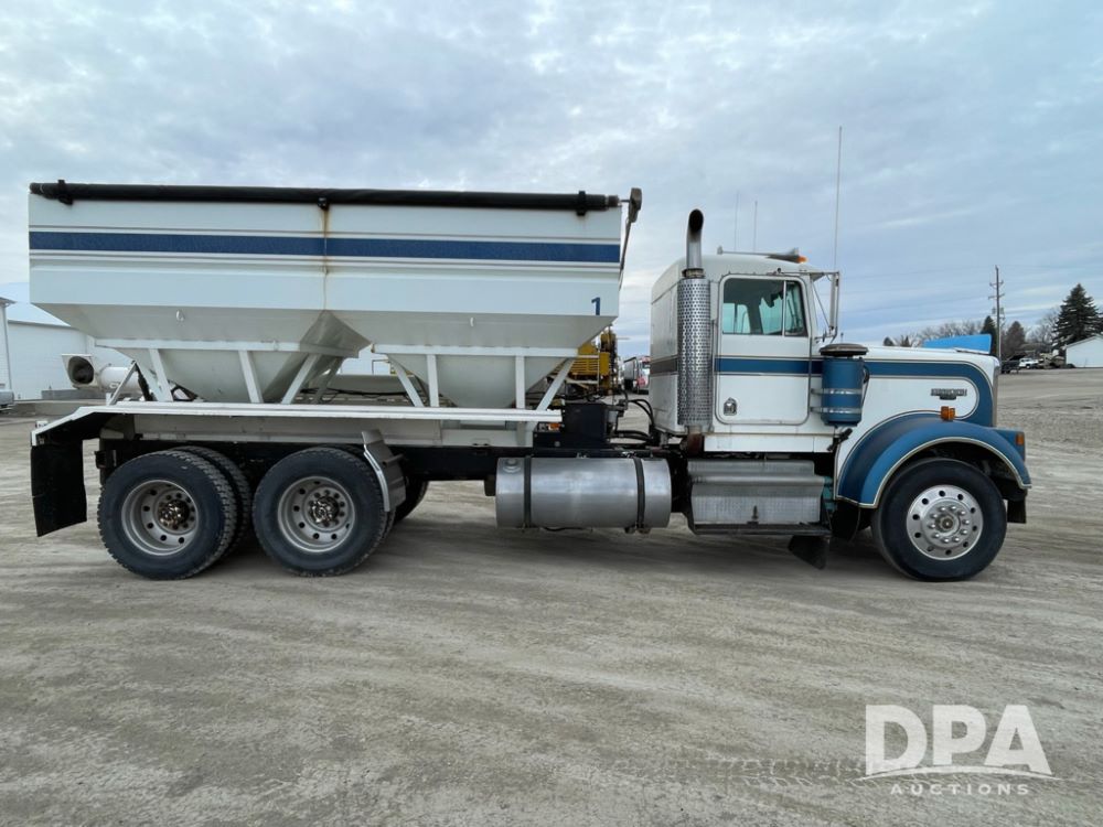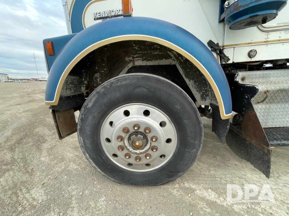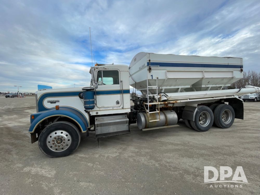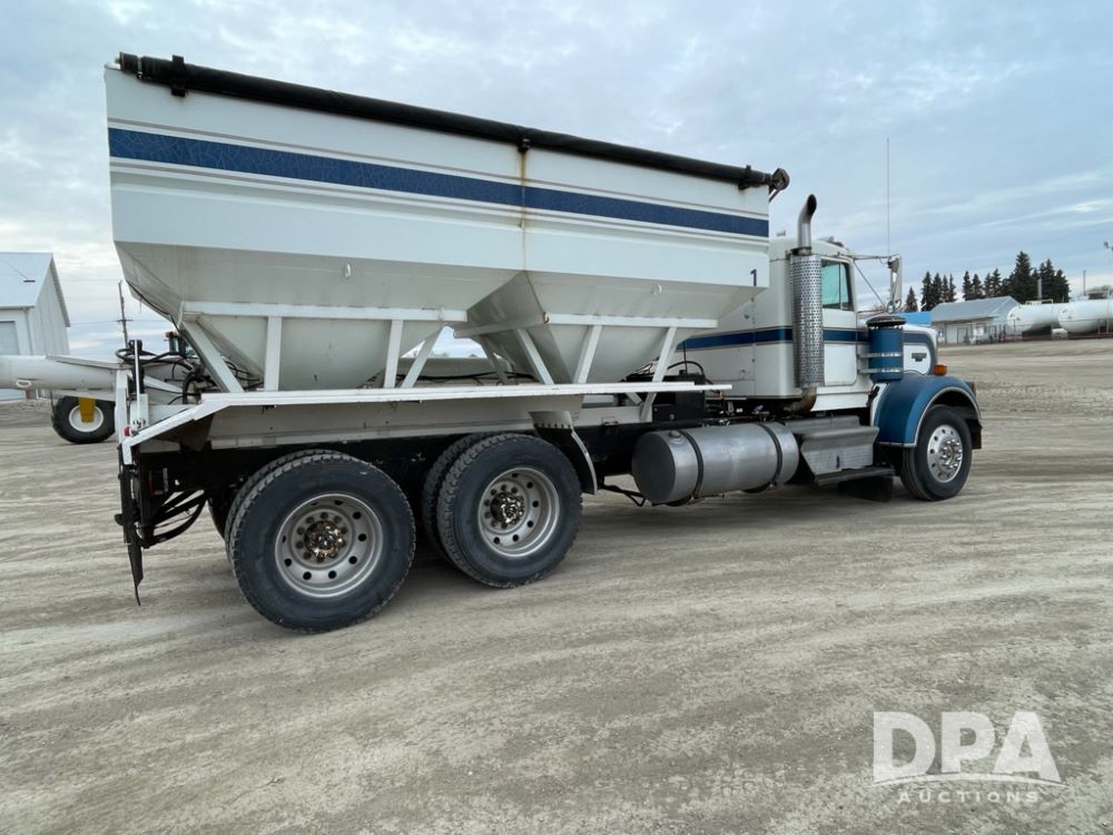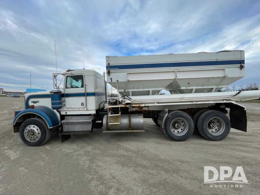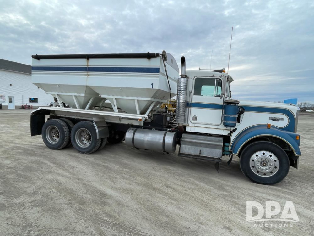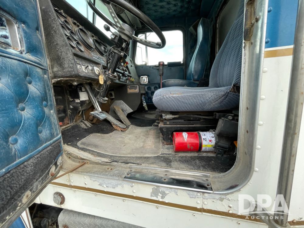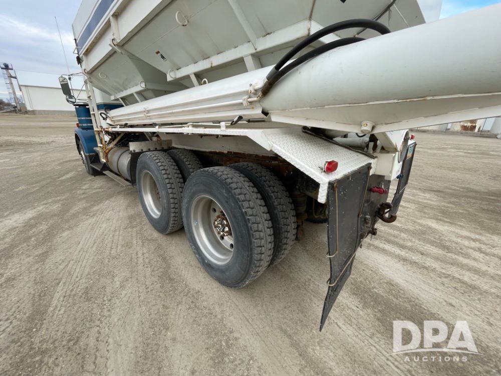 1985 Kenworth W900 Dry Tender Truck (LLD1597, Unit 1), Caterpillar diesel engine, Eaton Fuller 9 speed transmission, AM/FM radio, air ride suspension, tandem axle, dual fuel tanks, Willmar 16 ton stainless steel dry tender box, side discharge auger, all hydraulic, electric roll tarp, 11/24.5 tires, aluminum and steel rims, shows 4,759 miles (truck has turned over on mile meter).