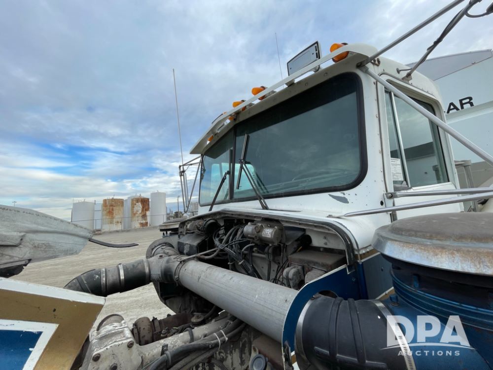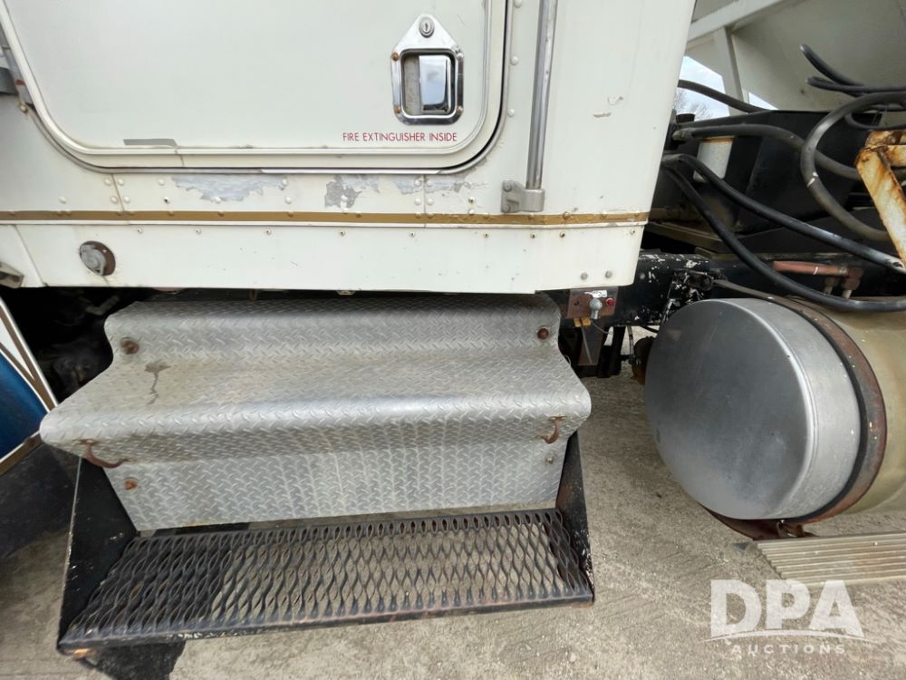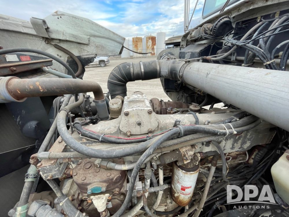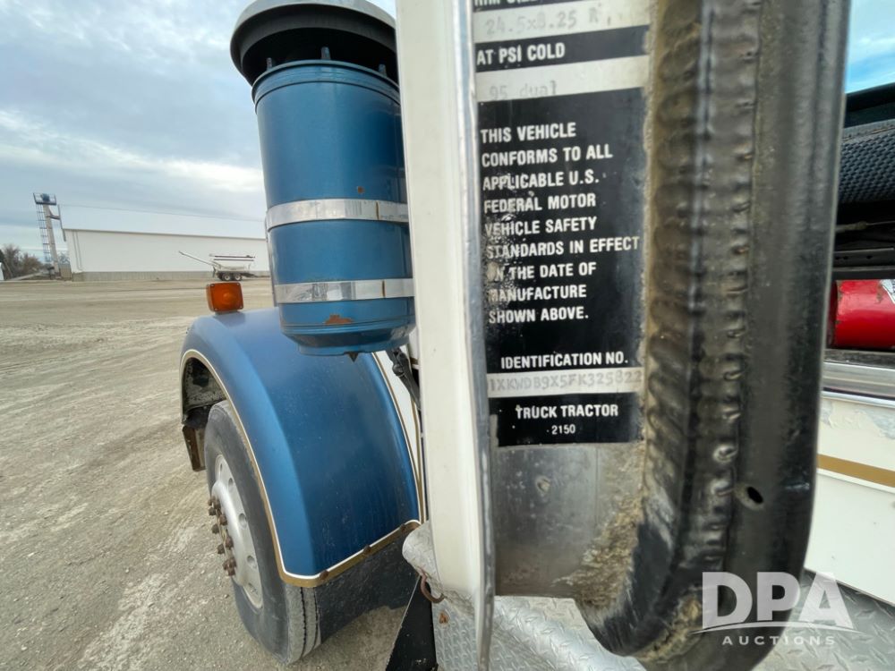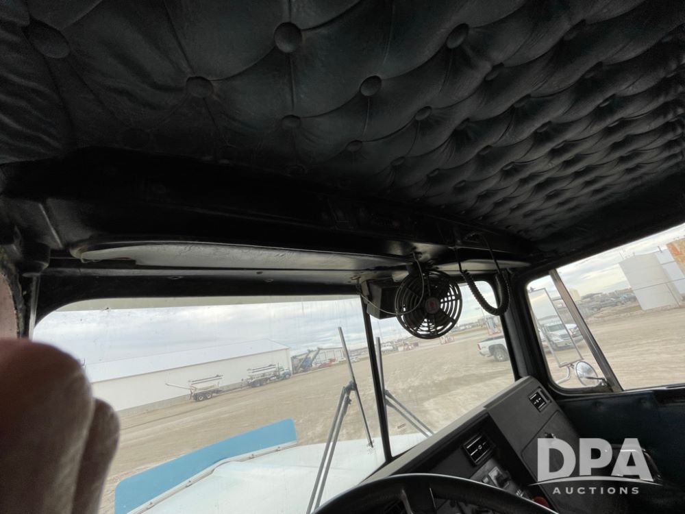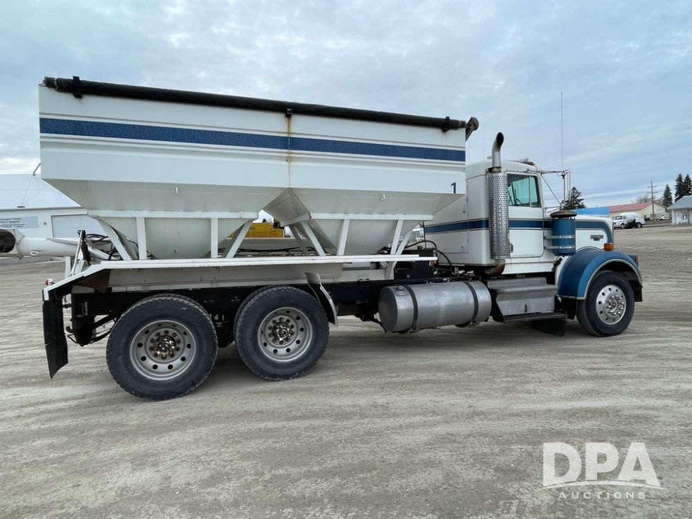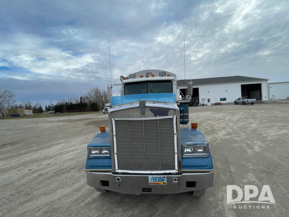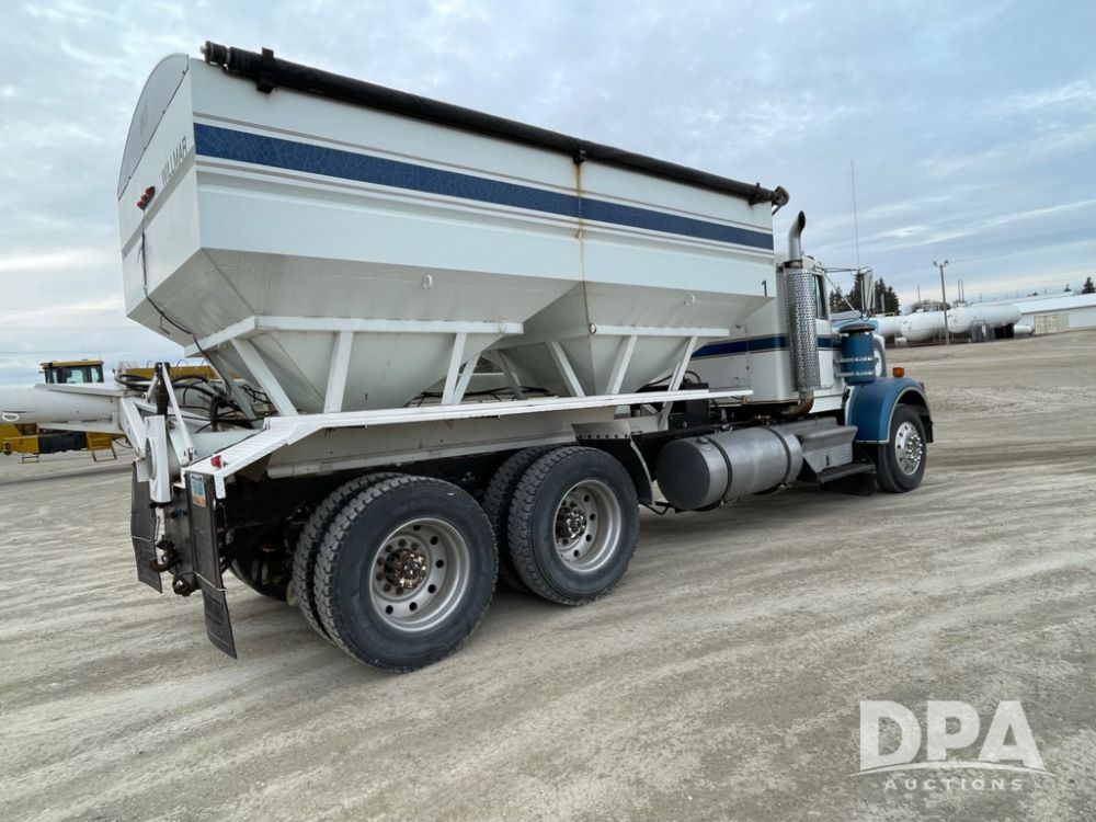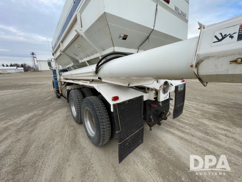 1985 Kenworth W900 Dry Tender Truck (LLD1597, Unit 1), Caterpillar diesel engine, Eaton Fuller 9 speed transmission, AM/FM radio, air ride suspension, tandem axle, dual fuel tanks, Willmar 16 ton stainless steel dry tender box, side discharge auger, all hydraulic, electric roll tarp, 11/24.5 tires, aluminum and steel rims, shows 4,759 miles (truck has turned over on mile meter).