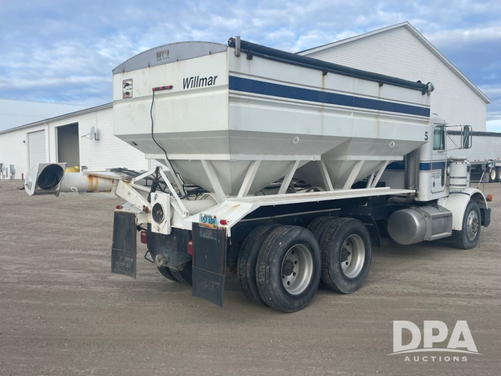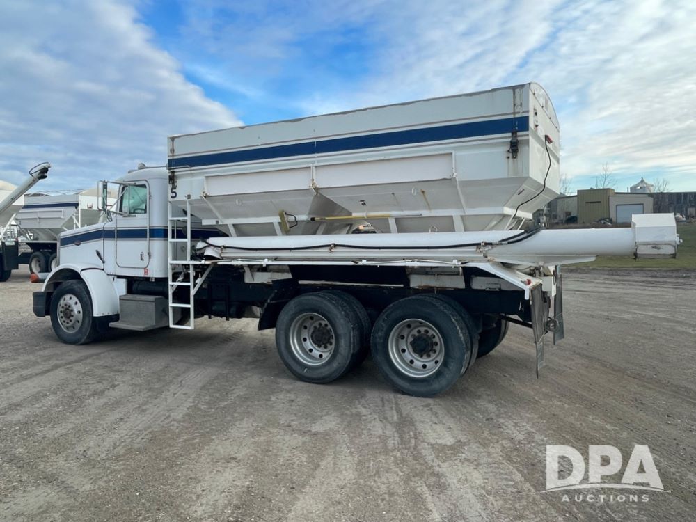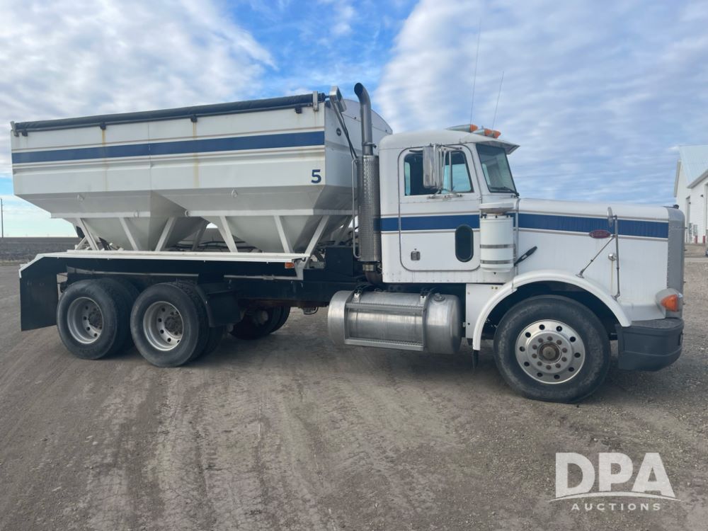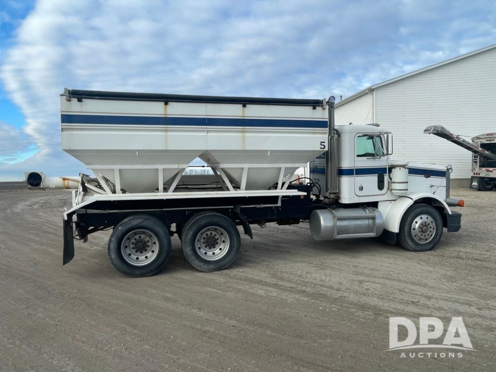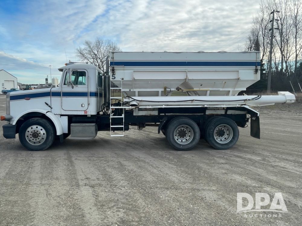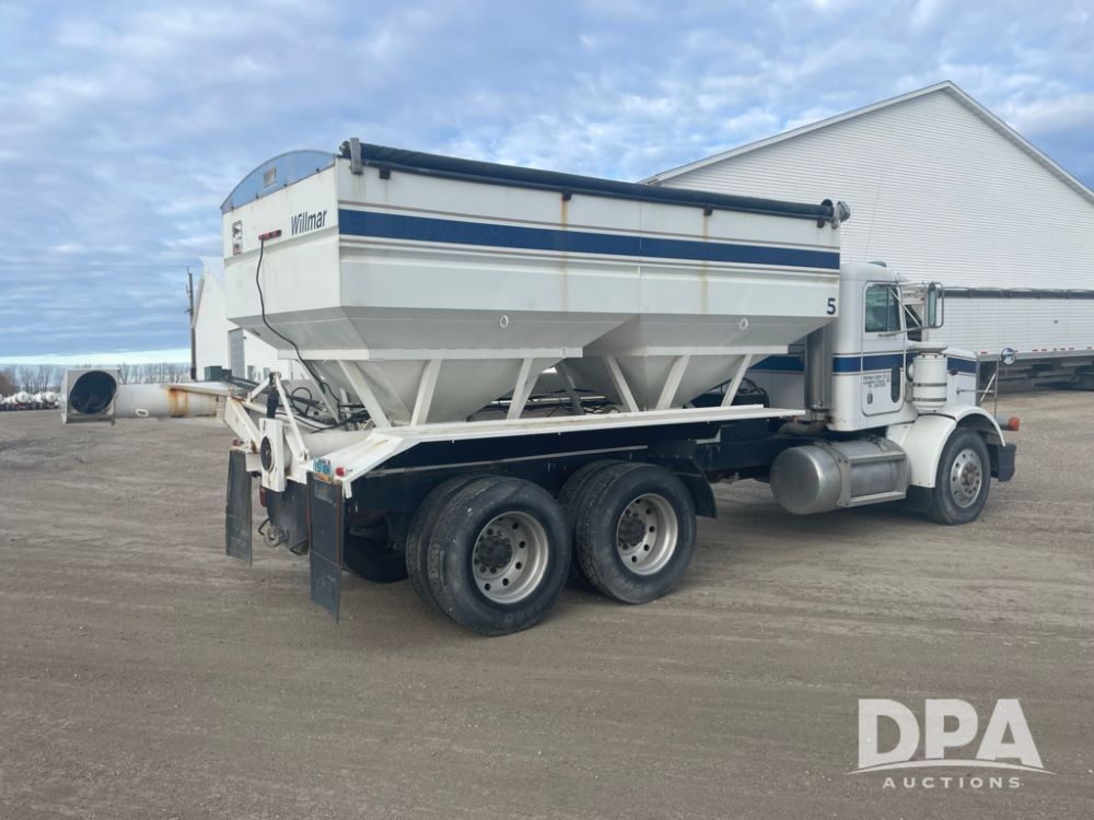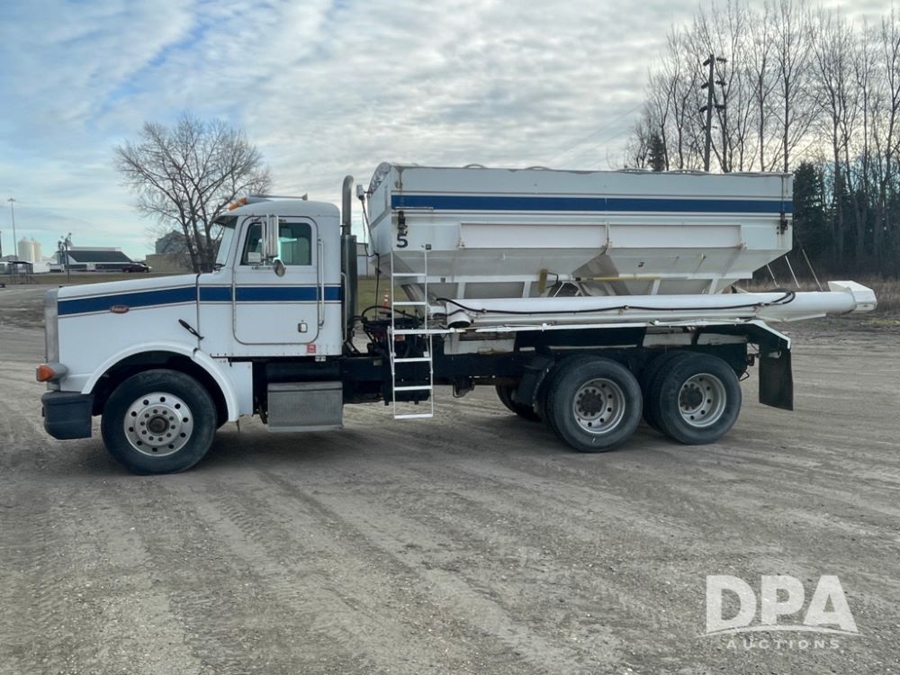 1988 Peterbilt 378 Dry Tender Truck (LLD1601, Unit 5), Cummins ISL diesel engine, Eaton fuller 9 speed transmission, AM/FM radio, heat, tandem axle, Willmar 16 ton stainless steel dry tender box, side discharge auger, all hydraulic, electric roll tarp, 11/24.5 tires with aluminum rims, shows 238,567 miles.
