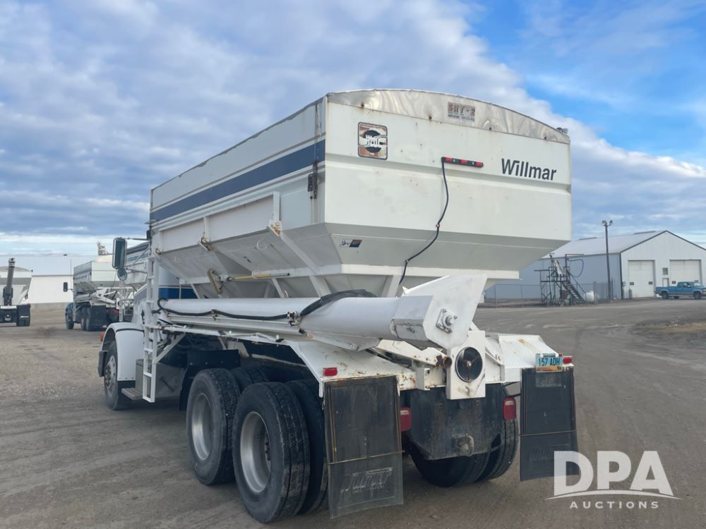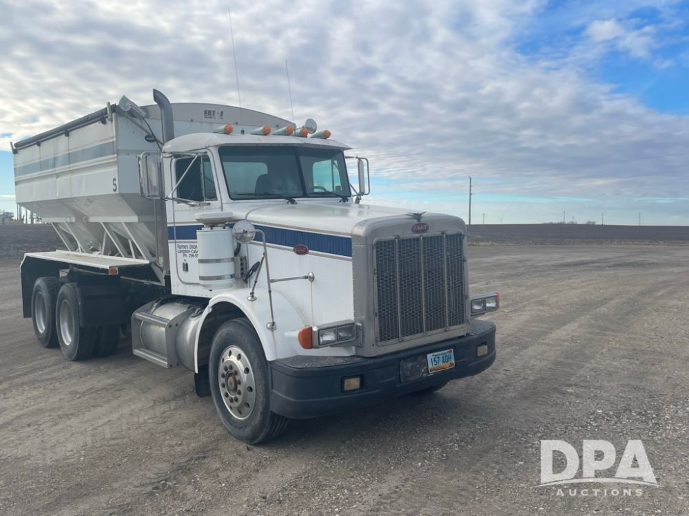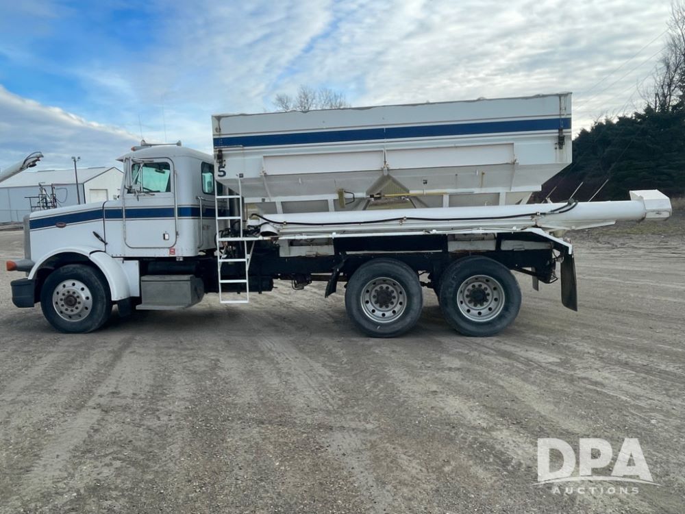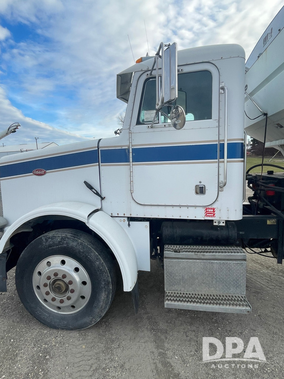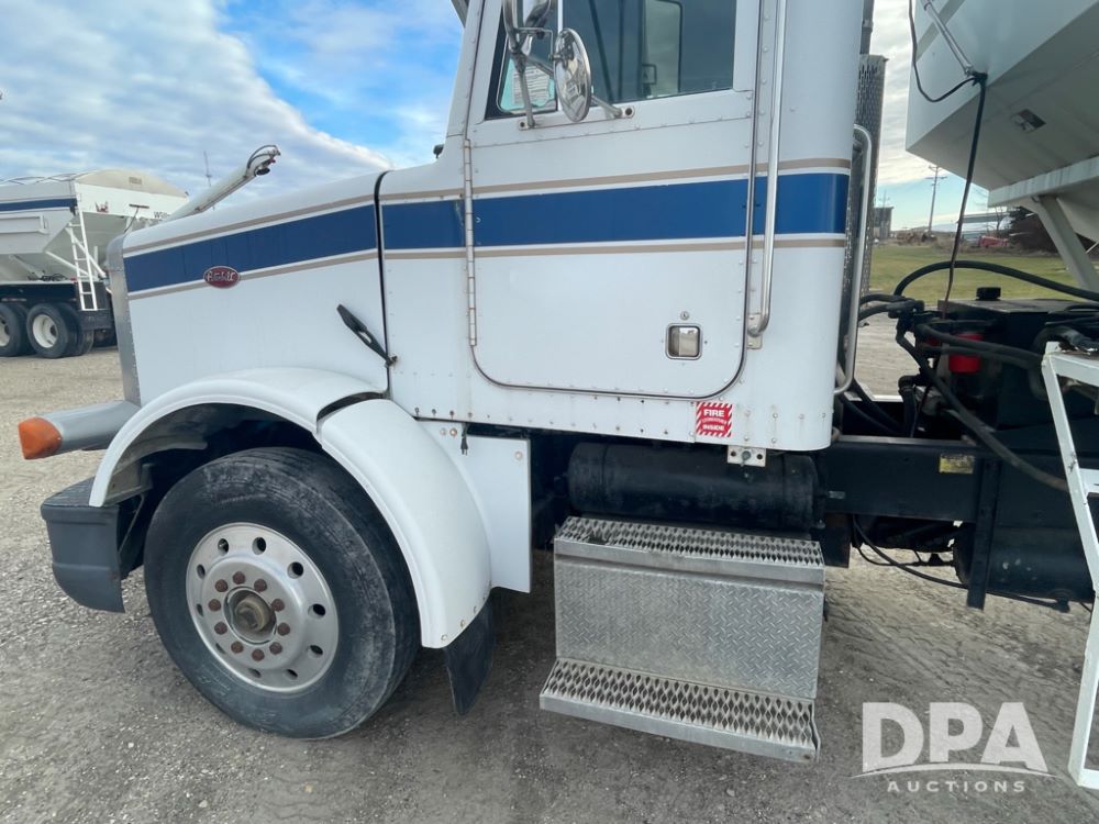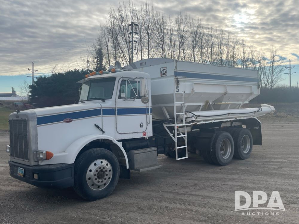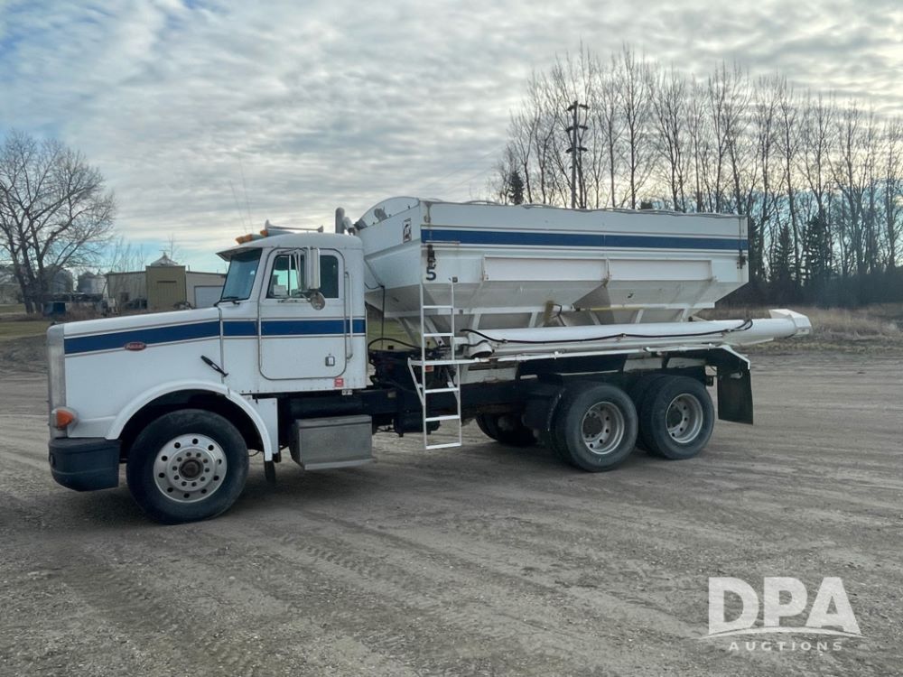 1988 Peterbilt 378 Dry Tender Truck (LLD1601, Unit 5), Cummins ISL diesel engine, Eaton fuller 9 speed transmission, AM/FM radio, heat, tandem axle, Willmar 16 ton stainless steel dry tender box, side discharge auger, all hydraulic, electric roll tarp, 11/24.5 tires with aluminum rims, shows 238,567 miles.