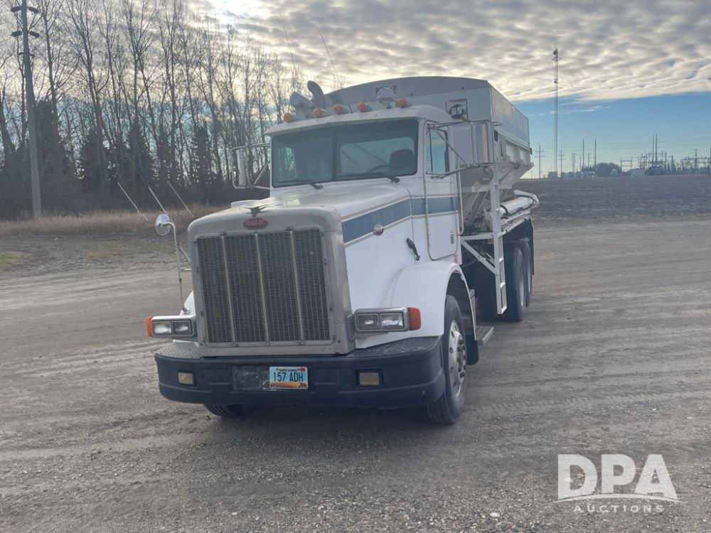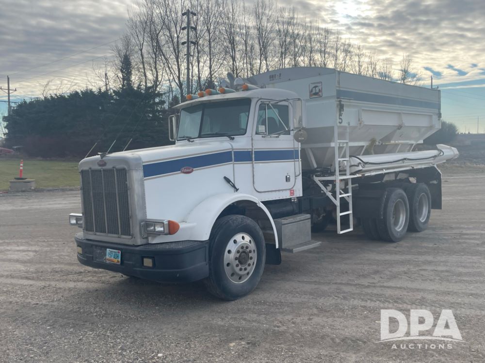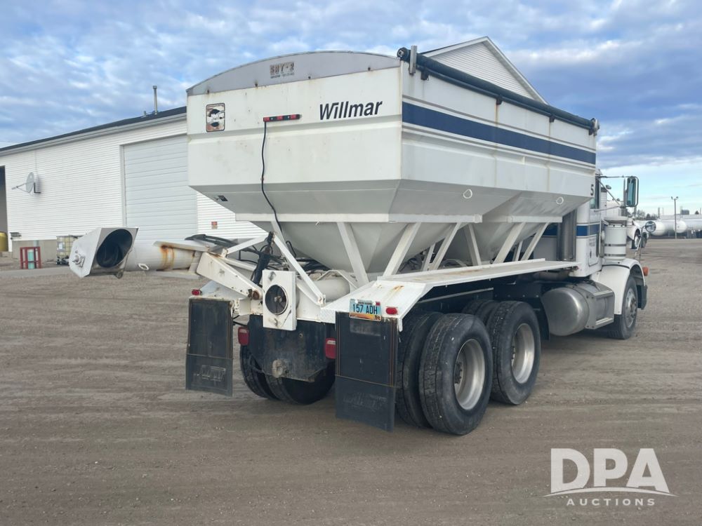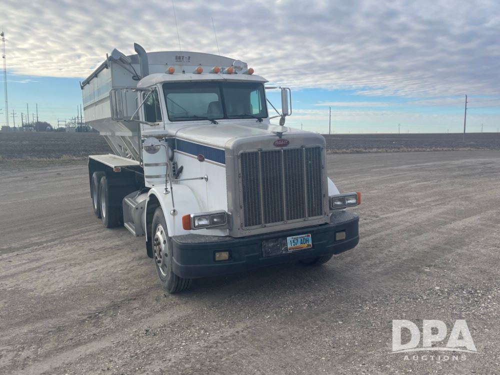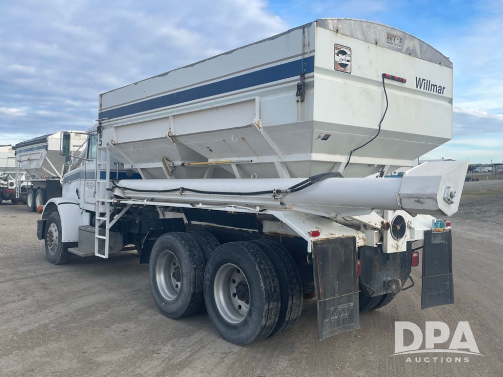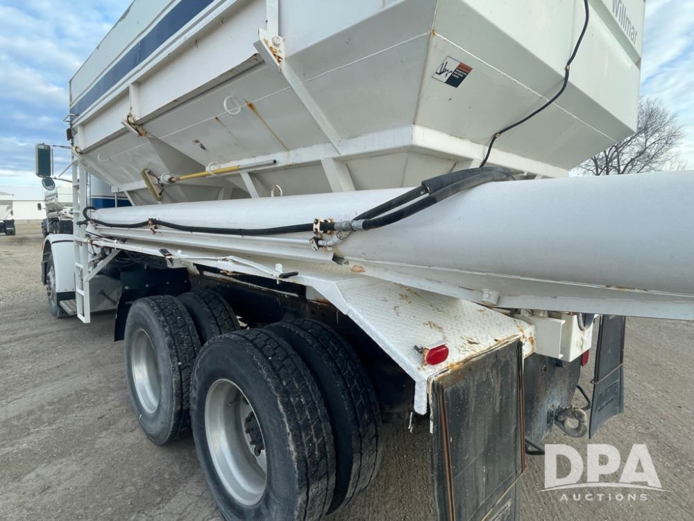 1988 Peterbilt 378 Dry Tender Truck (LLD1601, Unit 5), Cummins ISL diesel engine, Eaton fuller 9 speed transmission, AM/FM radio, heat, tandem axle, Willmar 16 ton stainless steel dry tender box, side discharge auger, all hydraulic, electric roll tarp, 11/24.5 tires with aluminum rims, shows 238,567 miles.