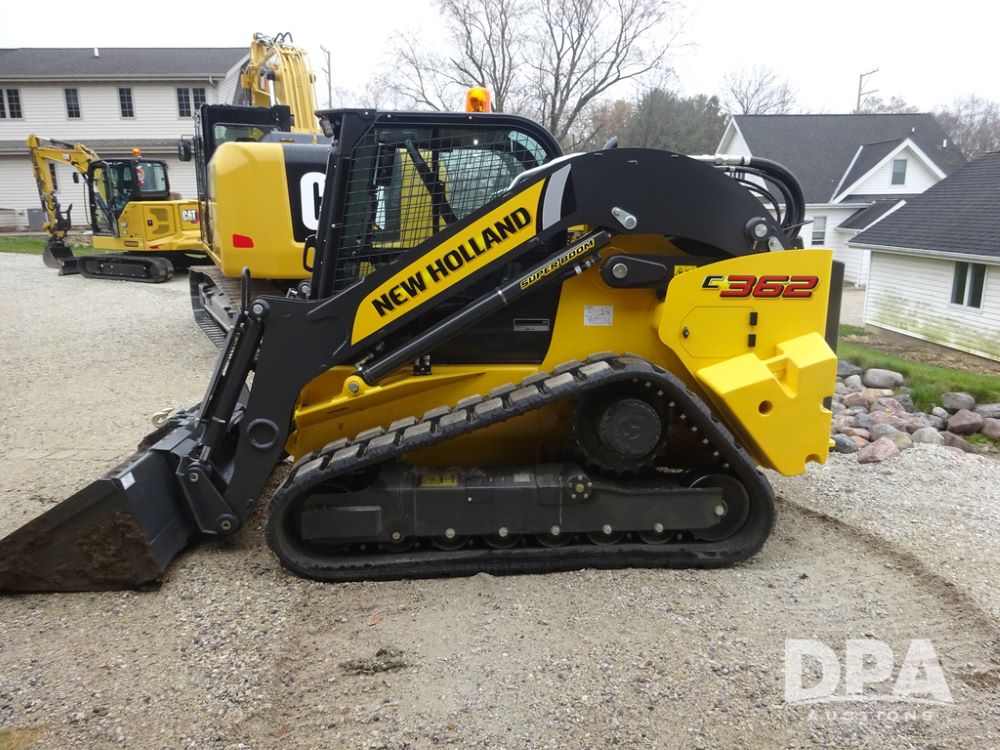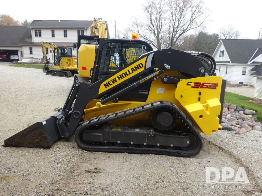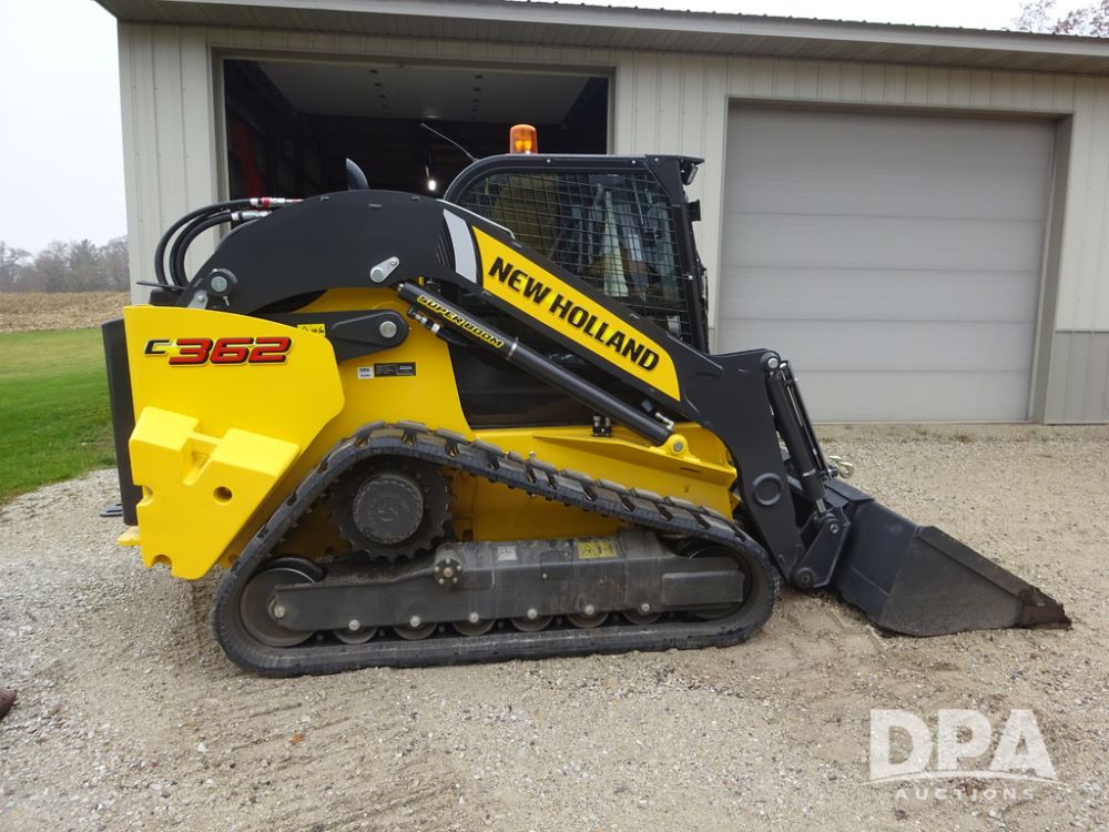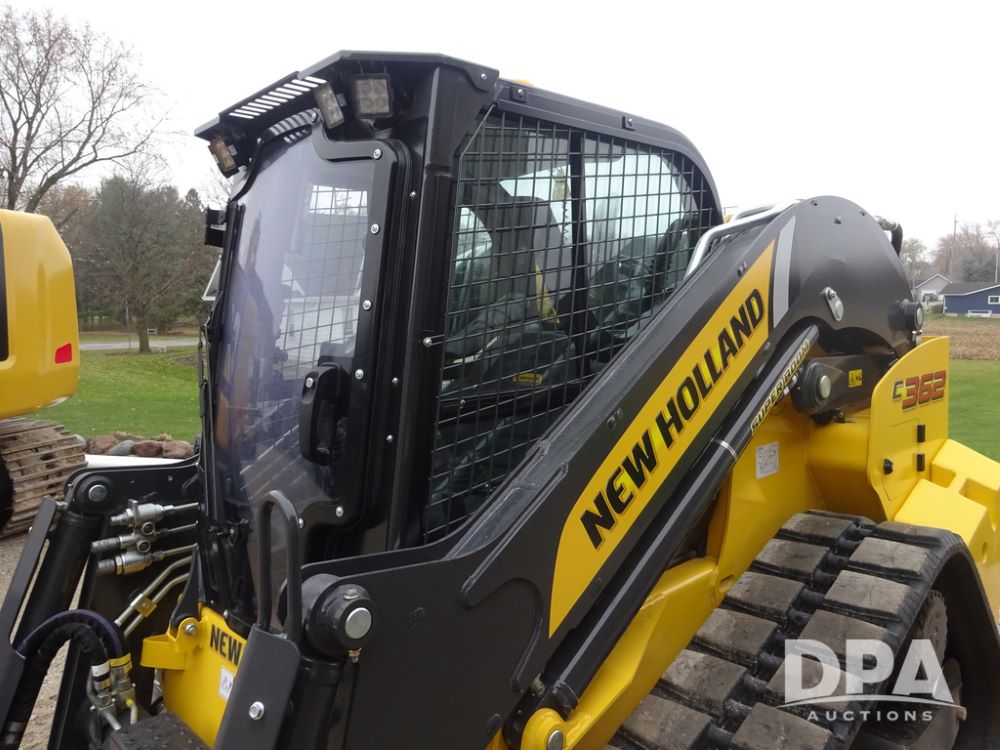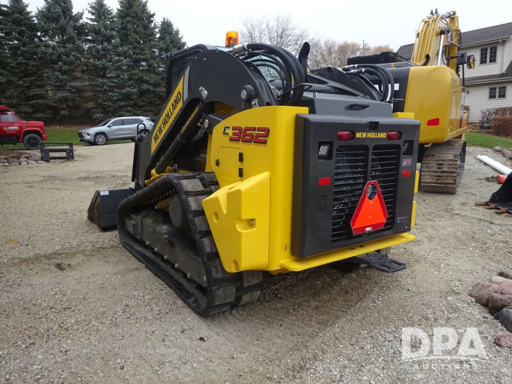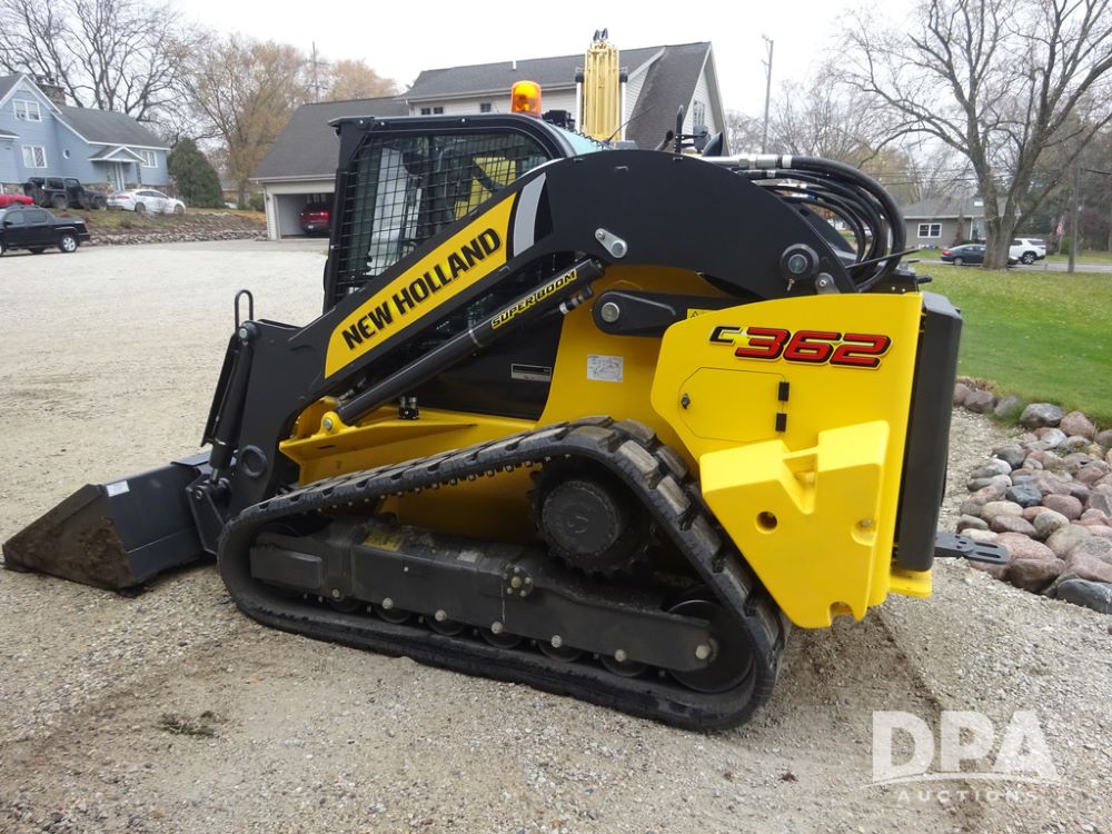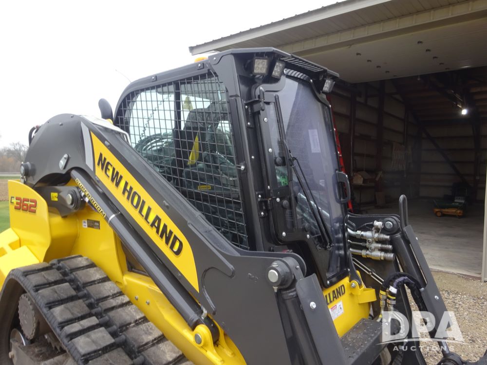 2025 New Holland C362 Skid Steer (PZ14194), diesel engine, hydrostatic transmission, cab, lights, air conditioning, heat, Am/Fm radio, rear backup camera, beacon light, 84" bucket, auxiliary hydraulics, Super Boom, HXD450X86X63 HBBC tracks, shows 49 hours.