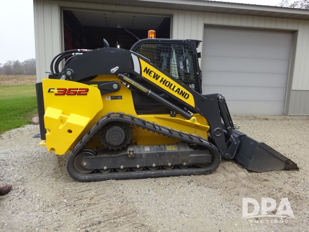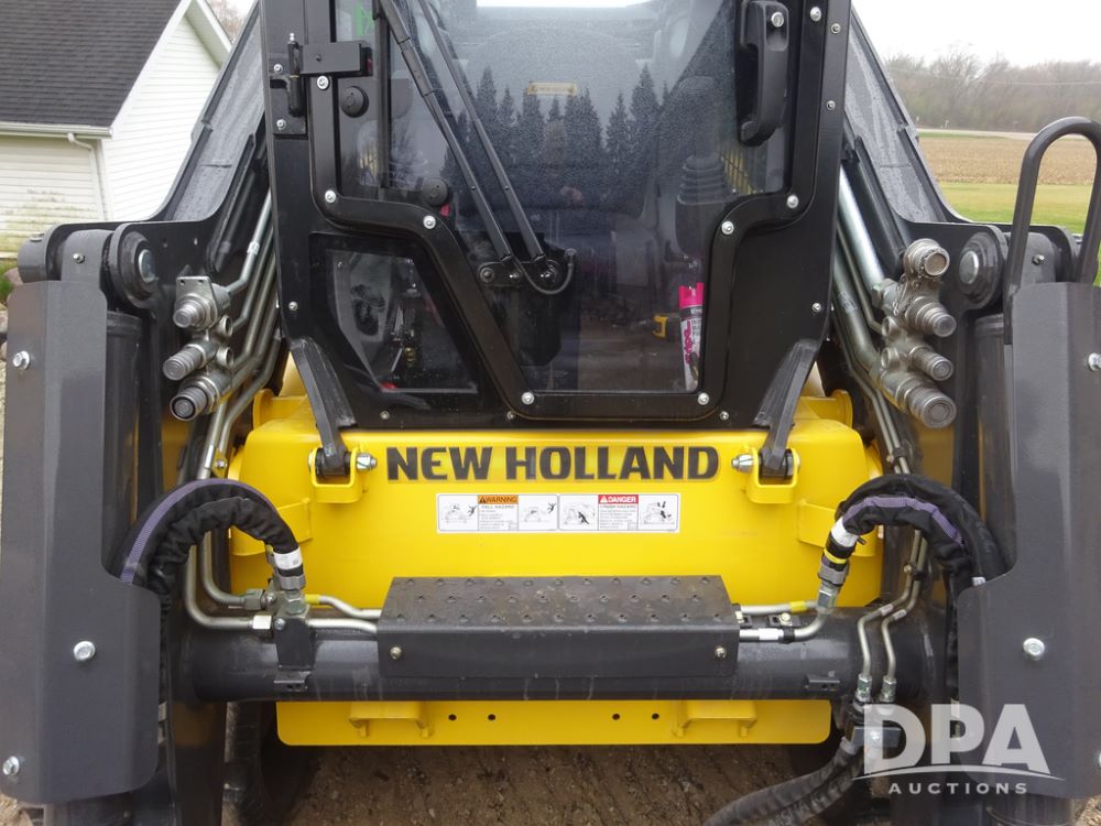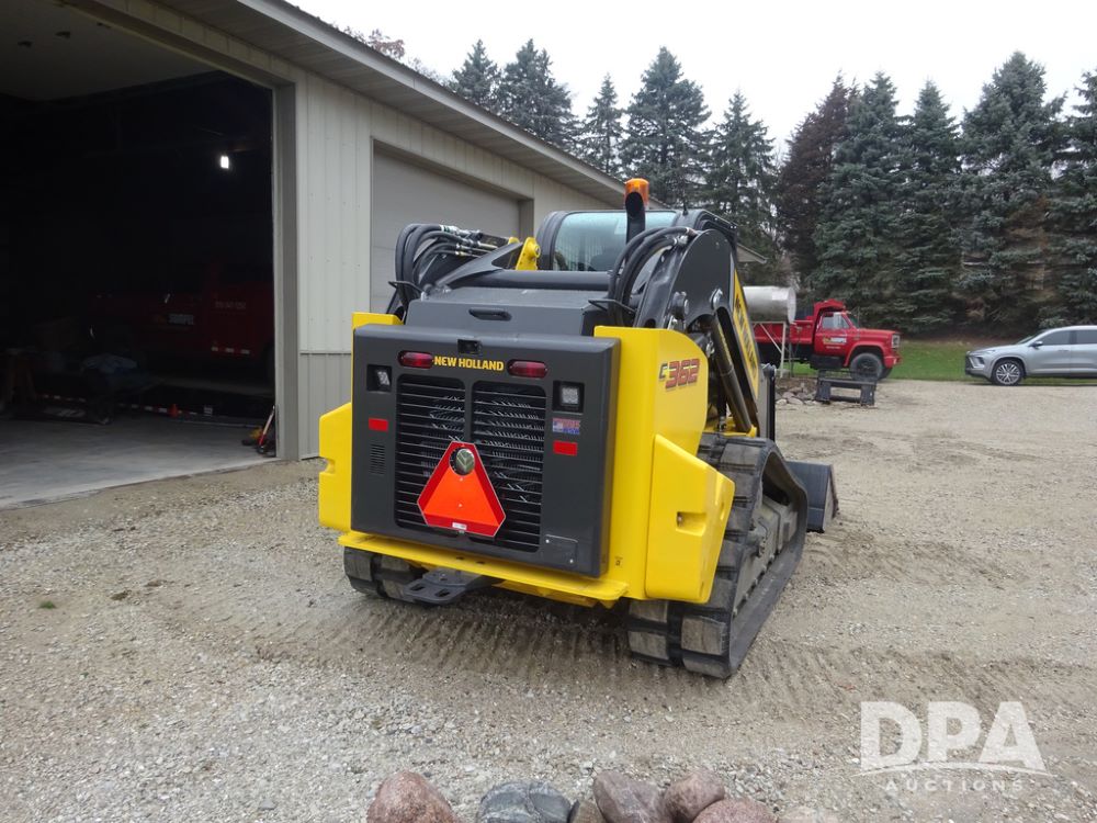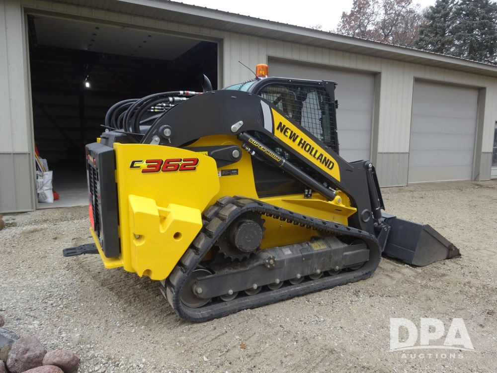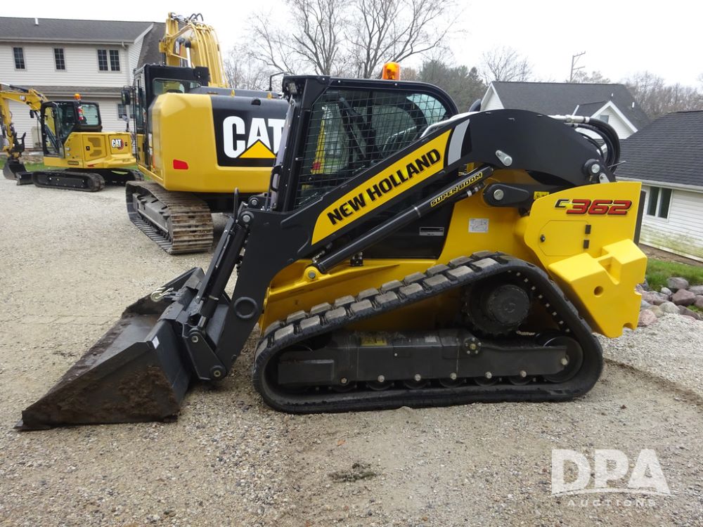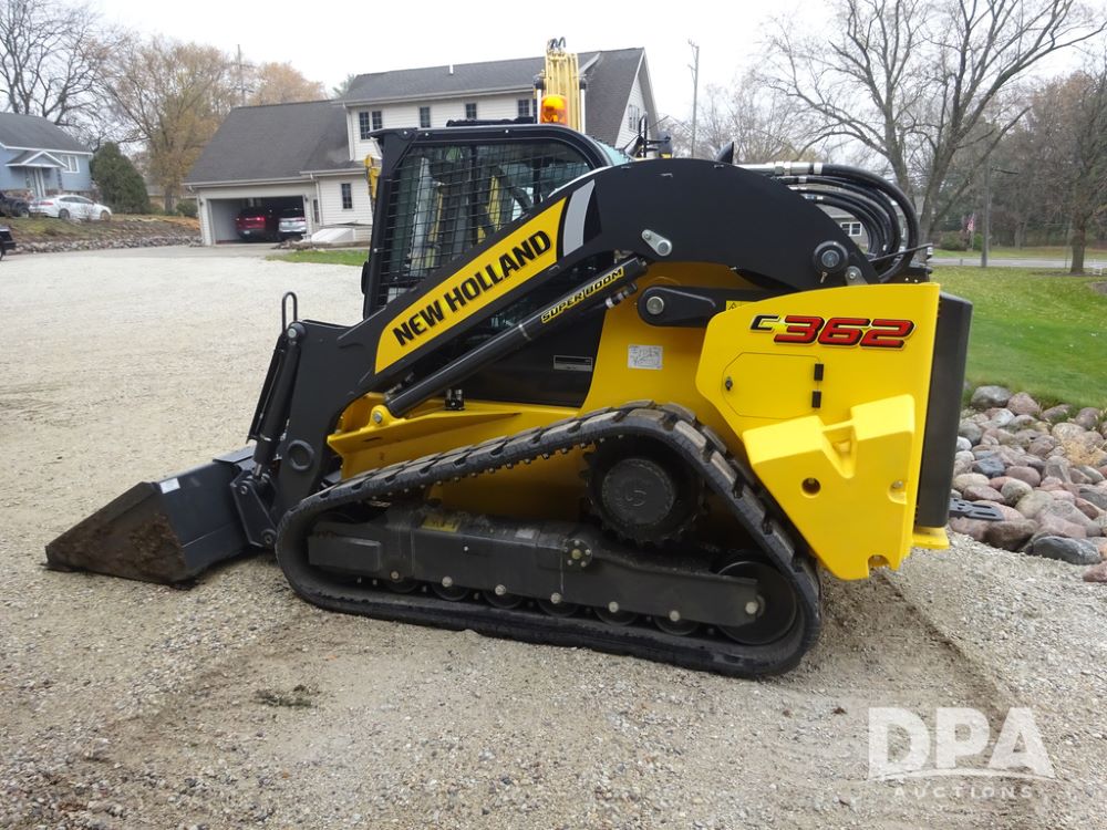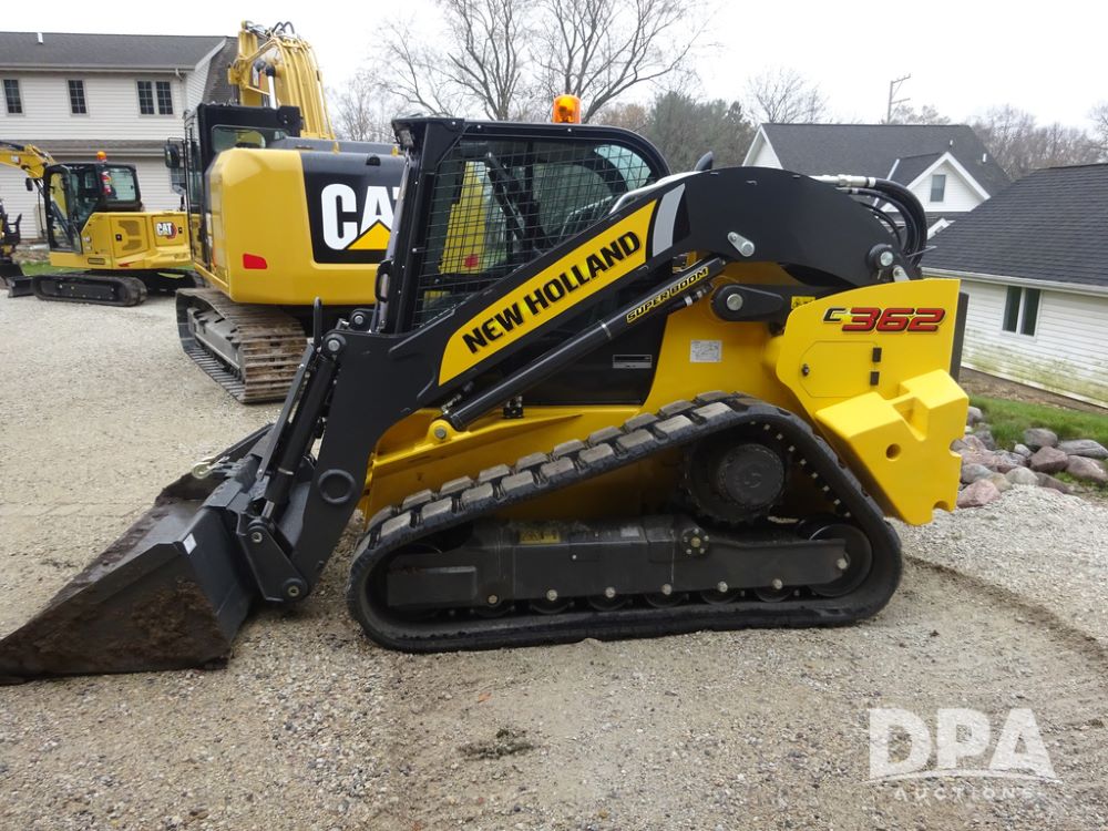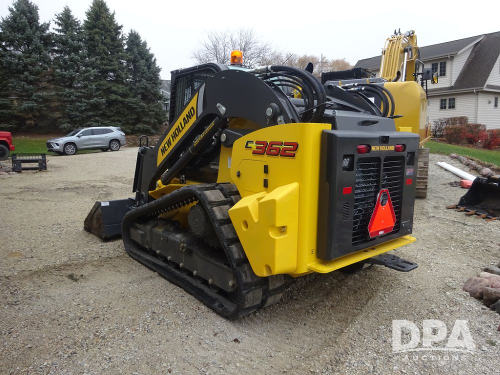 2025 New Holland C362 Skid Steer (PZ14194), diesel engine, hydrostatic transmission, cab, lights, air conditioning, heat, Am/Fm radio, rear backup camera, beacon light, 84" bucket, auxiliary hydraulics, Super Boom, HXD450X86X63 HBBC tracks, shows 49 hours.