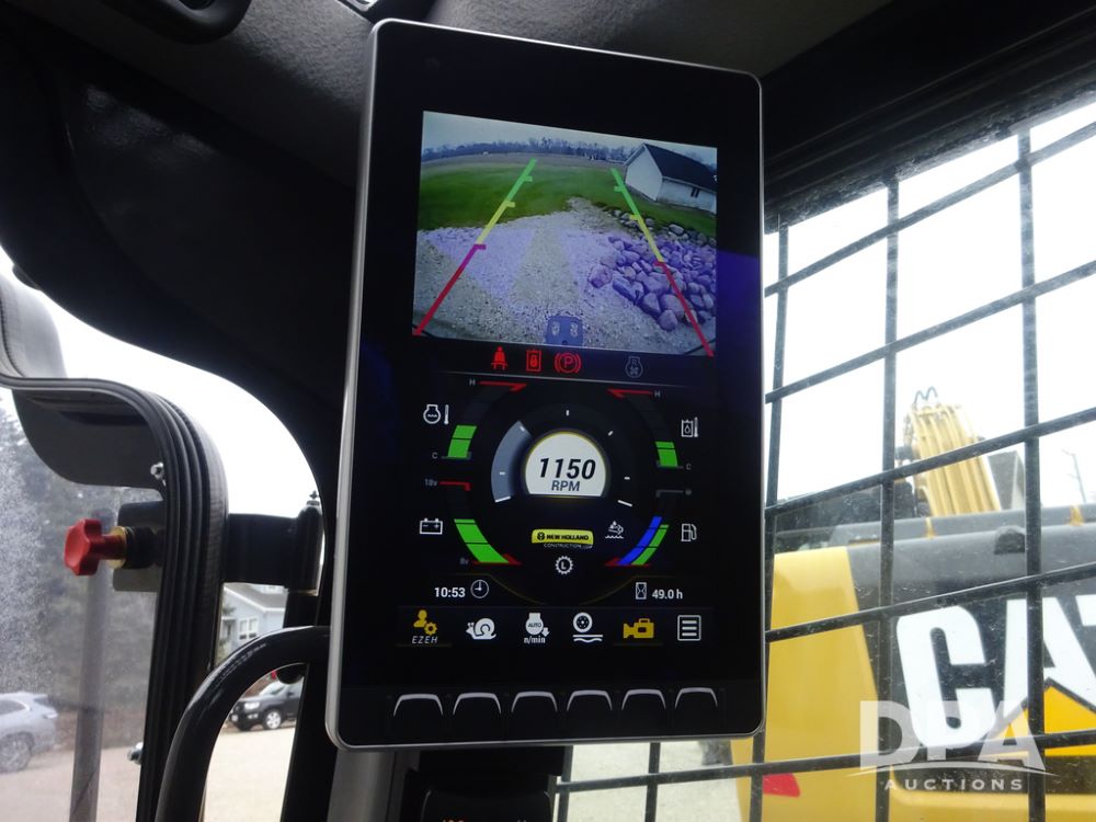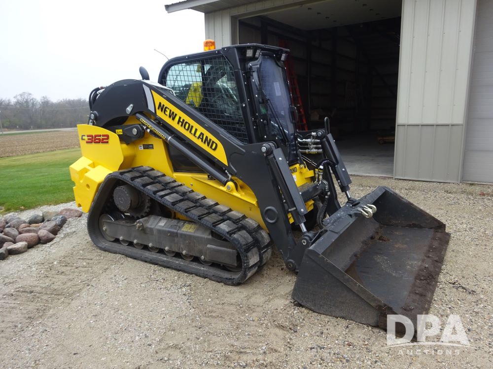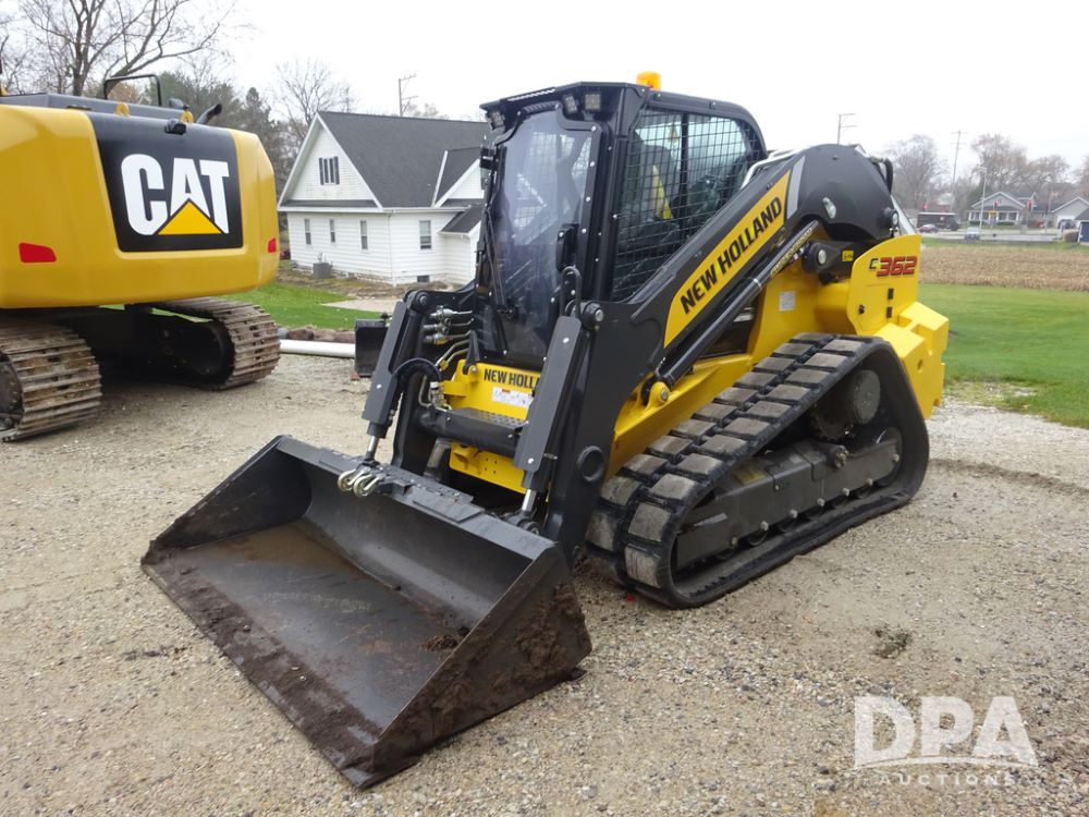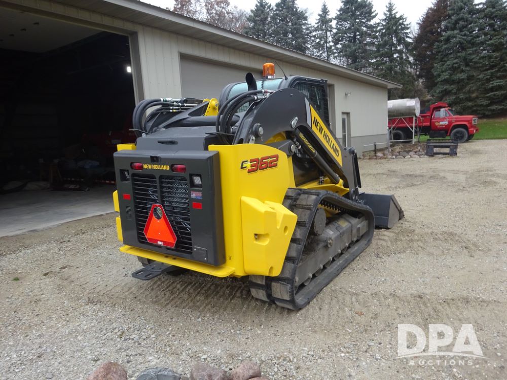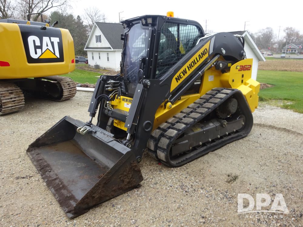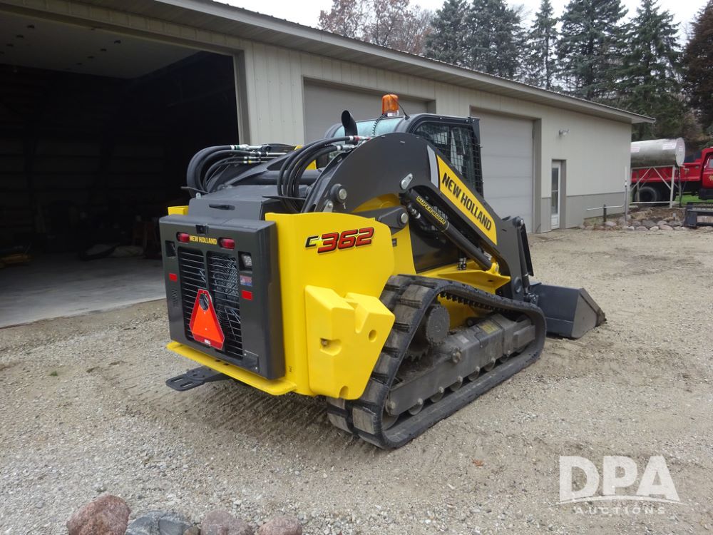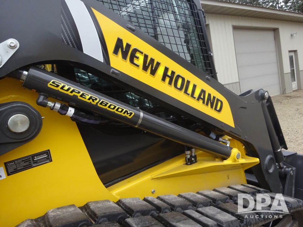 2025 New Holland C362 Skid Steer (PZ14194), diesel engine, hydrostatic transmission, cab, lights, air conditioning, heat, Am/Fm radio, rear backup camera, beacon light, 84" bucket, auxiliary hydraulics, Super Boom, HXD450X86X63 HBBC tracks, shows 49 hours.