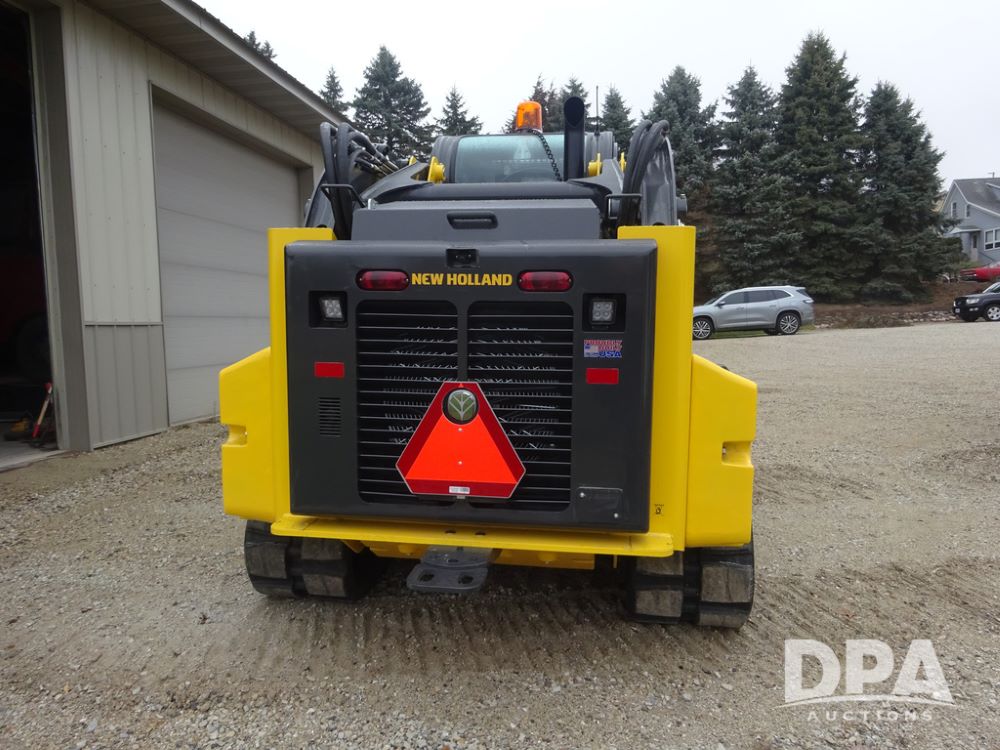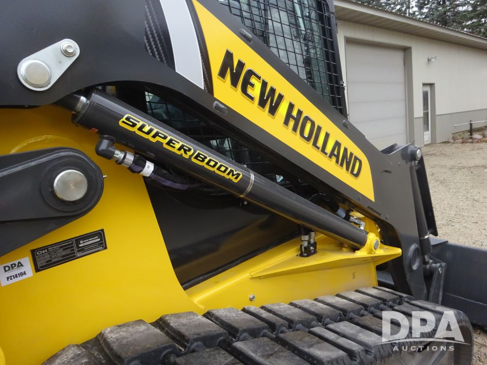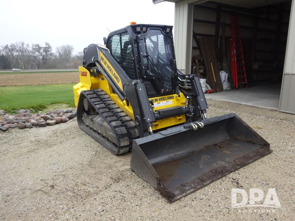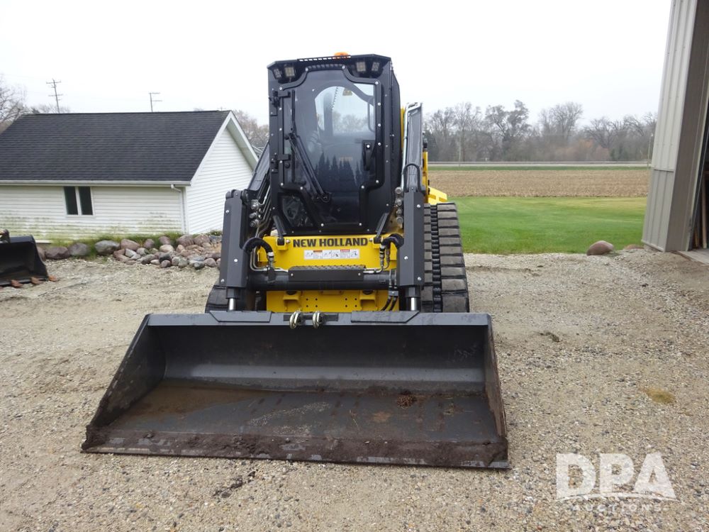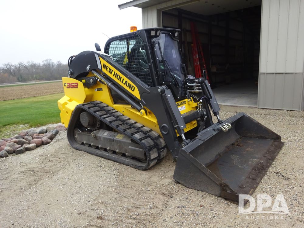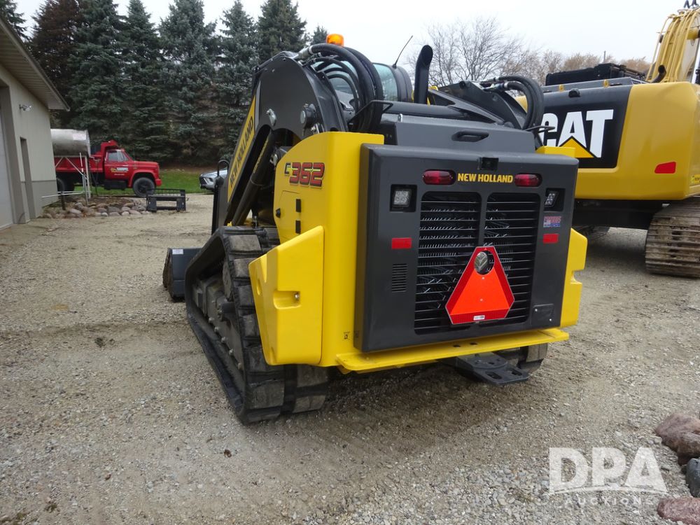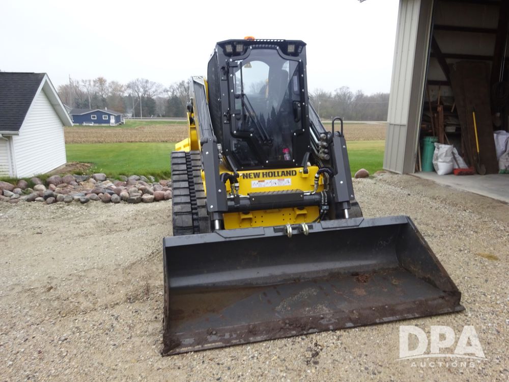2025 New Holland C362 Skid Steer (PZ14194), diesel engine, hydrostatic transmission, cab, lights, air conditioning, heat, Am/Fm radio, rear backup camera, beacon light, 84" bucket, auxiliary hydraulics, Super Boom, HXD450X86X63 HBBC tracks, shows 49 hours.