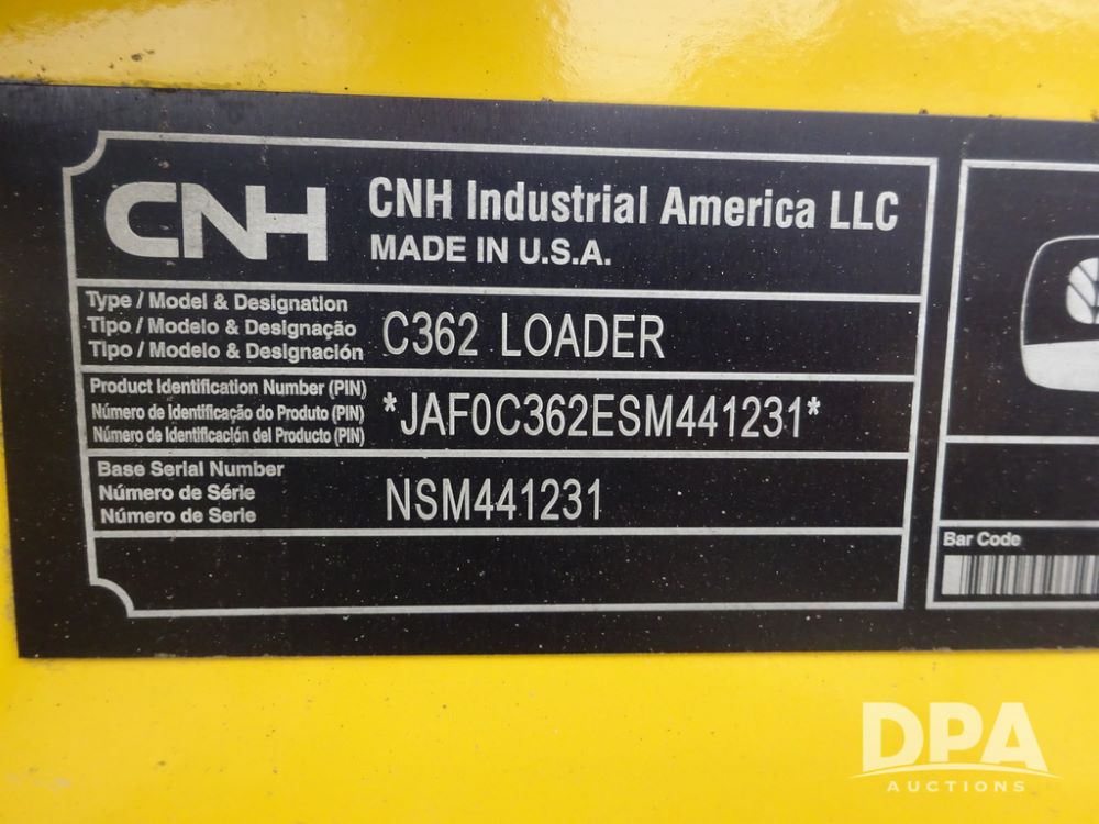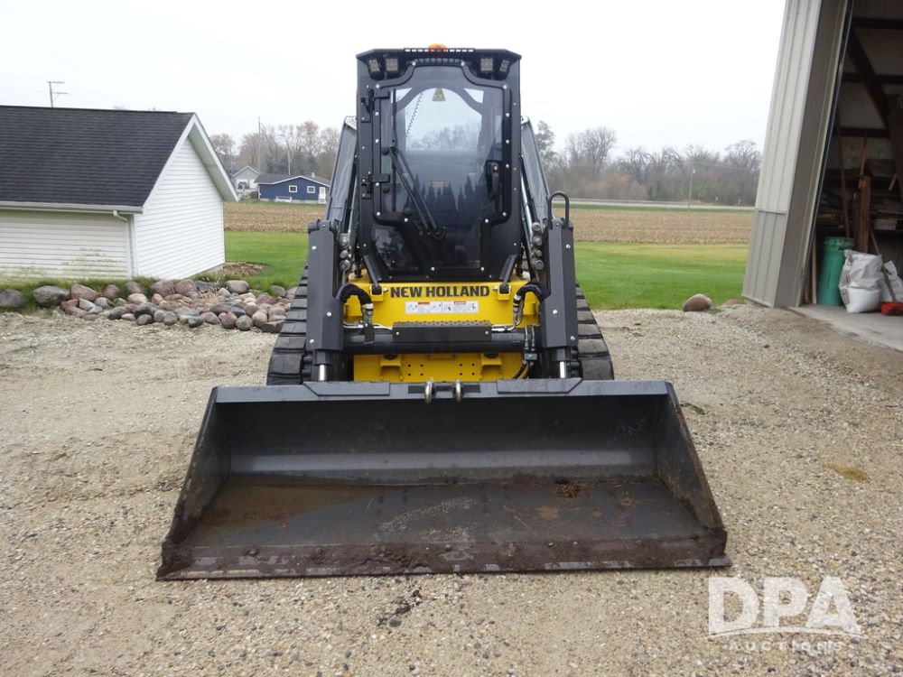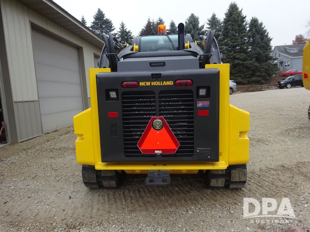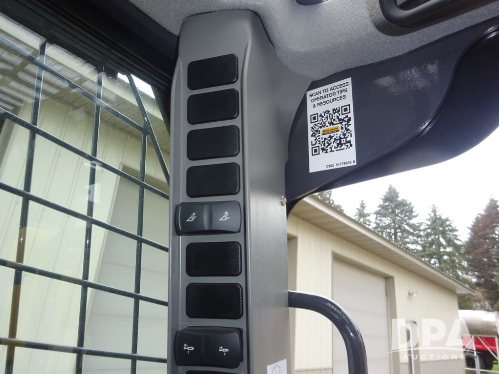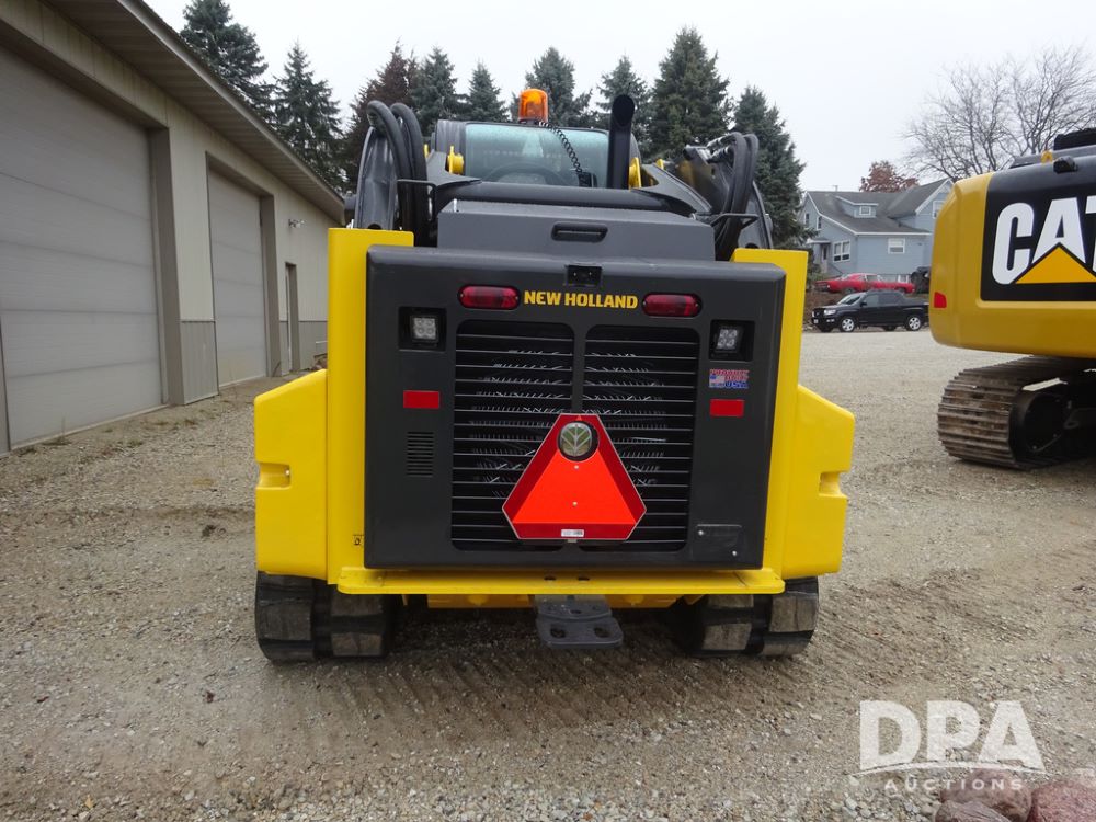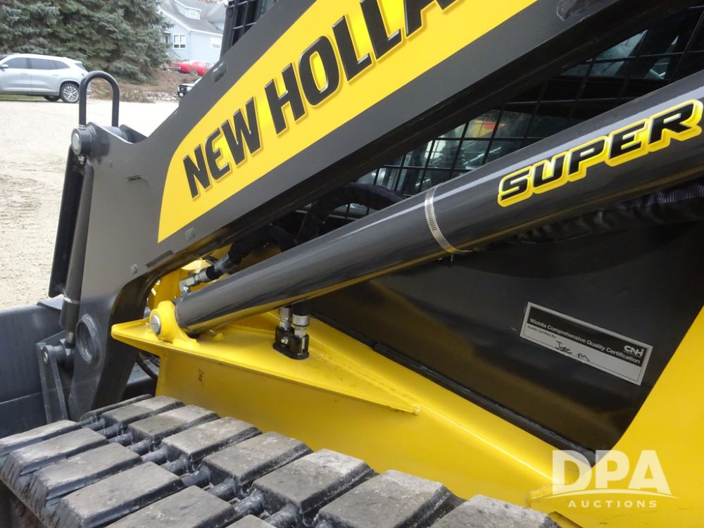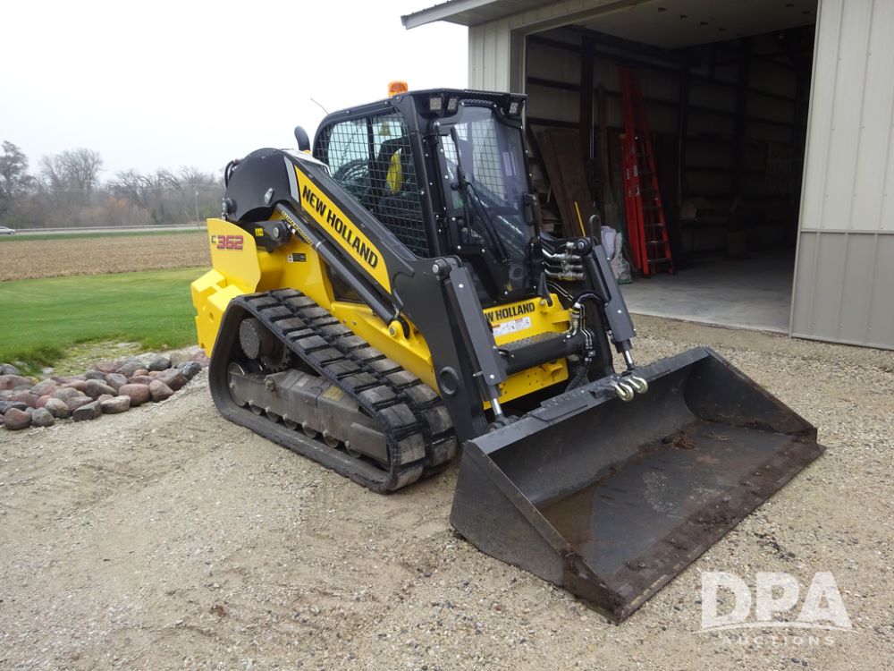 2025 New Holland C362 Skid Steer (PZ14194), diesel engine, hydrostatic transmission, cab, lights, air conditioning, heat, Am/Fm radio, rear backup camera, beacon light, 84" bucket, auxiliary hydraulics, Super Boom, HXD450X86X63 HBBC tracks, shows 49 hours.