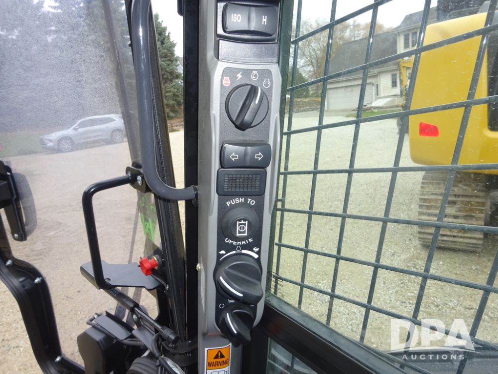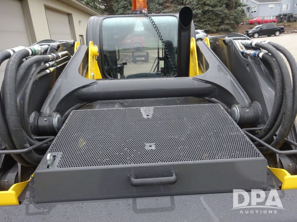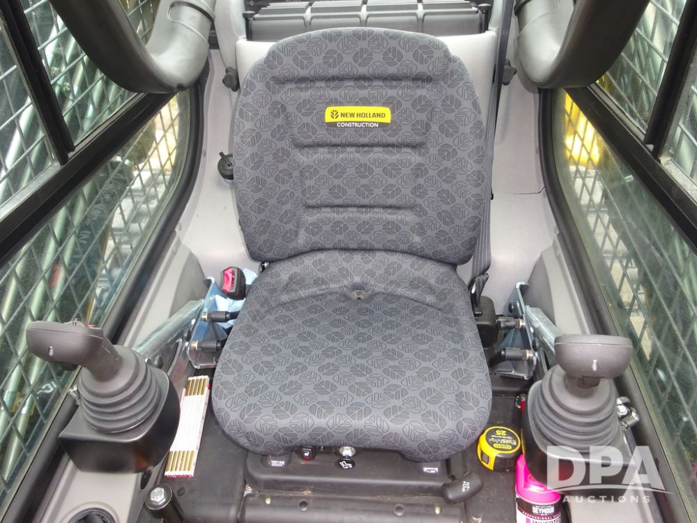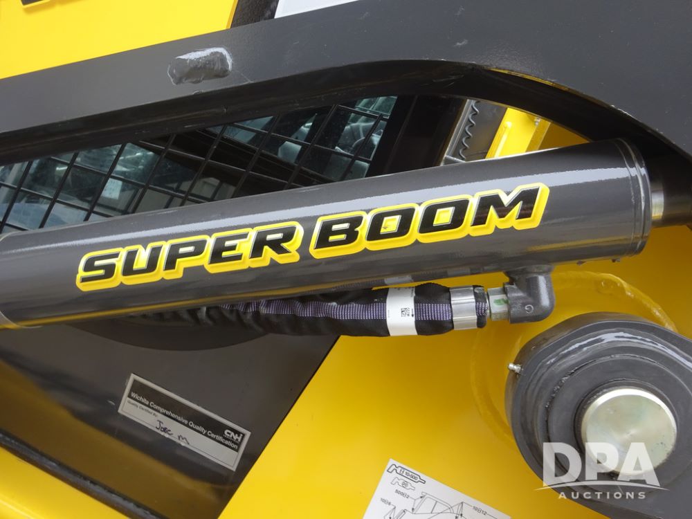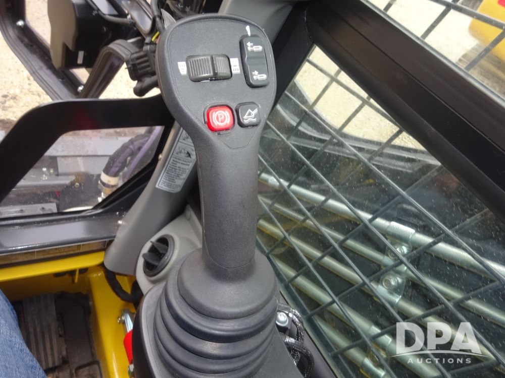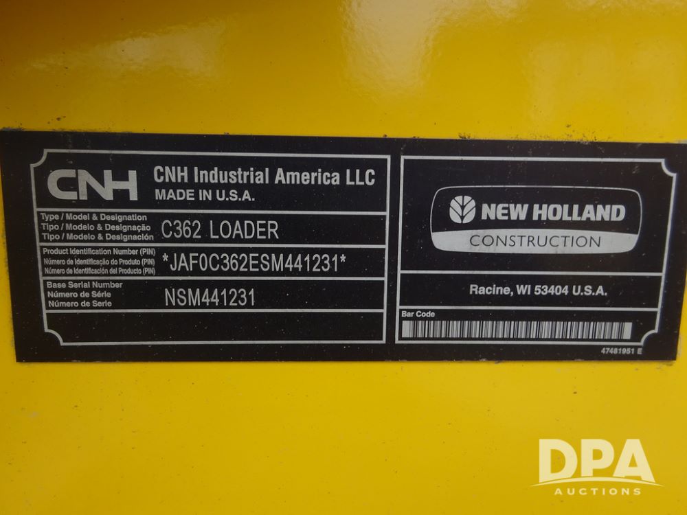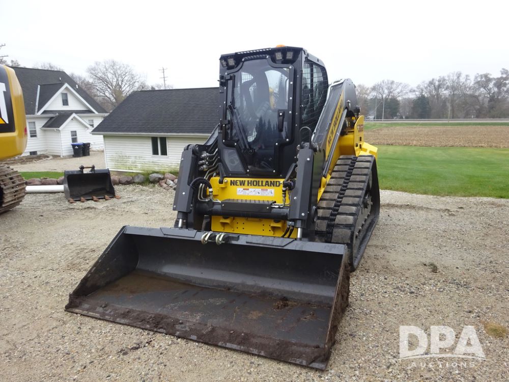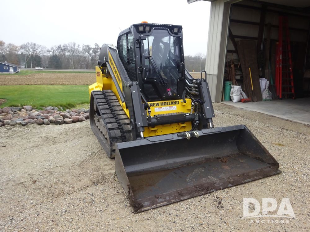 2025 New Holland C362 Skid Steer (PZ14194), diesel engine, hydrostatic transmission, cab, lights, air conditioning, heat, Am/Fm radio, rear backup camera, beacon light, 84" bucket, auxiliary hydraulics, Super Boom, HXD450X86X63 HBBC tracks, shows 49 hours.