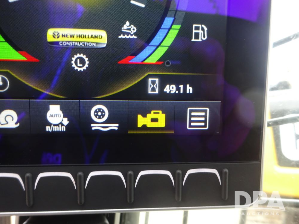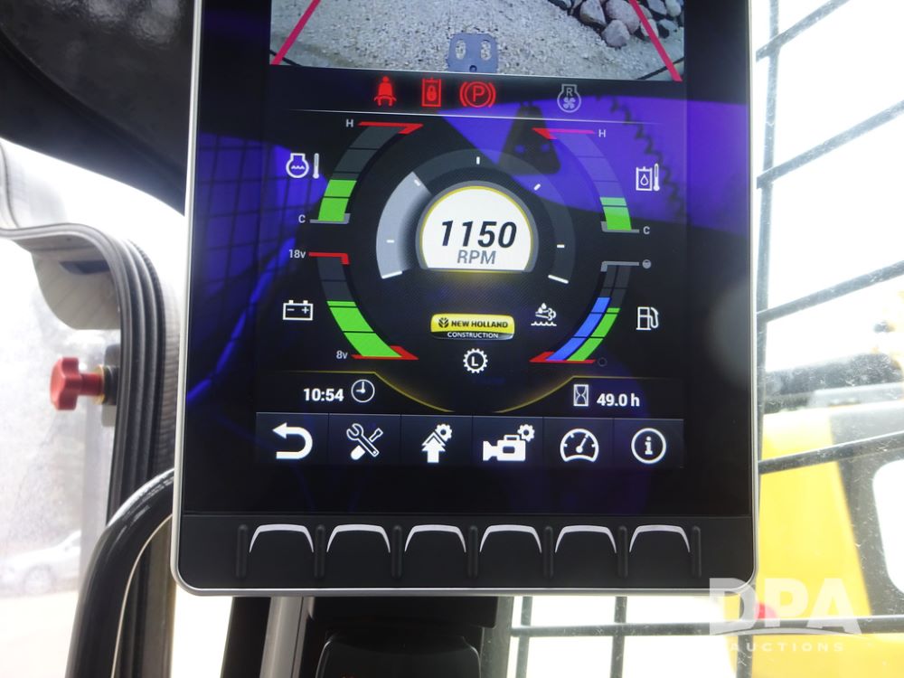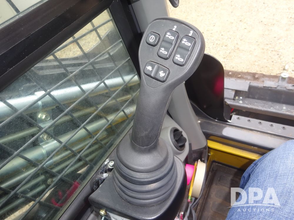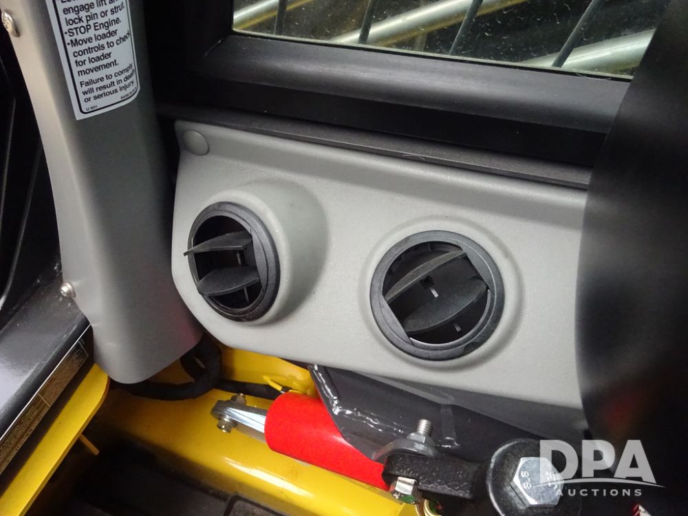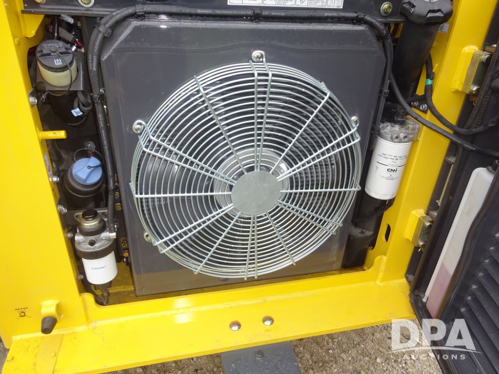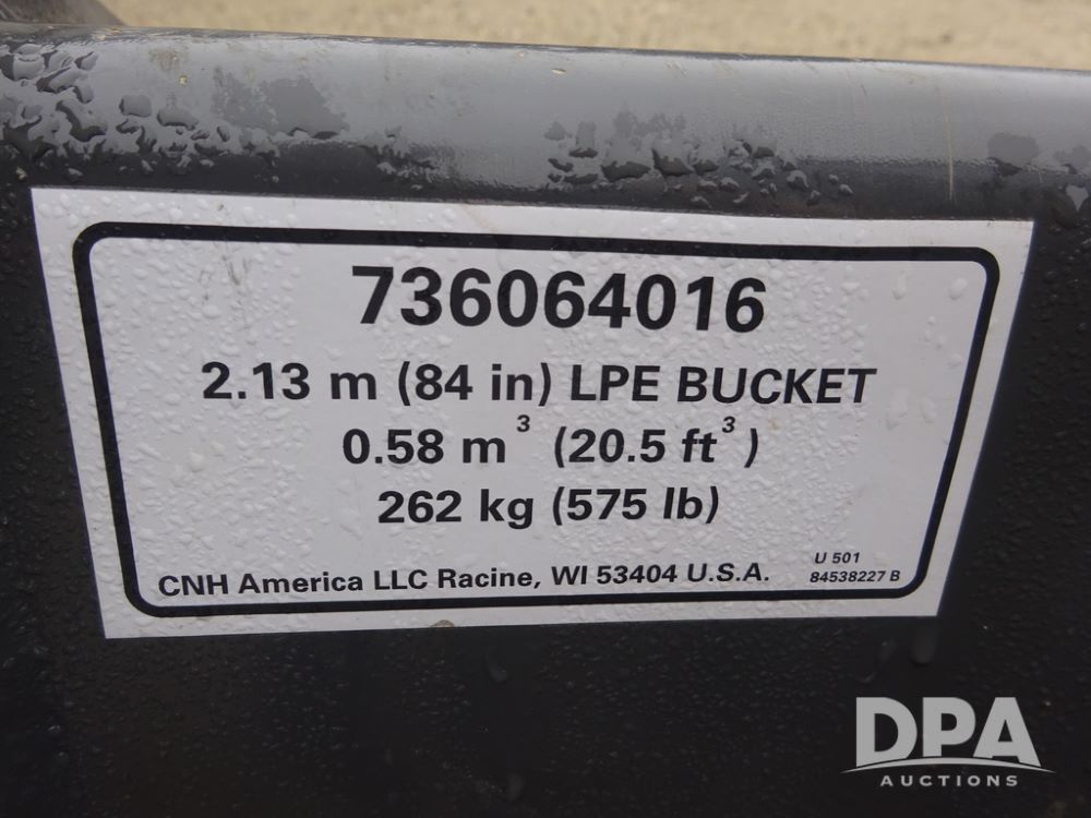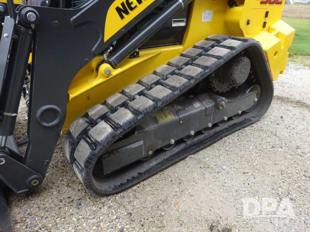 2025 New Holland C362 Skid Steer (PZ14194), diesel engine, hydrostatic transmission, cab, lights, air conditioning, heat, Am/Fm radio, rear backup camera, beacon light, 84" bucket, auxiliary hydraulics, Super Boom, HXD450X86X63 HBBC tracks, shows 49 hours.