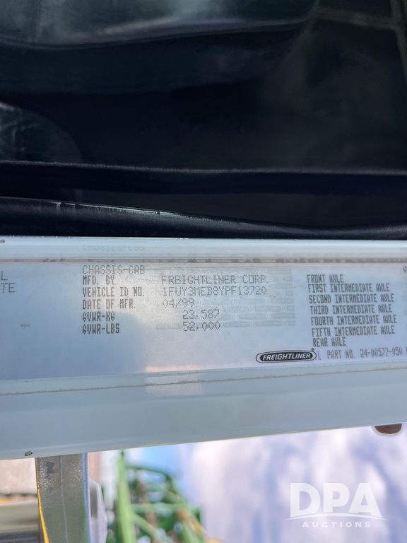 2000 Freightliner Truck (JN3644, Unit 21817), ISM Cummins diesel engine, Eaton Fuller 10 speed transmission, air conditioning, heat, Am/Fm radio, cruise control, tandem axle, full screw, air ride suspension, 11R22.5 tires, aluminum rims, shows 502,551 miles.
