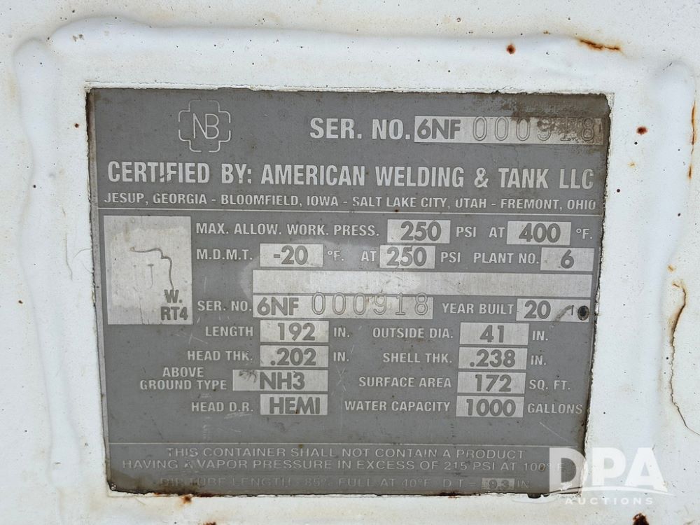 2010 American Welding & Tank NH3 Nurse Tank (GP12450, Unit M7), 2010 American Welding & Tank 1000 gallon NH3 nurse tank, top front fill.