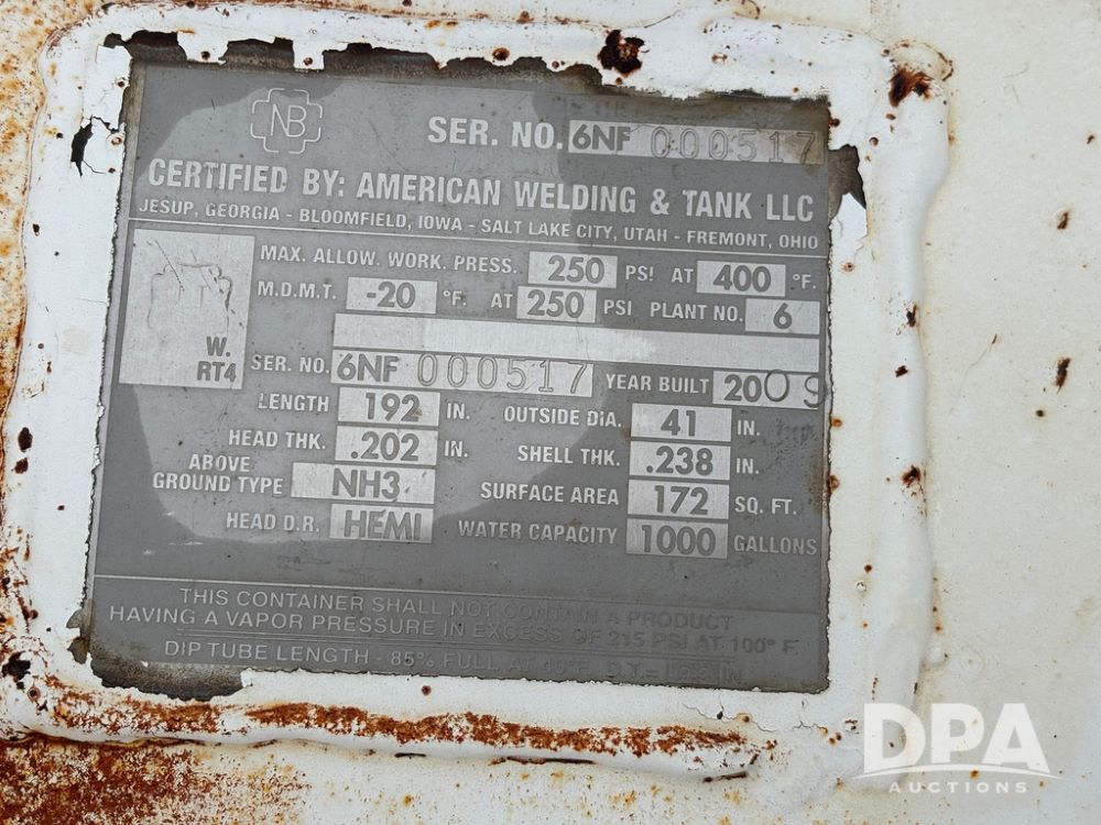 2009 American Welding & Tank NH3 Nurse Tank (GP12452), 2009 American Welding & Tank 1000 gallon NH3 nurse tank, top front fill.