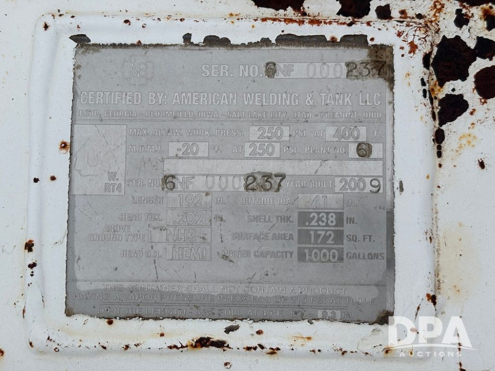 2009 American Welding & Tank NH3 Nurse Tank (GP12453), 2009 American Welding & Tank 1000 gallon NH3 nurse tank, top front fill.