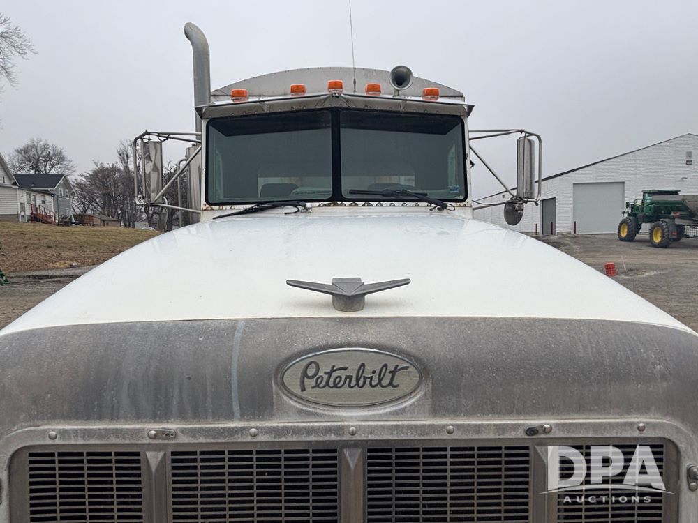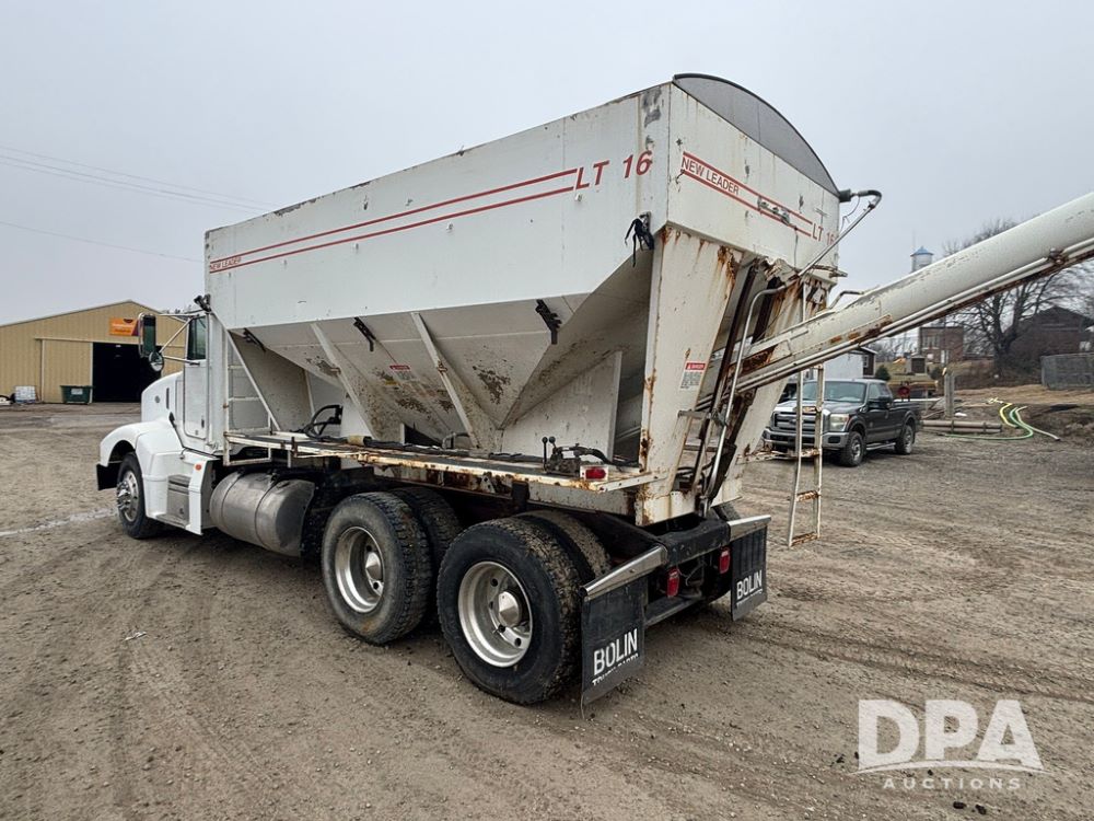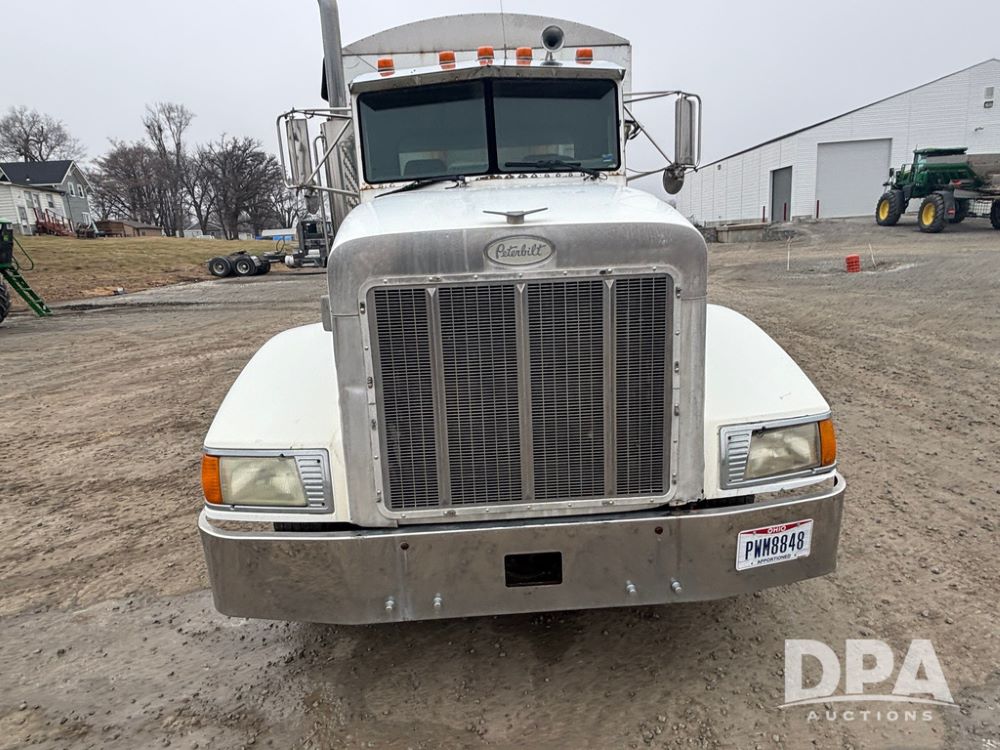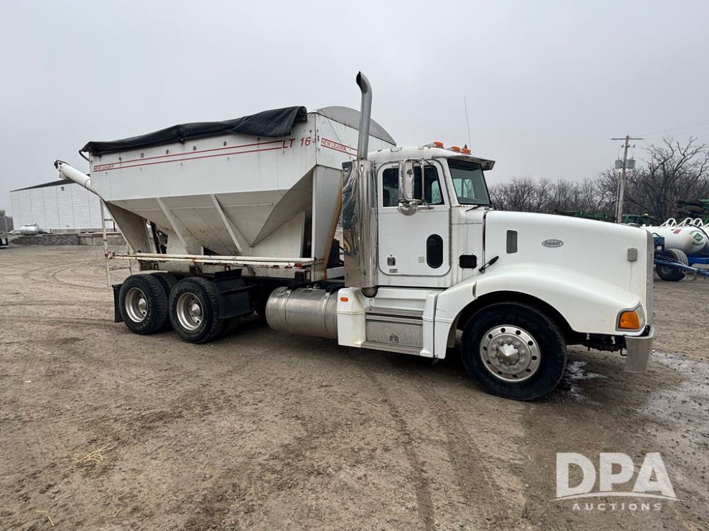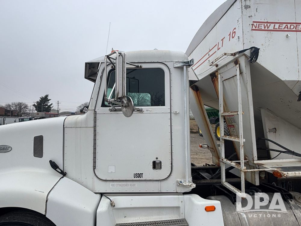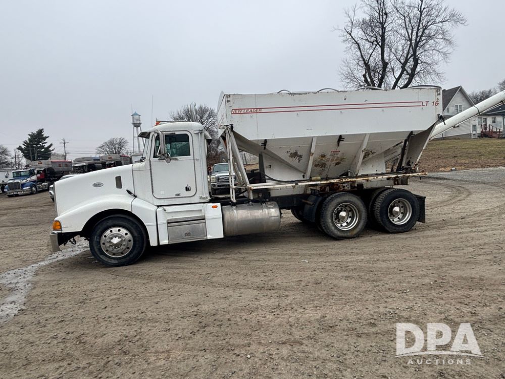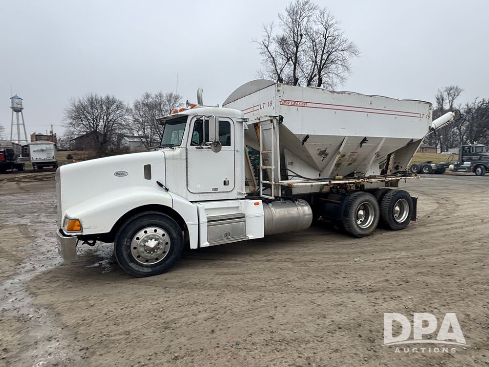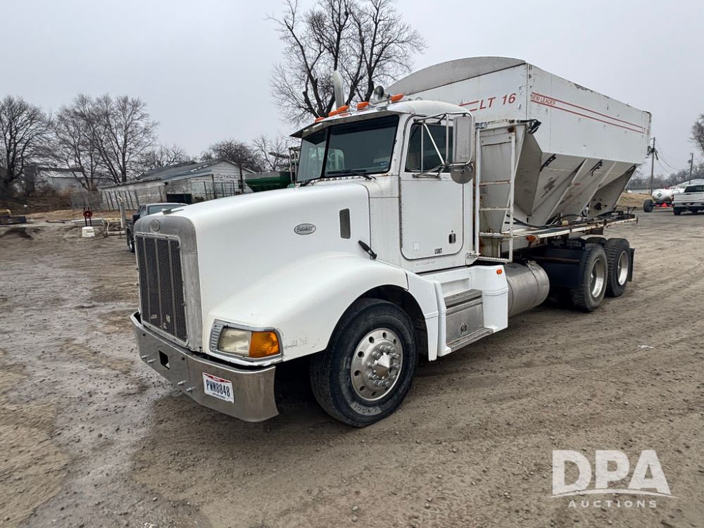1999 Peterbilt 377 Dry Tender Truck (GP12445, Unit 11411), Cat C-12 diesel engine, Eaton Fuller 10 speed transmission, air conditioning, heat, Am/Fm radio, cruise control, tandem axle, full screw, air ride suspension, New Leader LT16 dry tender box, rear discharge auger, all hydraulic, roll over tarp, 11R22.5 tires, aluminum rims, shows 1,175,492 miles.