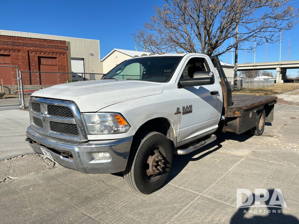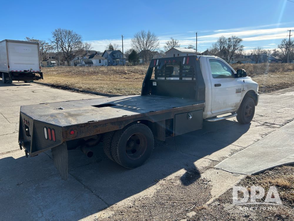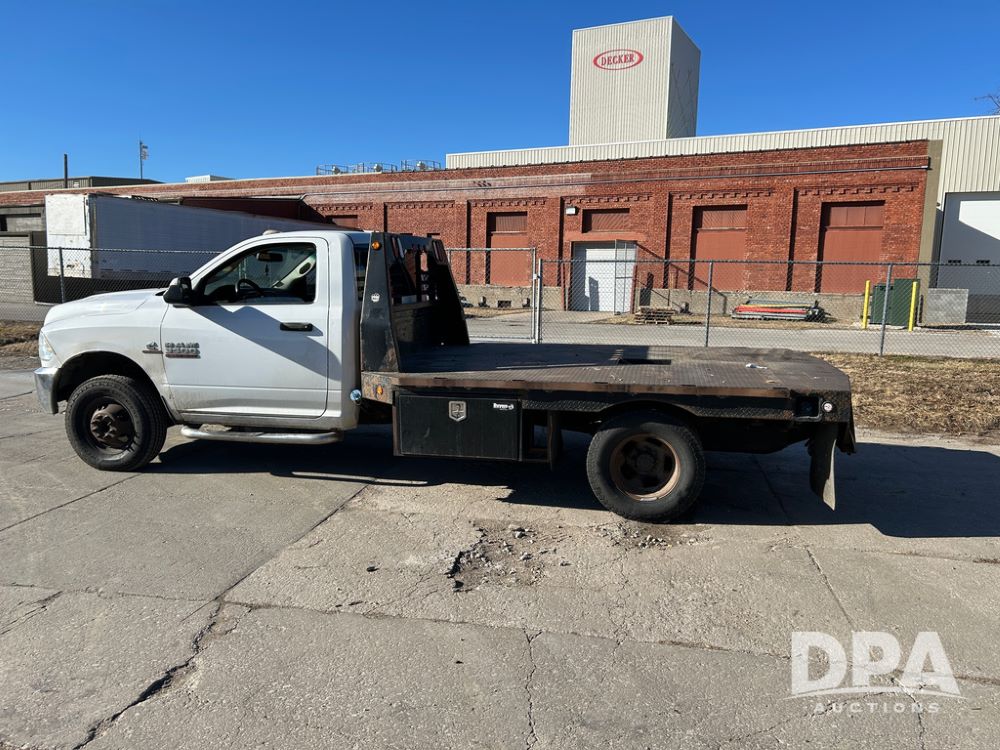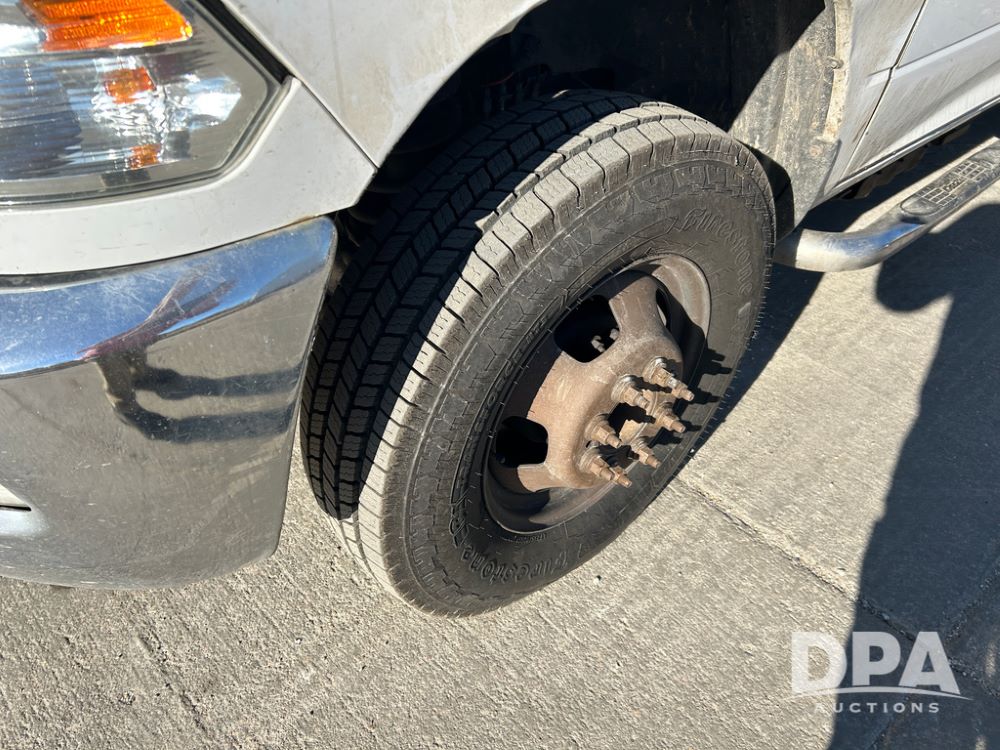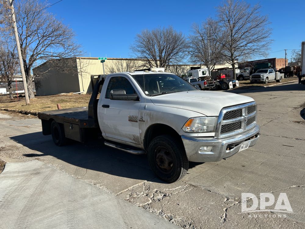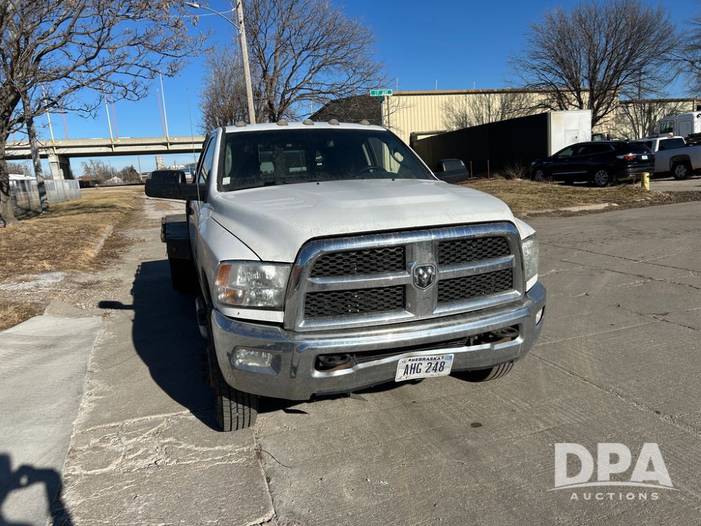 2013 Ram 3500 Heavy Duty 4x4 Flatbed Pickup (CP1427), regular cab, Cummins 6.7L turbo diesel engine (approx. 150,000 miles on current engine), automatic transmission, heat, Am/Fm radio, power windows, locks and mirrors, cloth interior, cruise control, approx. 11' rear flatbed, dually, running boards, LT235/80R17 tires, shows 338,841 miles.