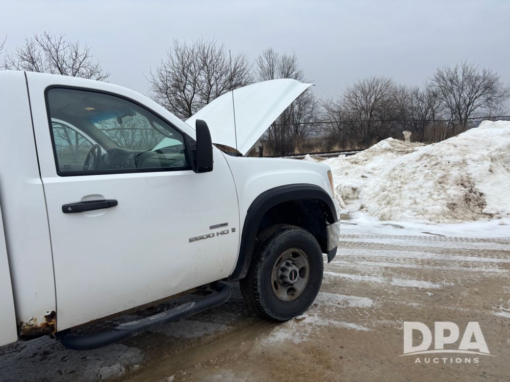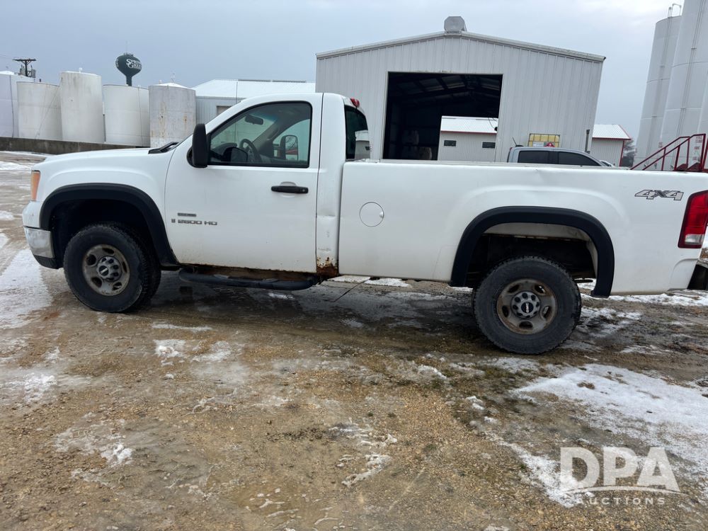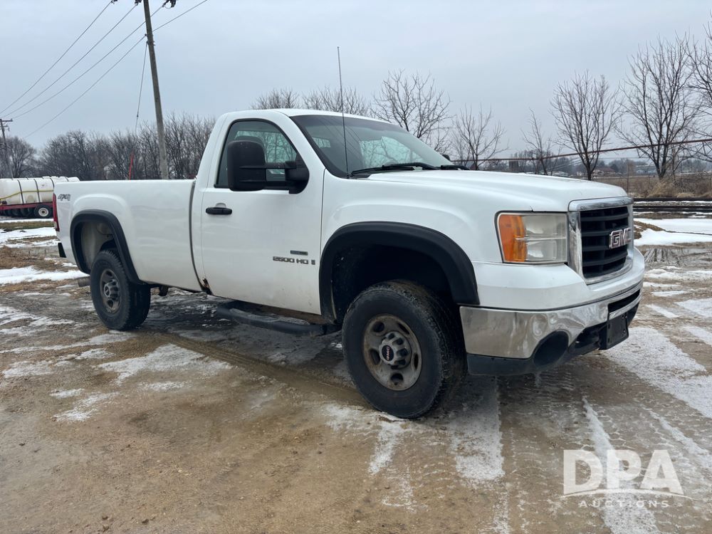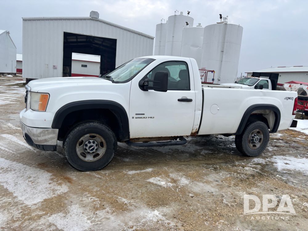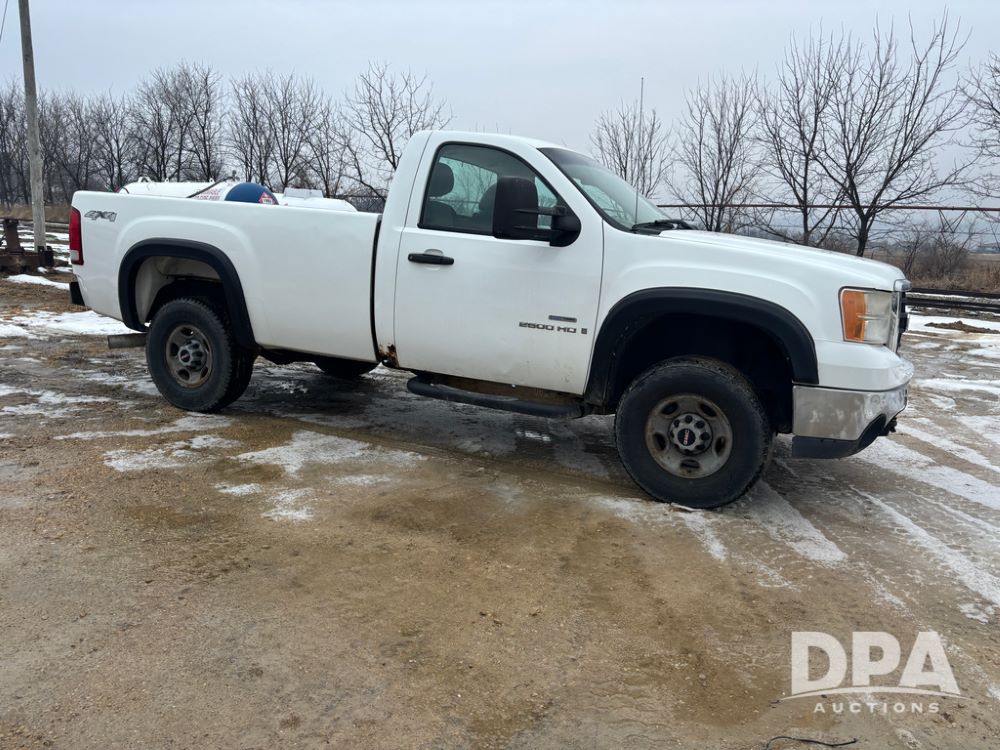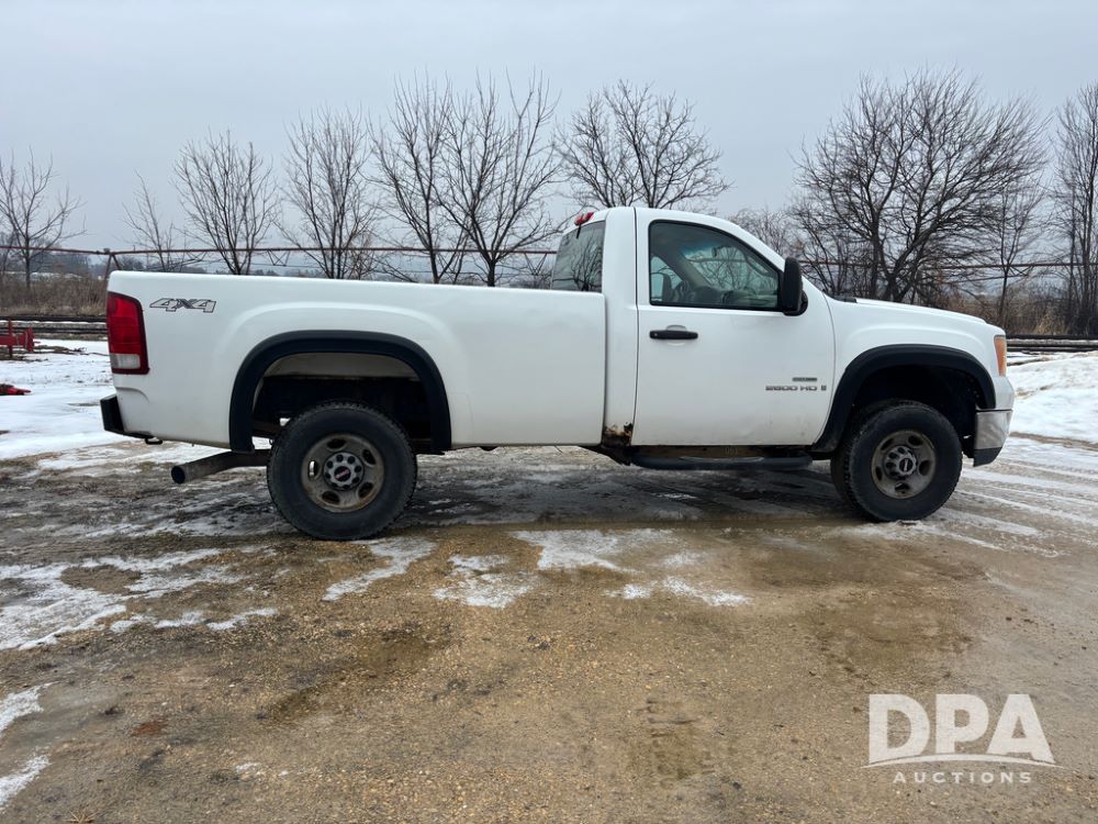 2008 GMC 2500HD Pickup (DR12899 Unit 22715), Dura Max diesel engine, Allison automatic transmission, 4X4, regular cab long box, NO tailgate, 5th wheel ball, rear ag bumper, nerf bar cab steps, AM/FM CD radio, cab heat/air conditioning, 265/75R16 tires, odometer reads 288,143 miles.