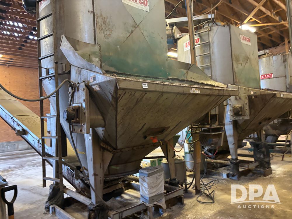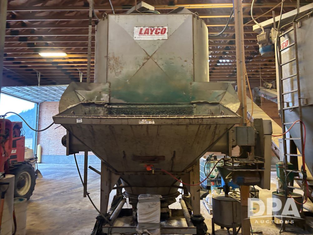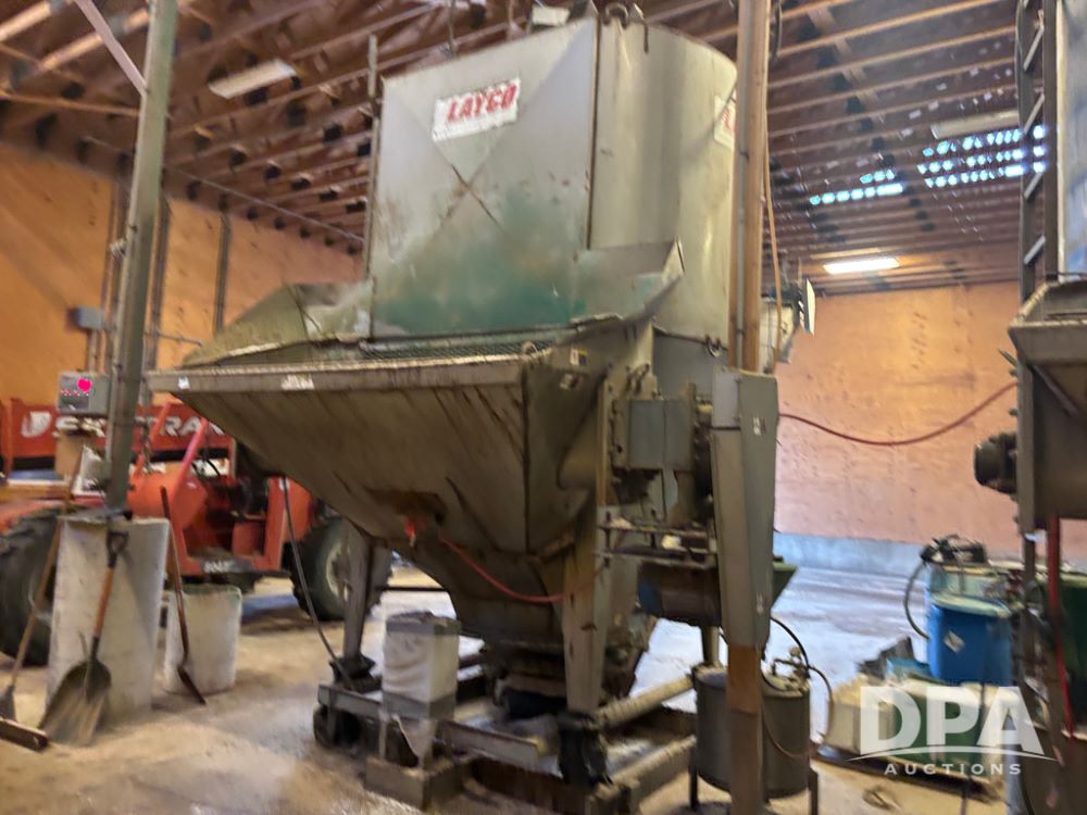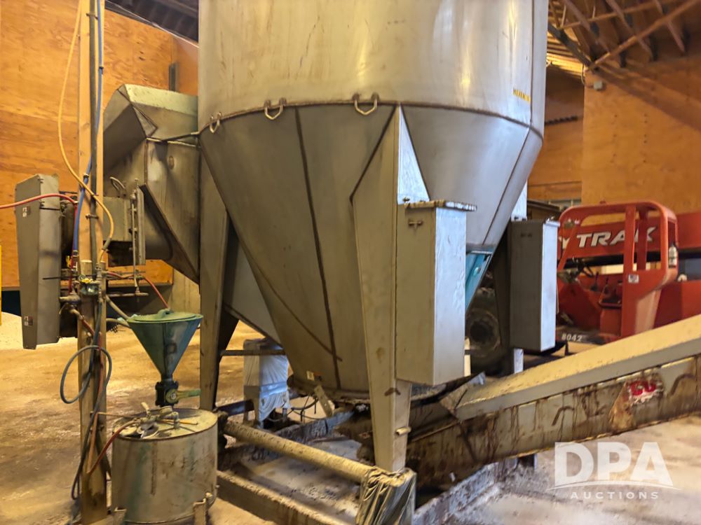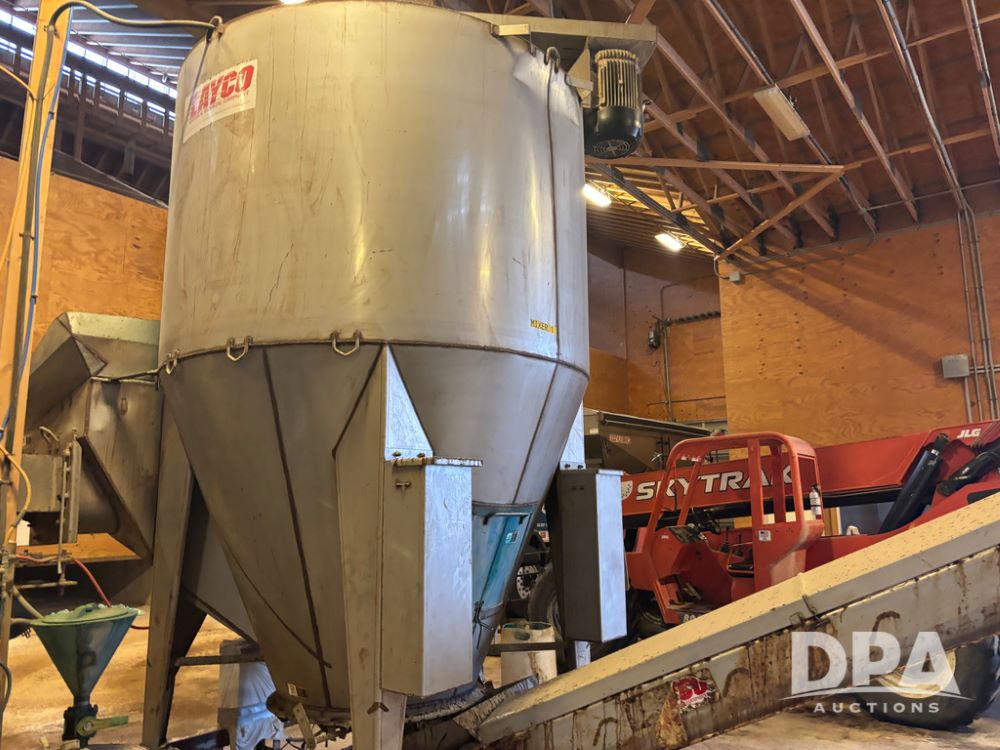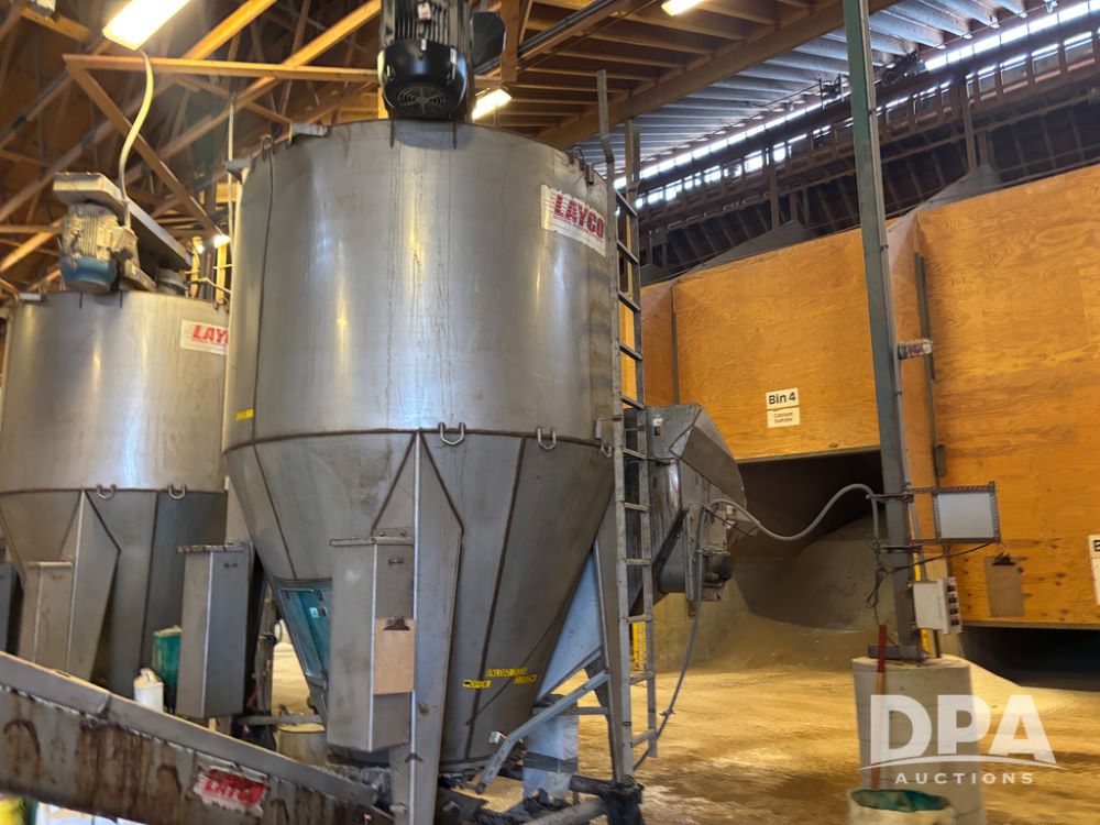 Layco Dry Blender (DR12902 Mixer 1), 10 ton stainless steel vertical dry blender, side hopper w/vibrator, NO discharge conveyor is included, 2024 top drive motor, scale load cells NO scale head, electric control panel.