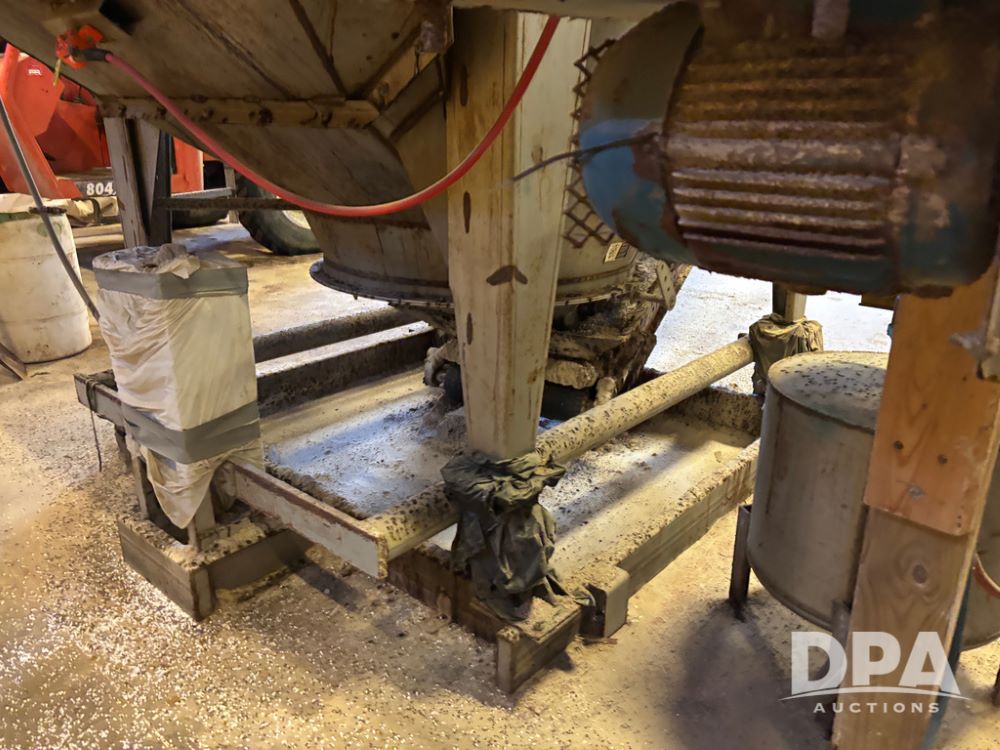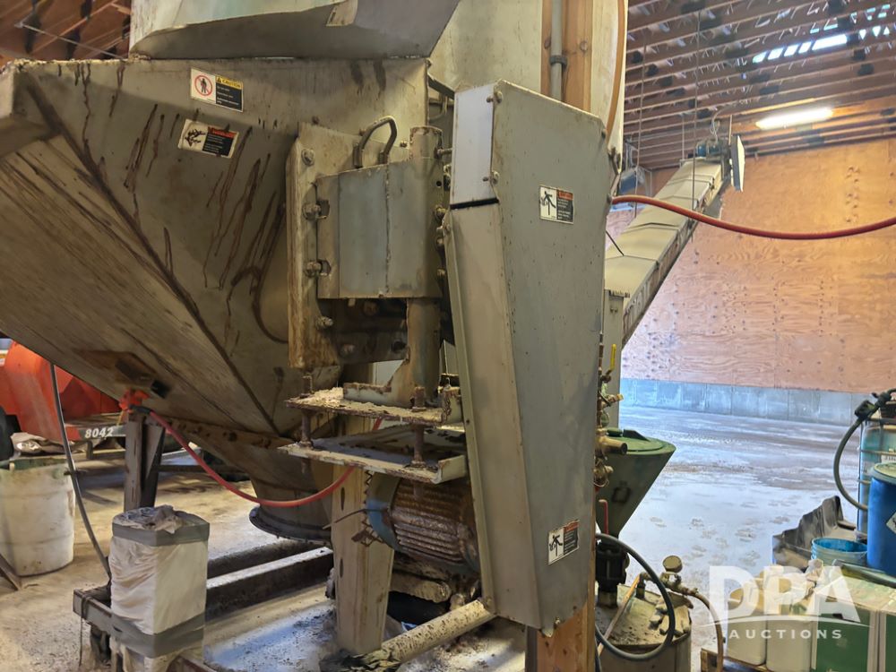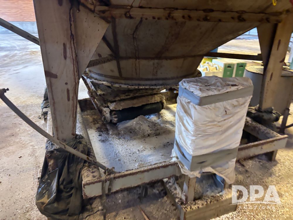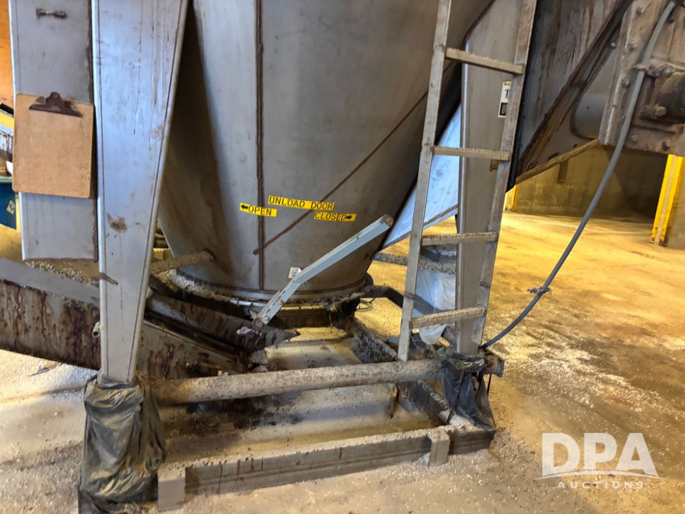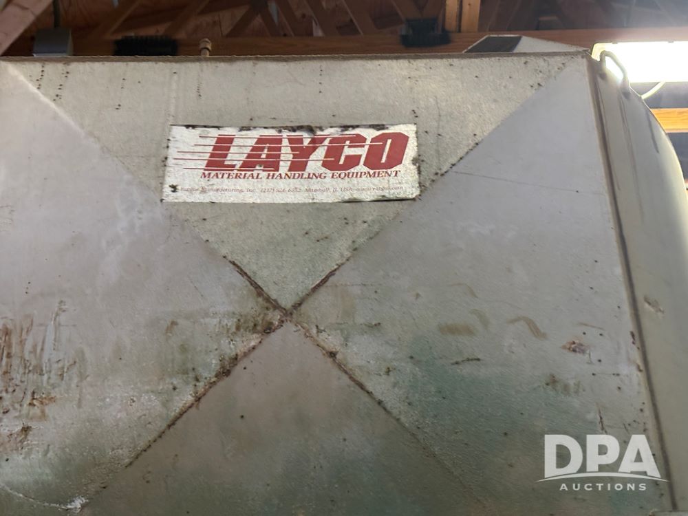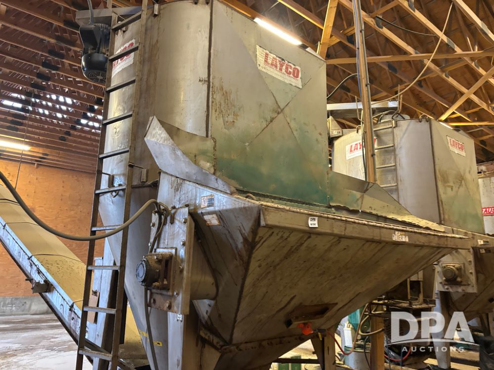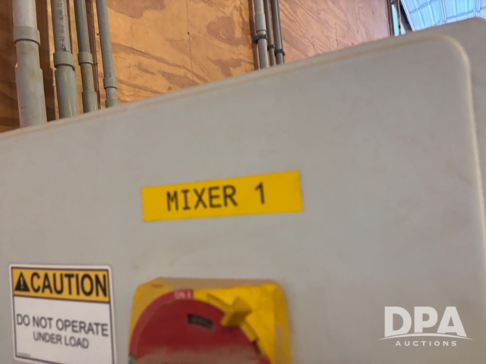Layco Dry Blender (DR12902 Mixer 1), 10 ton stainless steel vertical dry blender, side hopper w/vibrator, NO discharge conveyor is included, 2024 top drive motor, scale load cells NO scale head, electric control panel.
