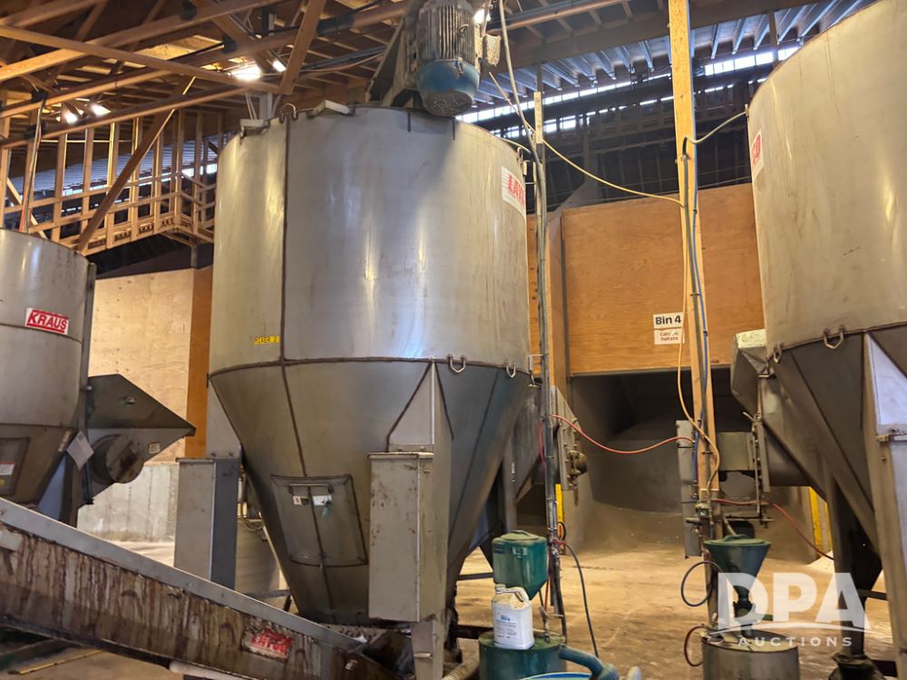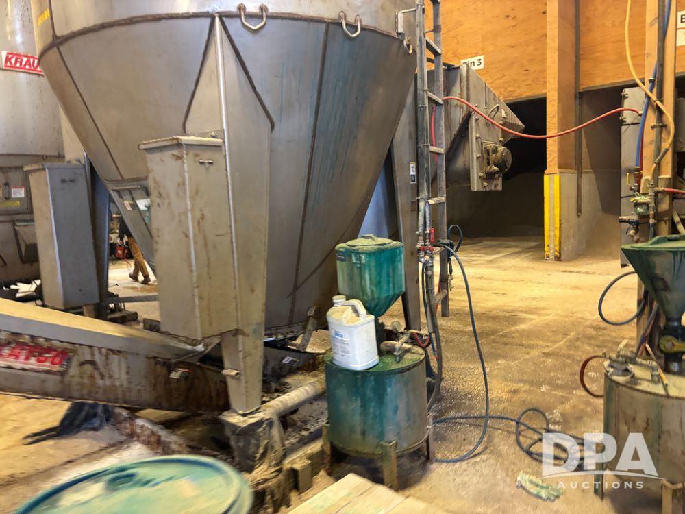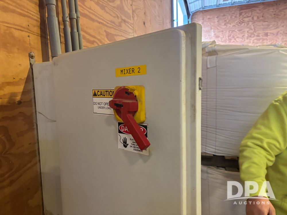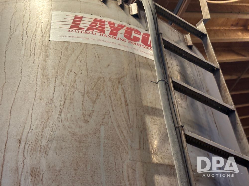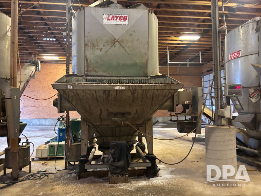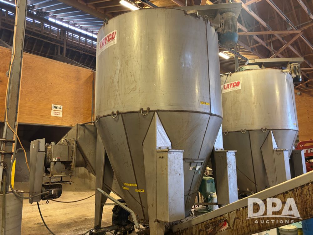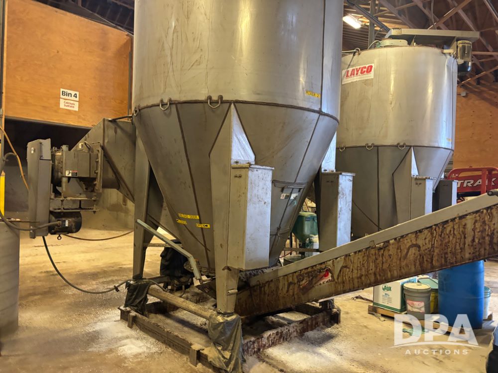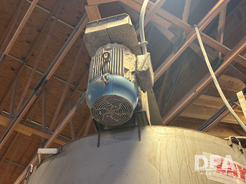 Layco Dry Blender (DR12903 Mixer 2), 10 ton stainless steel vertical dry blender, side hopper w/vibrator, NO discharge conveyor is included, 2024 top drive motor, scale load cells NO scale head, electric control panel.