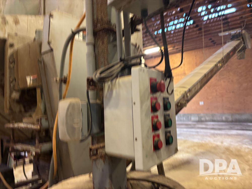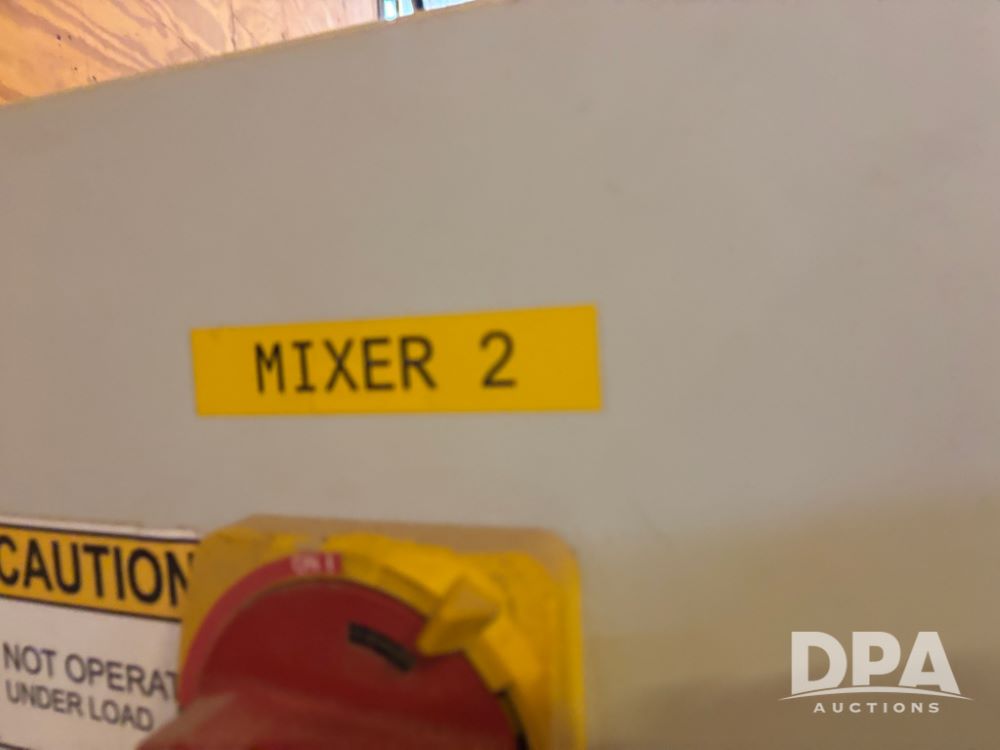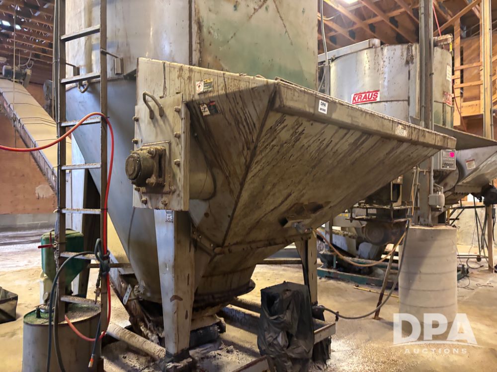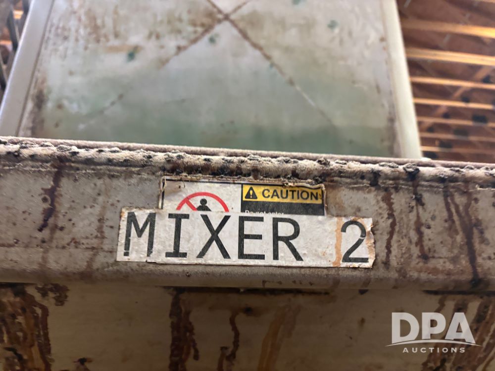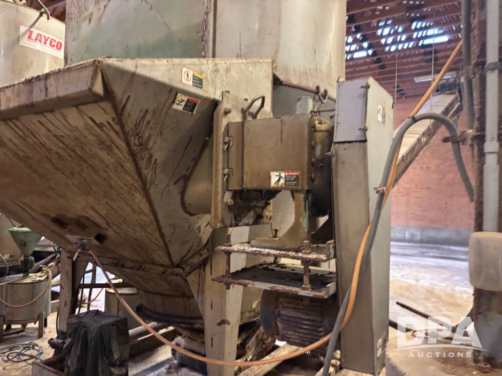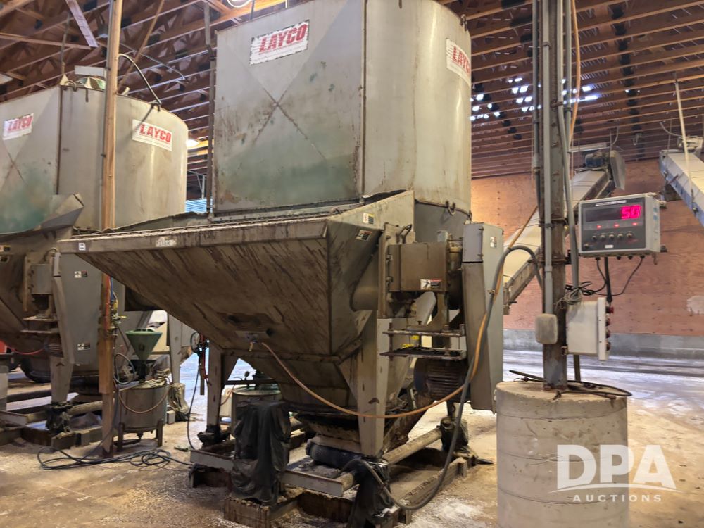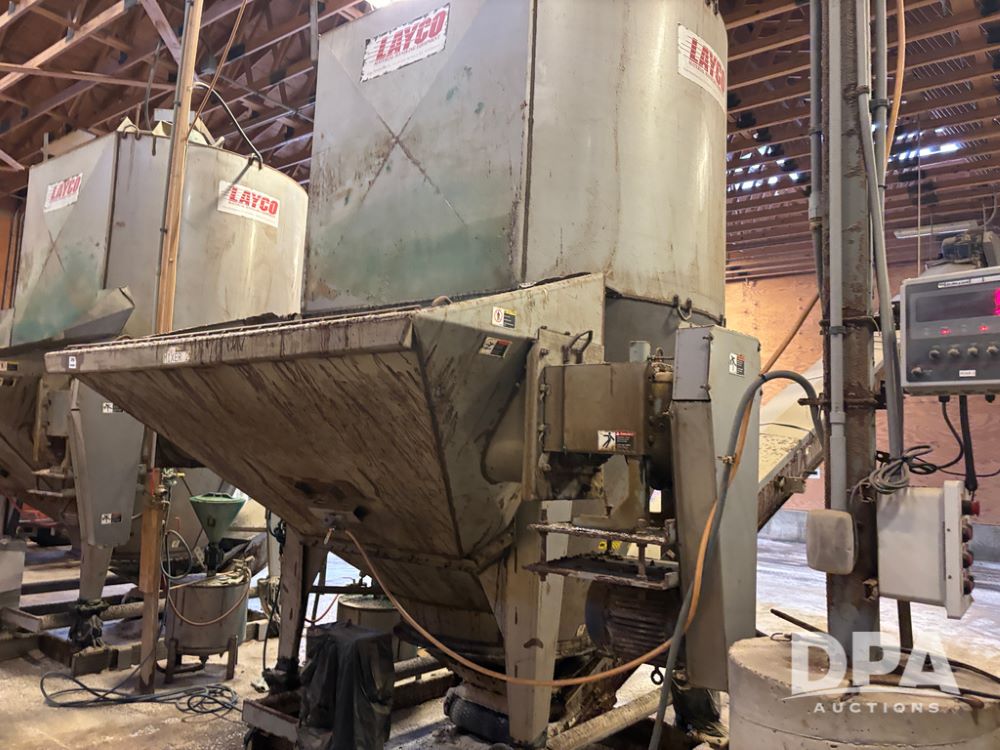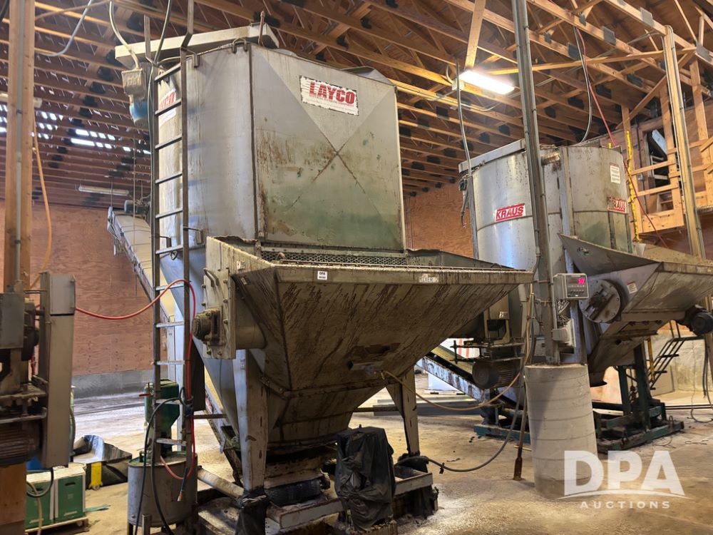 Layco Dry Blender (DR12903 Mixer 2), 10 ton stainless steel vertical dry blender, side hopper w/vibrator, NO discharge conveyor is included, 2024 top drive motor, scale load cells NO scale head, electric control panel.