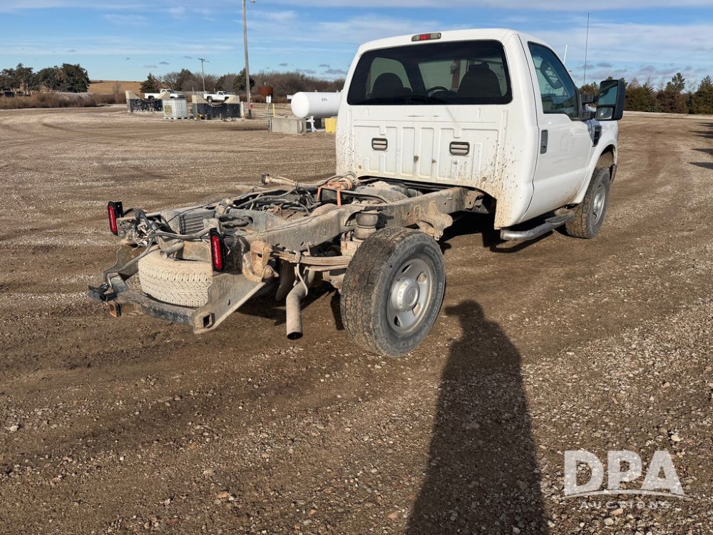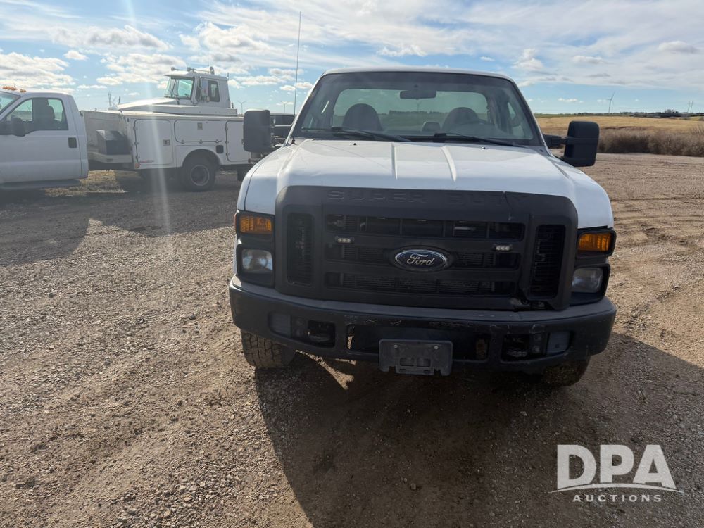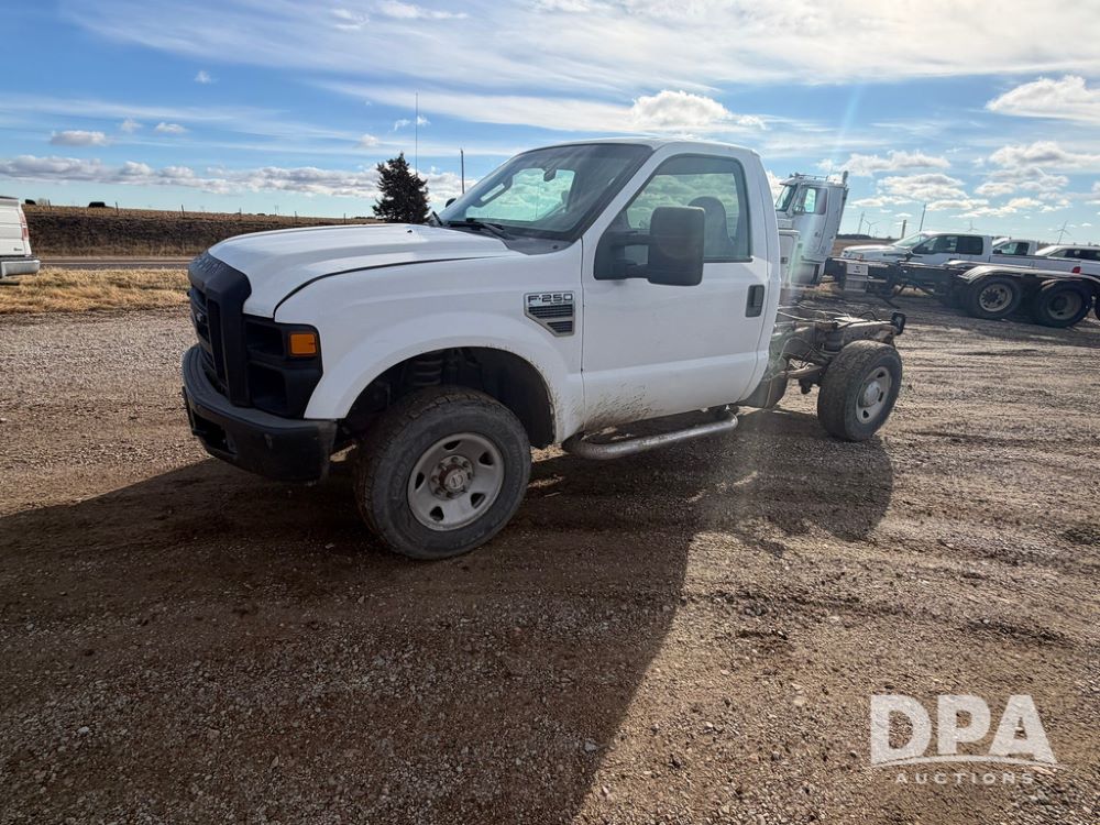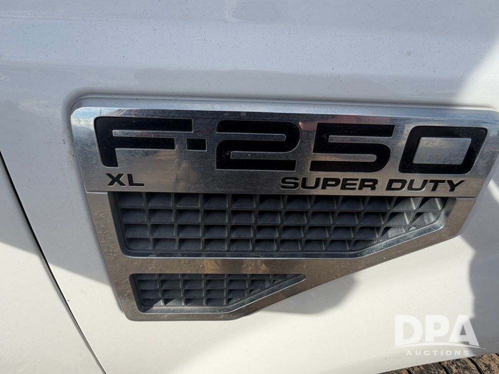 2009 Ford F-250 Super Duty XL Pickup (RR0575, Unit A68), 5.4L gas V-8 engine, automatic transmission, regular cab, 4X4, heat, air conditioning, AM/FM radio, rear air bags, chrome running boards, spare tire, receiver hitch, LT 265/70R17 tires, shows 129,329 miles.