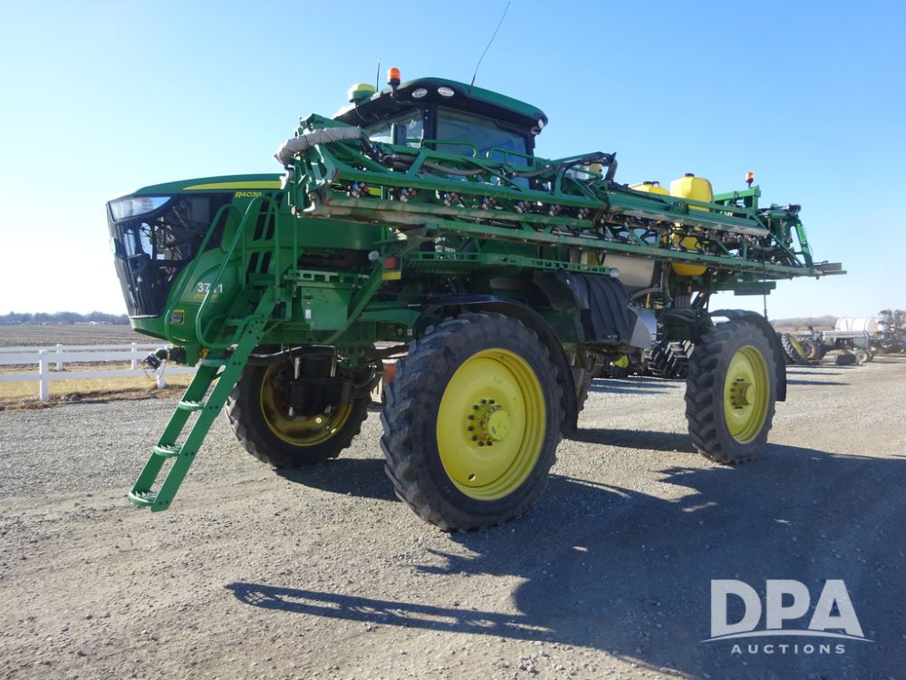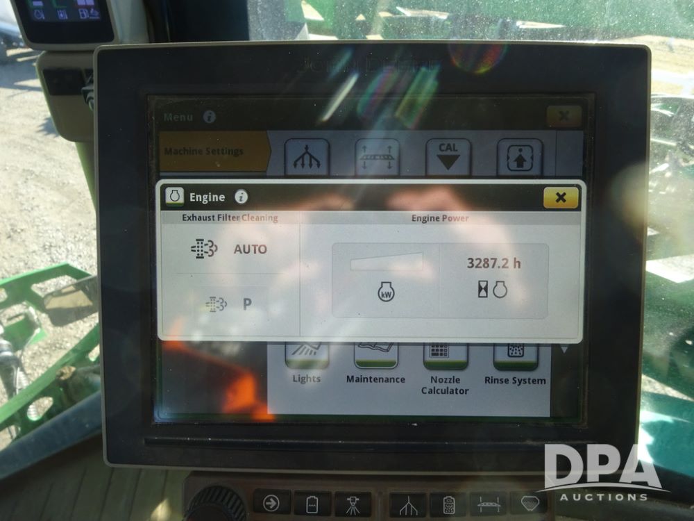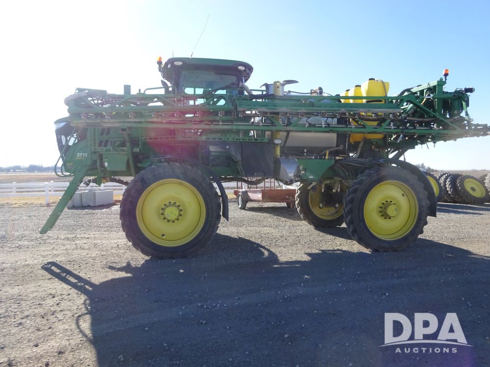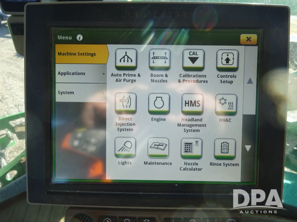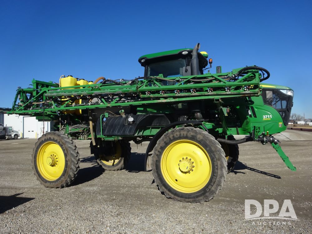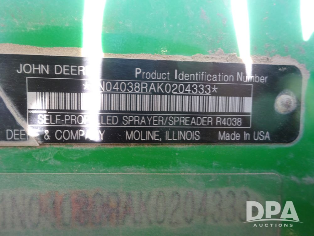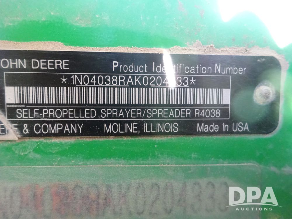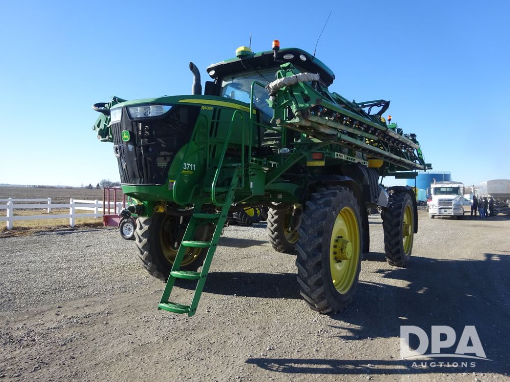 2020 John Deere R4038 Sprayer (PZ14298, Unit 3711), John Deere diesel engine (S/N RG6090U078377), hydrostatic transmission, air conditioning, heat, Am/Fm radio, leather seat, buddy seat, beacon lights, 1000 gallon stainless steel liquid system, 100' boom, rear poly rinse tank, 4 - 50 gallon poly direct injection tank, 2 - Raven Sidekick Pro pumps, stainless steel chemical inductor, automatic solution control, front fill, Firestone VF380/90R46 tires, fenders, rear camera, John Deere StarFire 6000 globe, John Deere monitor, shows 3,287 hours.