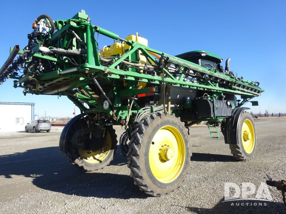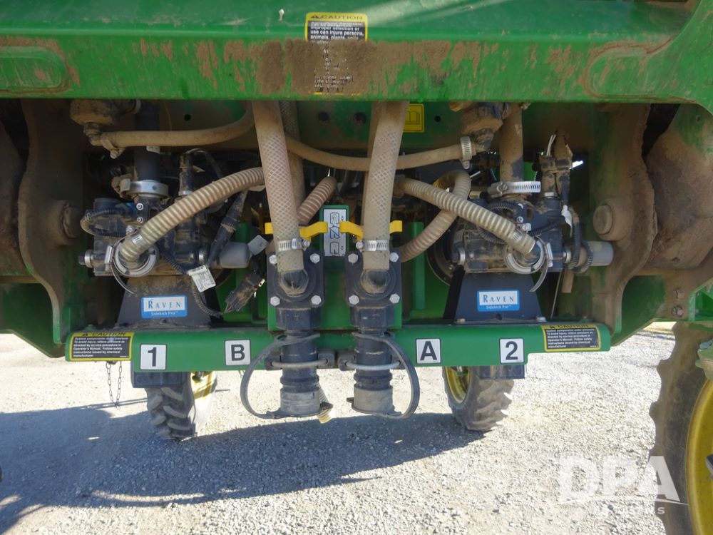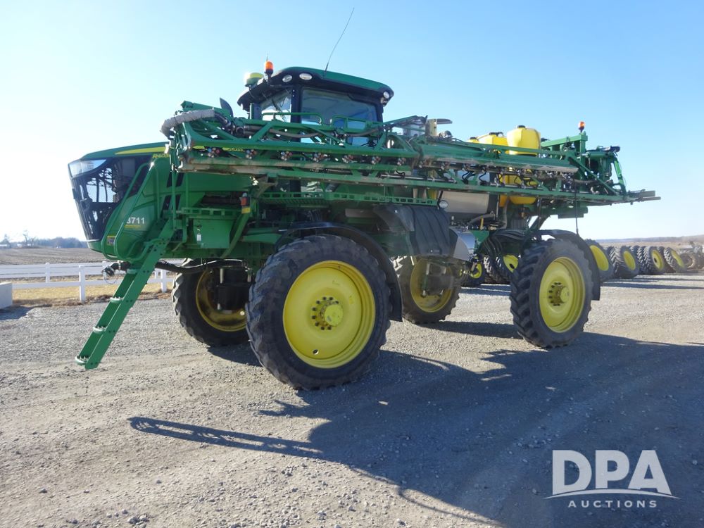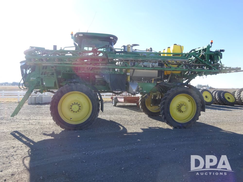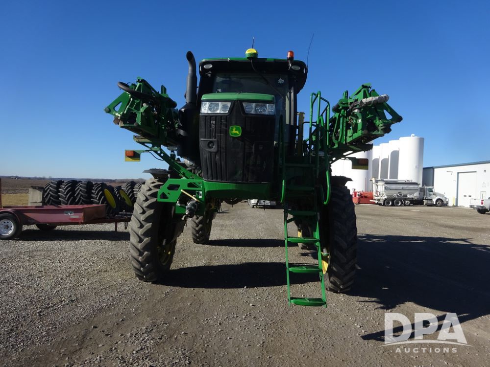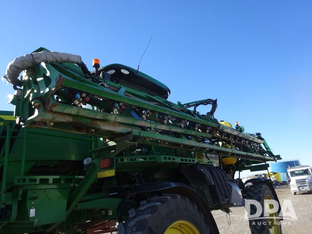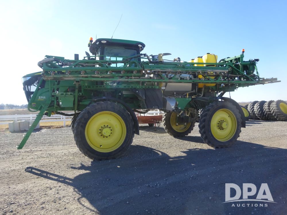 2020 John Deere R4038 Sprayer (PZ14298, Unit 3711), John Deere diesel engine (S/N RG6090U078377), hydrostatic transmission, air conditioning, heat, Am/Fm radio, leather seat, buddy seat, beacon lights, 1000 gallon stainless steel liquid system, 100' boom, rear poly rinse tank, 4 - 50 gallon poly direct injection tank, 2 - Raven Sidekick Pro pumps, stainless steel chemical inductor, automatic solution control, front fill, Firestone VF380/90R46 tires, fenders, rear camera, John Deere StarFire 6000 globe, John Deere monitor, shows 3,287 hours.