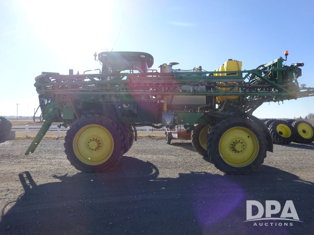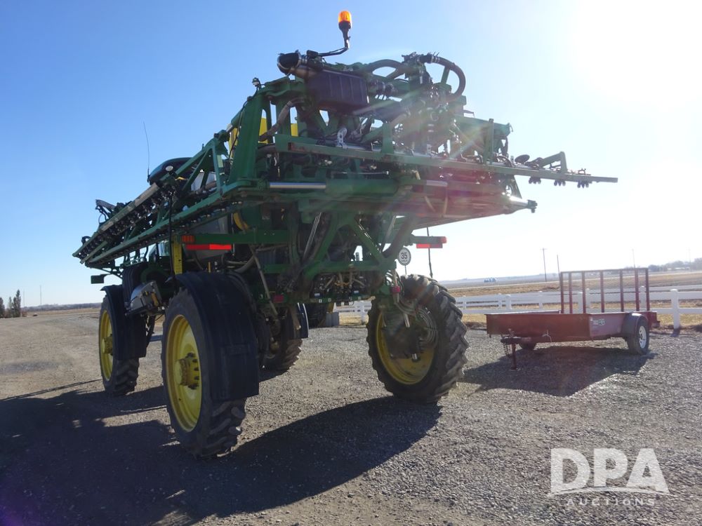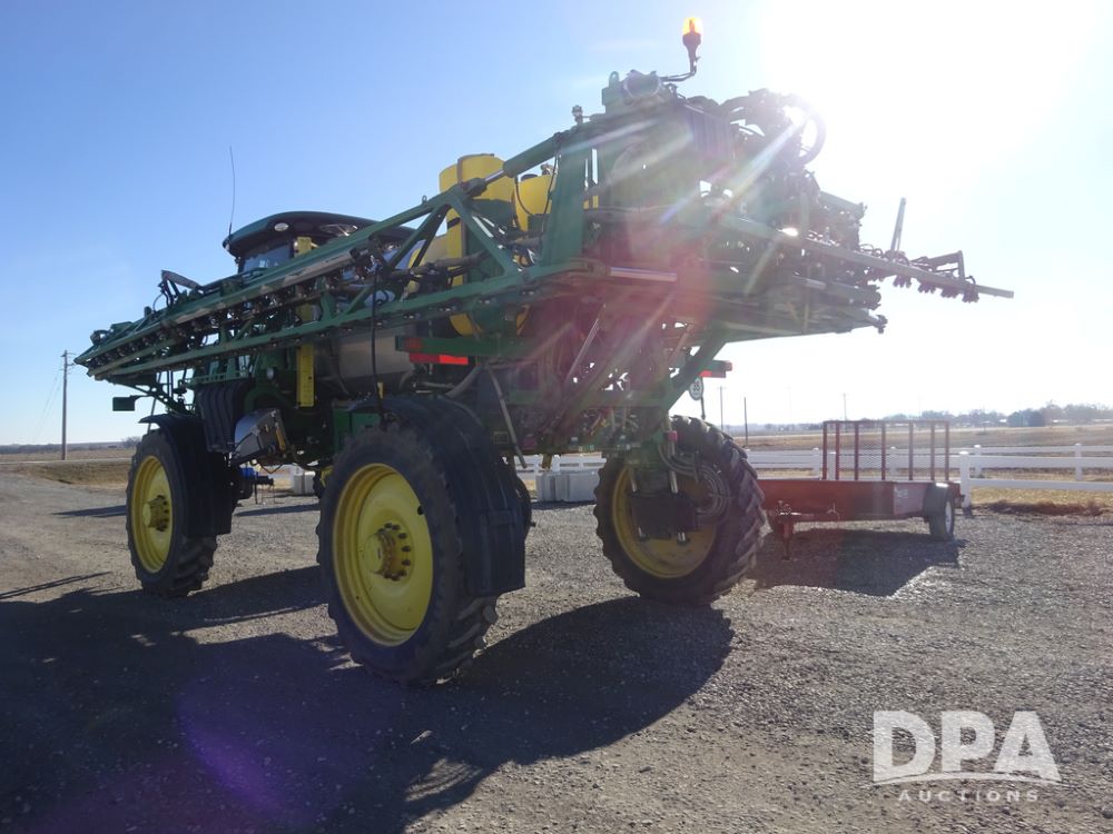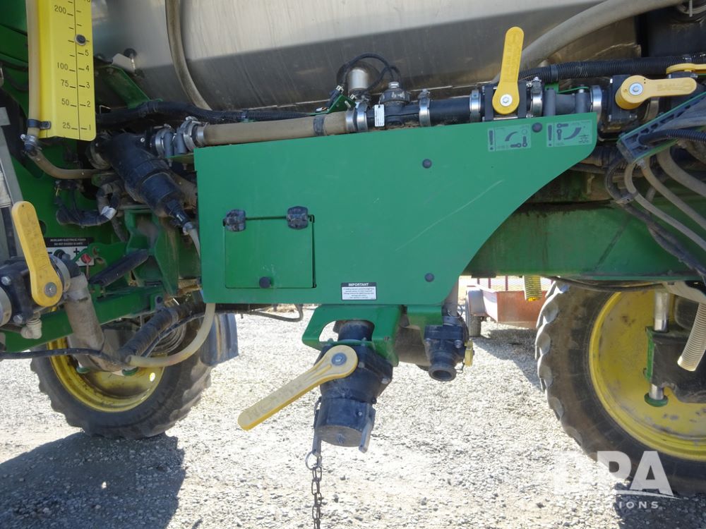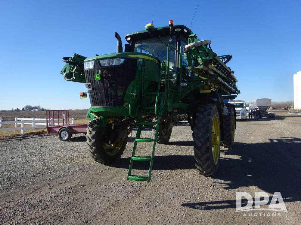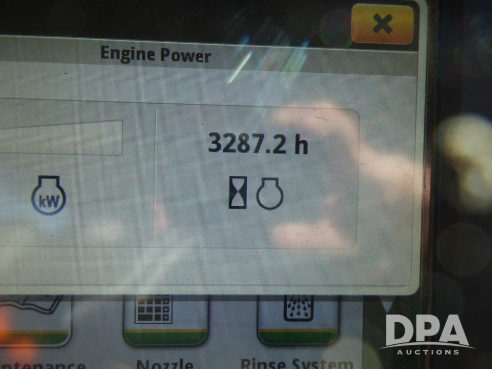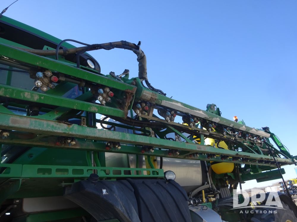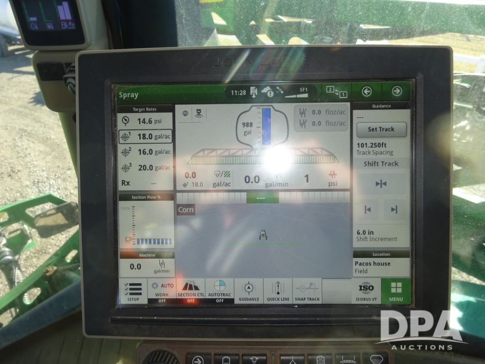 2020 John Deere R4038 Sprayer (PZ14298, Unit 3711), John Deere diesel engine (S/N RG6090U078377), hydrostatic transmission, air conditioning, heat, Am/Fm radio, leather seat, buddy seat, beacon lights, 1000 gallon stainless steel liquid system, 100' boom, rear poly rinse tank, 4 - 50 gallon poly direct injection tank, 2 - Raven Sidekick Pro pumps, stainless steel chemical inductor, automatic solution control, front fill, Firestone VF380/90R46 tires, fenders, rear camera, John Deere StarFire 6000 globe, John Deere monitor, shows 3,287 hours.