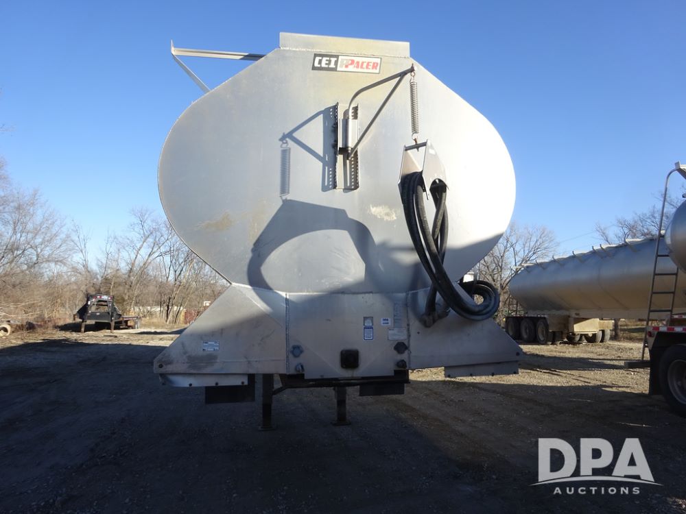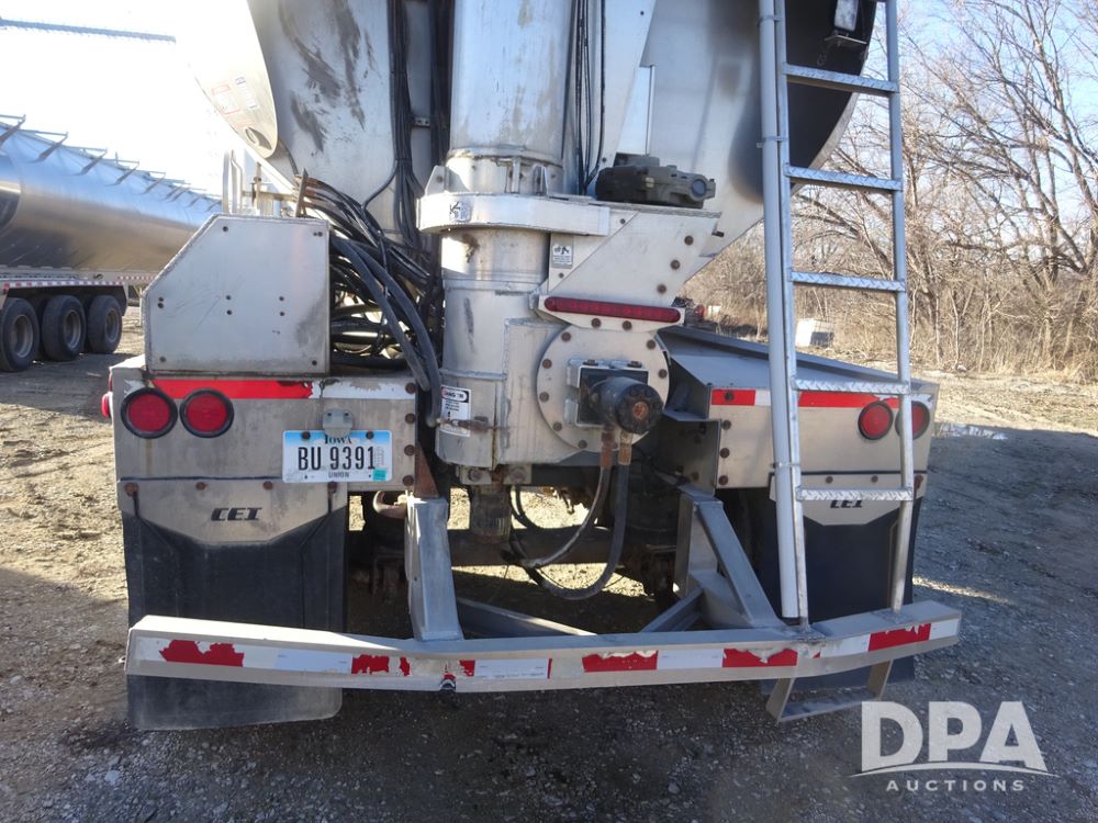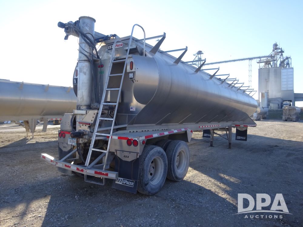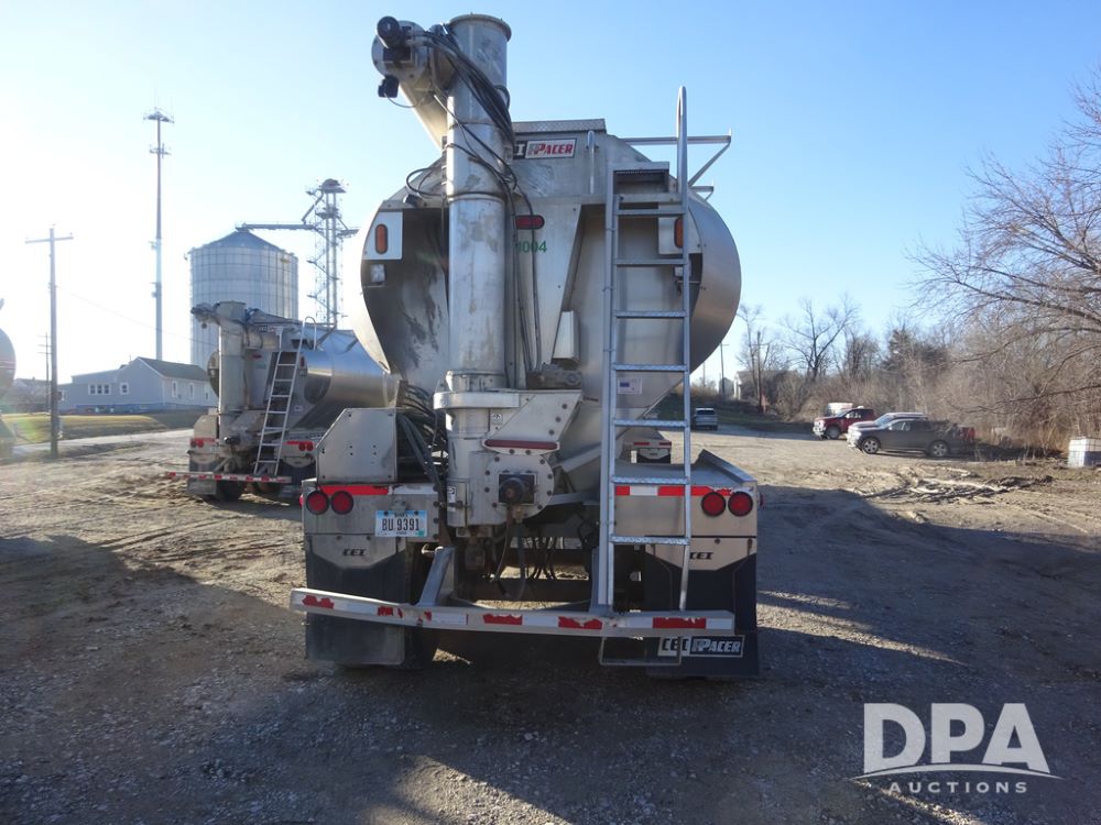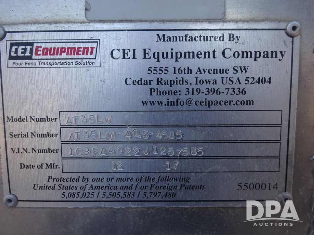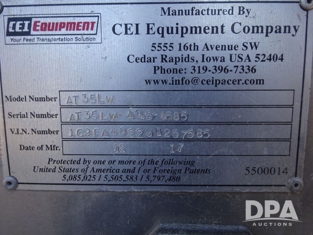 2018 CEI Pacer Feed Trailer (PZ14305, Unit 1004), 2018 CEI Pacer model AT35LW 9 compartment aluminum feed trailer (S/N AT35LW-40.5-4585), rear overhead discharge auger system, tandem axle, air ride suspension, 11R22.5 tires, aluminum rims, hand held remote.