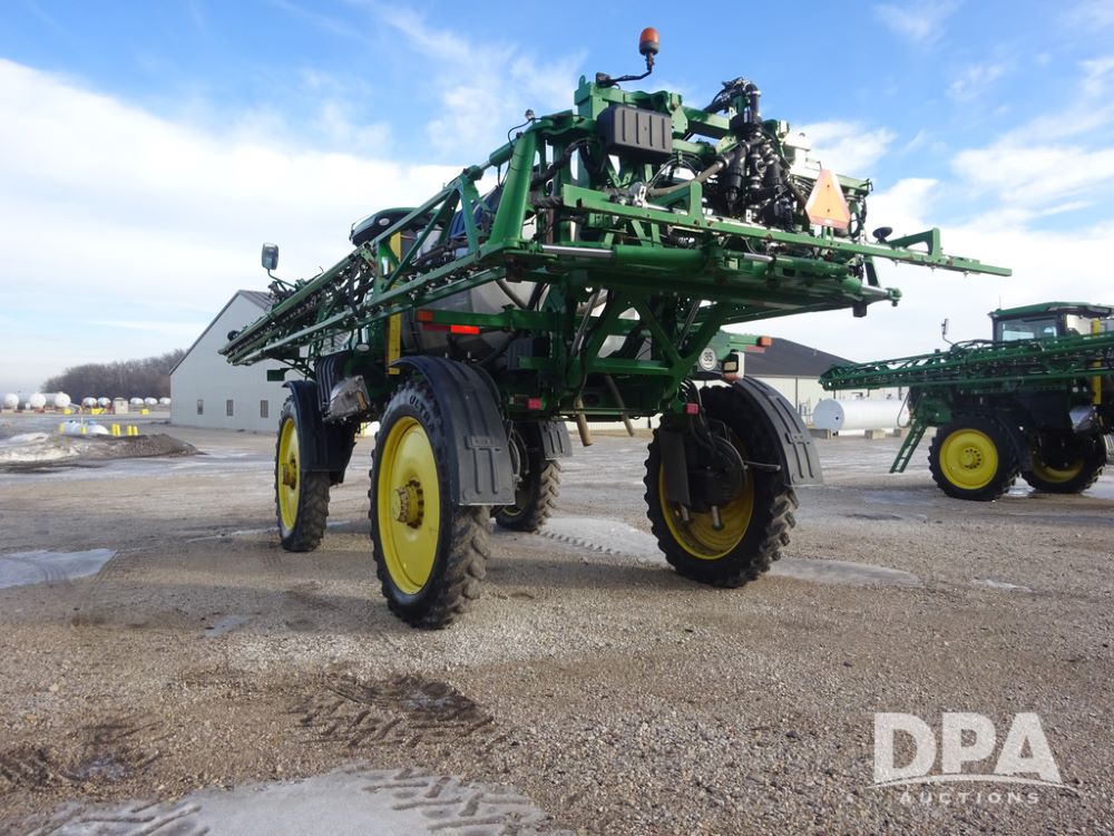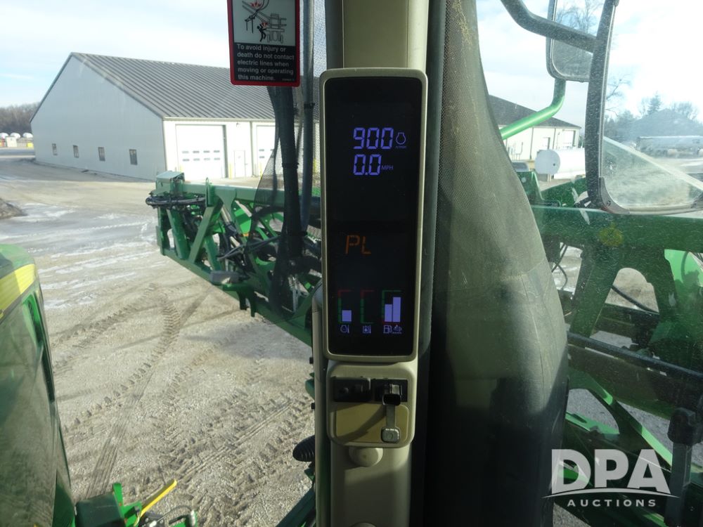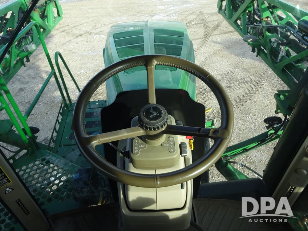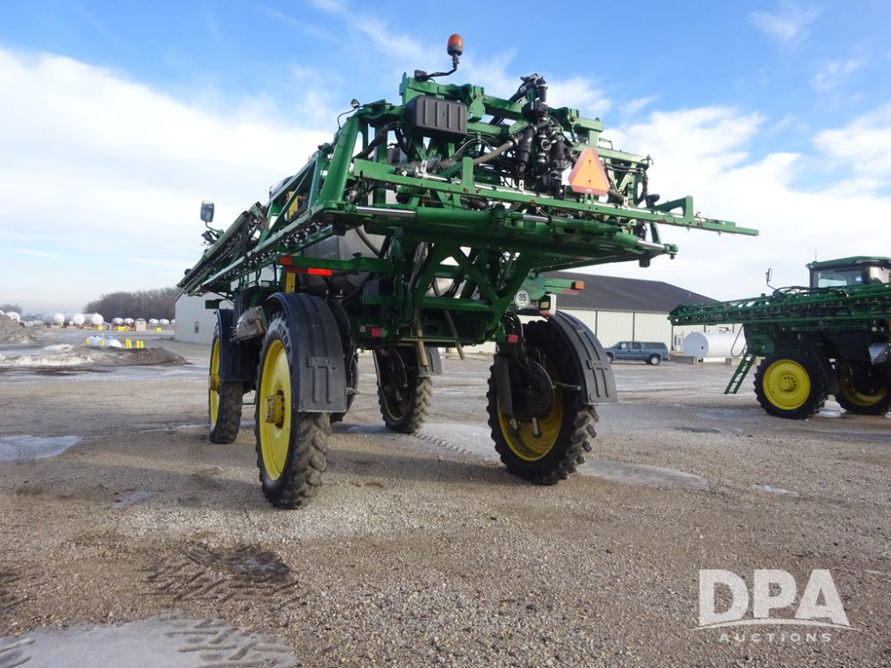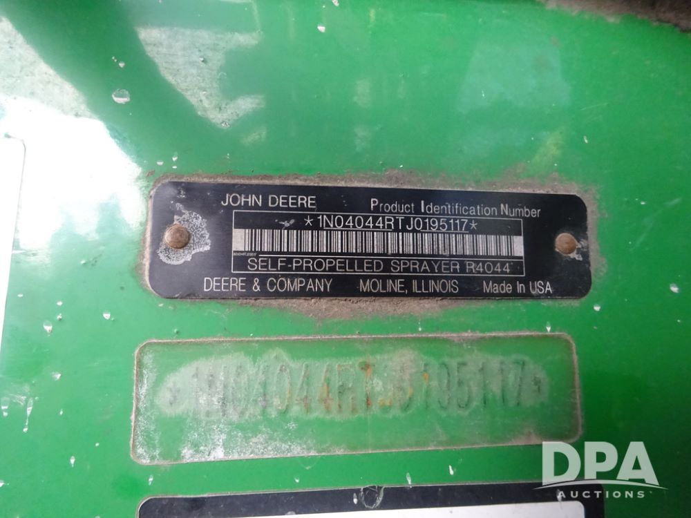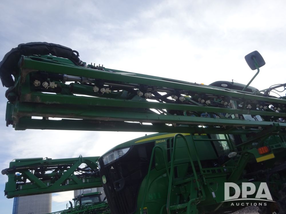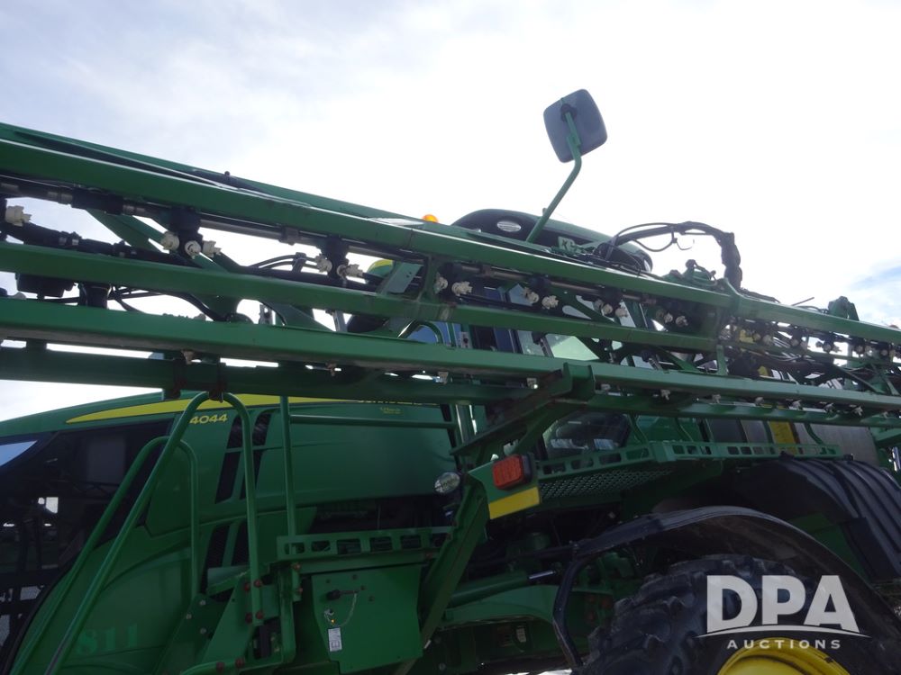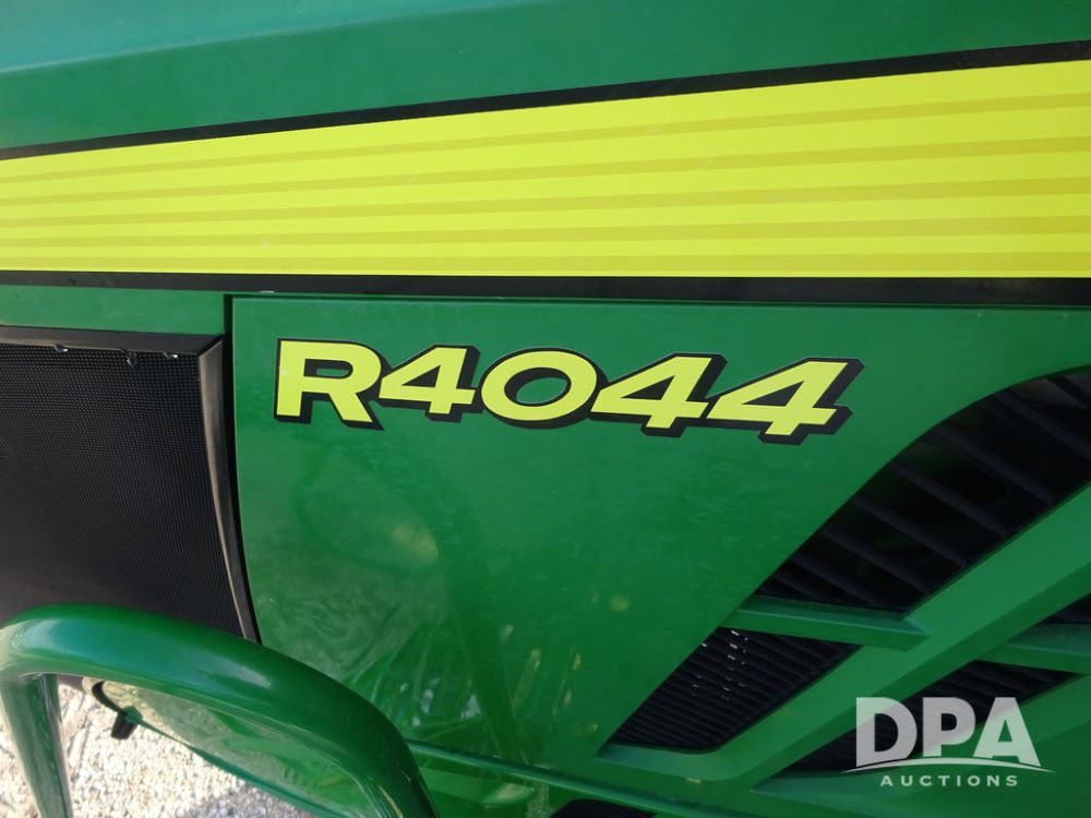 2019 John Deere R4044 Sprayer (PZ14308, Unit 811), John Deere diesel engine (S/N RG6090U066246), hydrostatic transmission, air conditioning, heat, Am/Fm radio, leather seat, buddy seat, beacon lights, 1200 gallon stainless steel liquid system, 120' boom, top poly rinse tank, stainless steel chemical inductor, automatic solution control, front fill, belly shields, Good Year Ultra Sprayer IF320/105R54 tires, fenders, rear camera, John Deere StarFire 6000 globe, John Deere monitor, shows 3,467 hours.