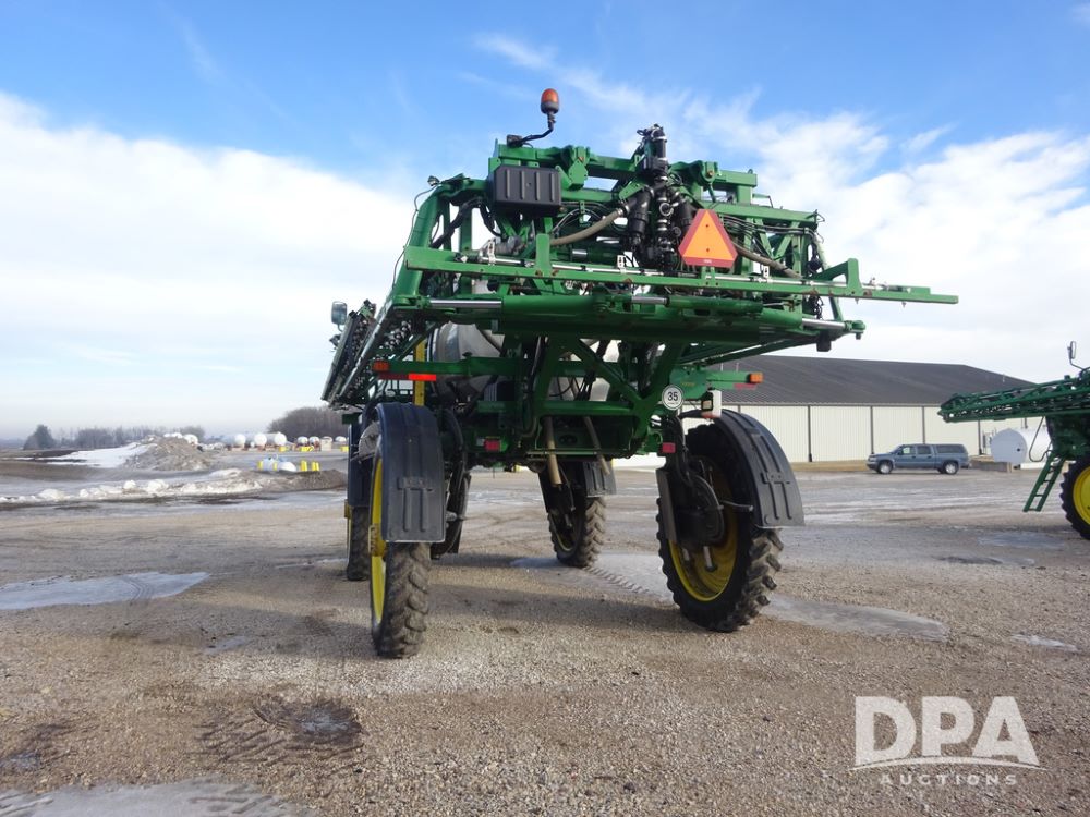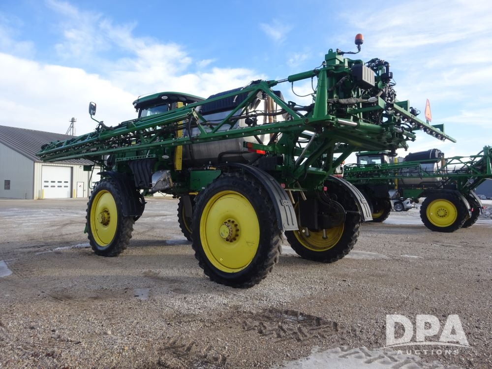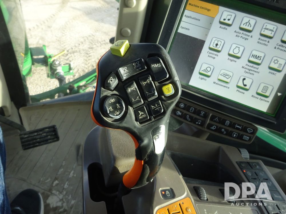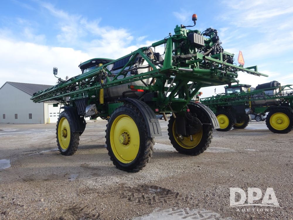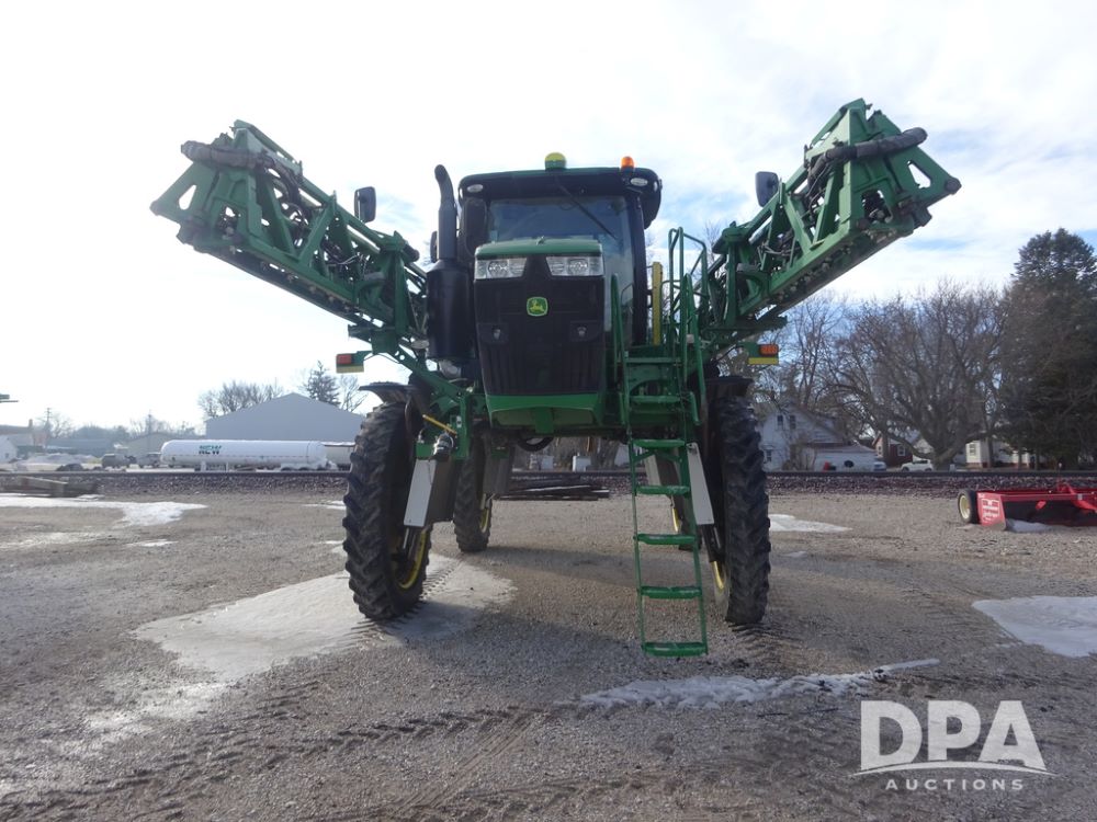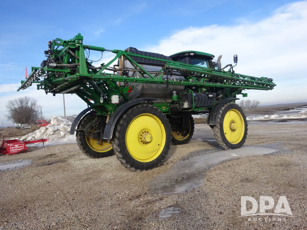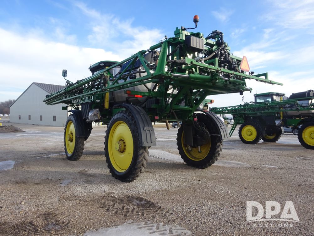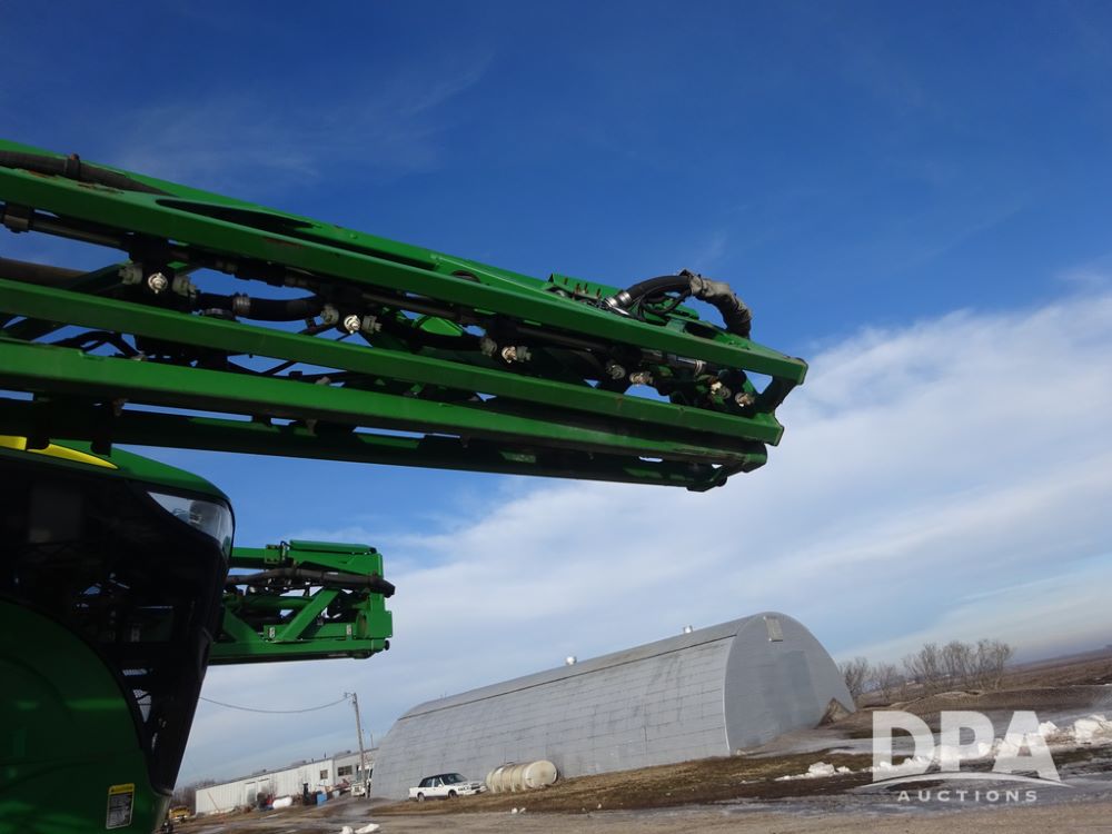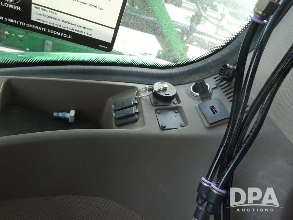 2019 John Deere R4044 Sprayer (PZ14308, Unit 811), John Deere diesel engine (S/N RG6090U066246), hydrostatic transmission, air conditioning, heat, Am/Fm radio, leather seat, buddy seat, beacon lights, 1200 gallon stainless steel liquid system, 120' boom, top poly rinse tank, stainless steel chemical inductor, automatic solution control, front fill, belly shields, Good Year Ultra Sprayer IF320/105R54 tires, fenders, rear camera, John Deere StarFire 6000 globe, John Deere monitor, shows 3,467 hours.