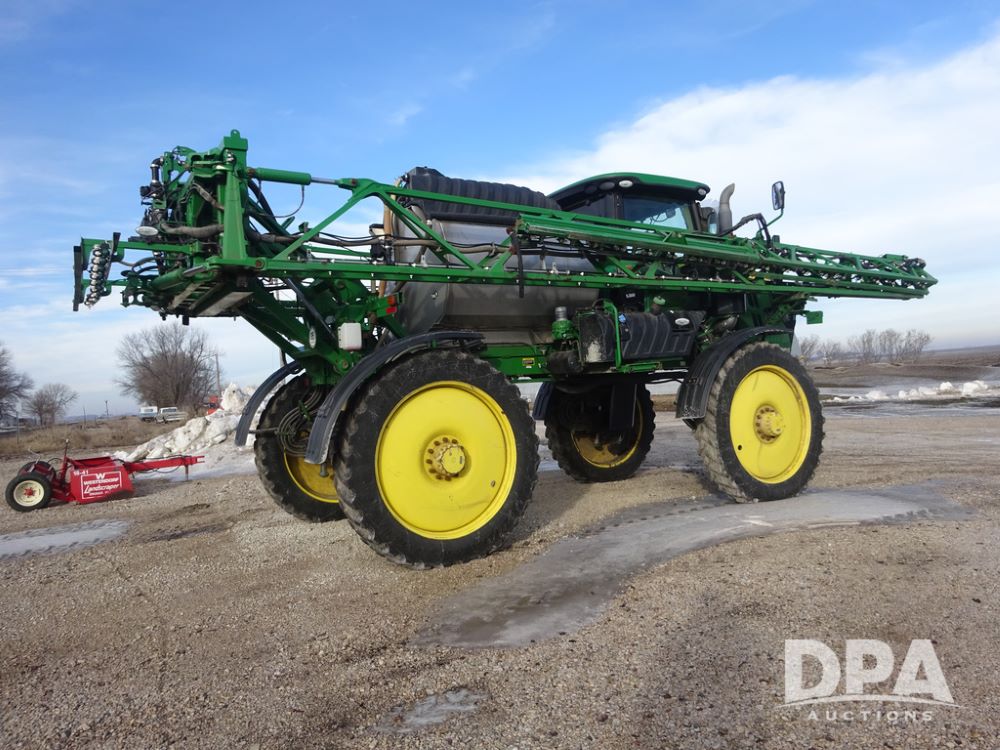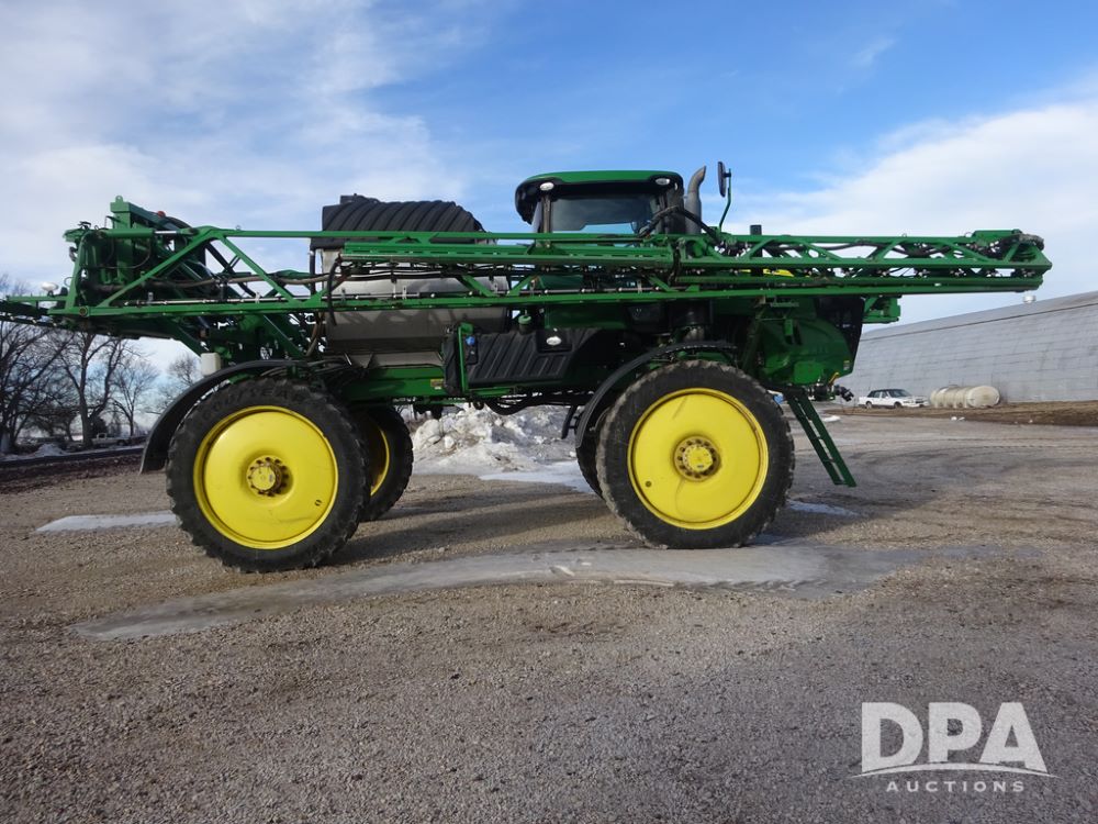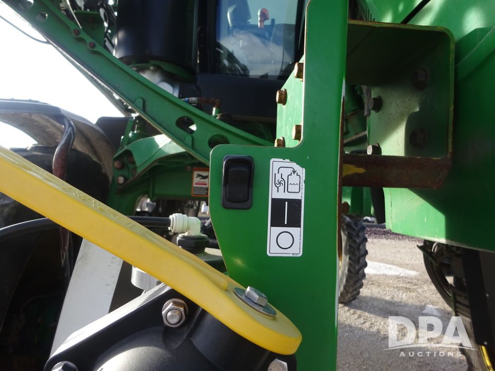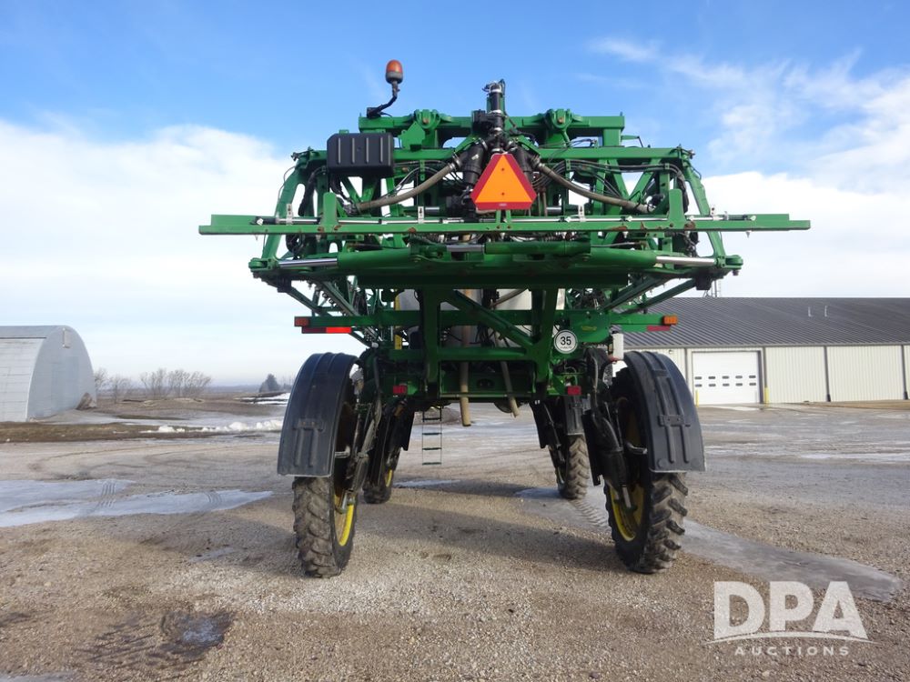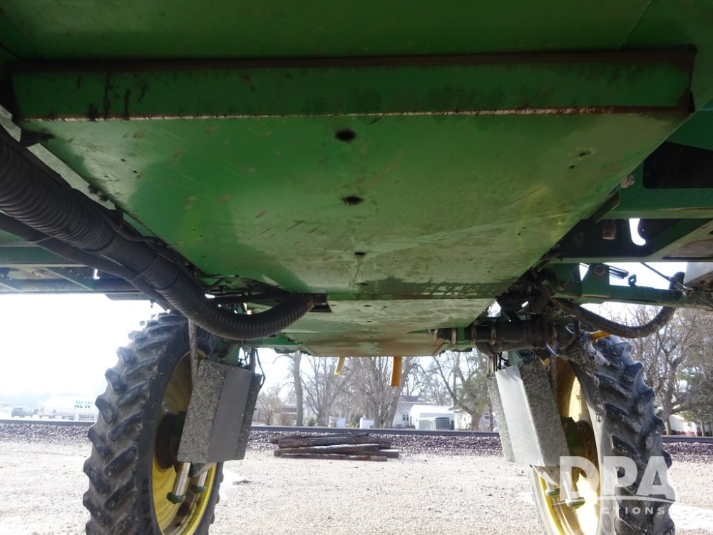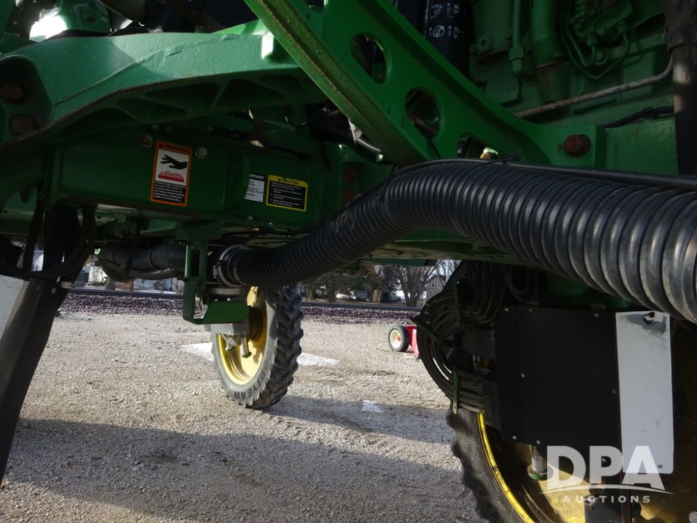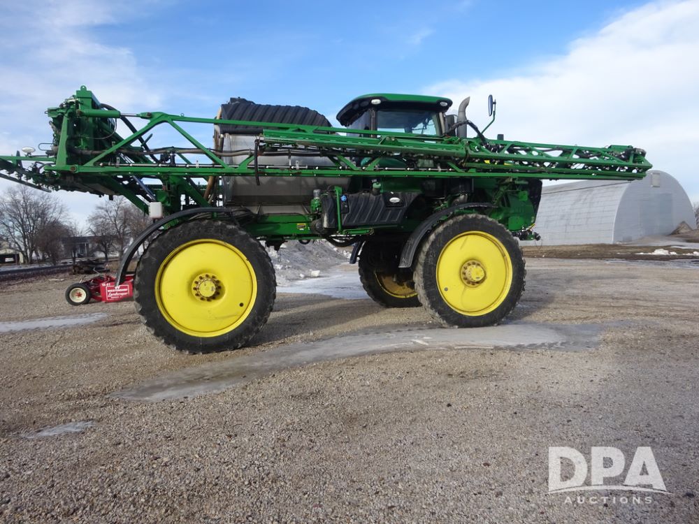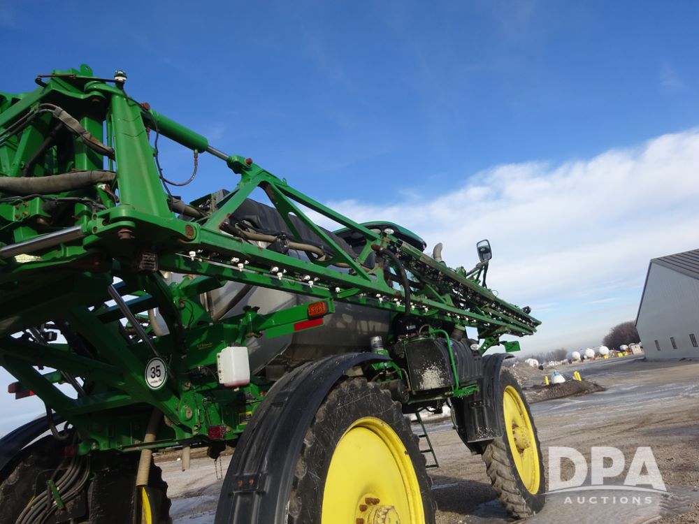 2019 John Deere R4044 Sprayer (PZ14308, Unit 811), John Deere diesel engine (S/N RG6090U066246), hydrostatic transmission, air conditioning, heat, Am/Fm radio, leather seat, buddy seat, beacon lights, 1200 gallon stainless steel liquid system, 120' boom, top poly rinse tank, stainless steel chemical inductor, automatic solution control, front fill, belly shields, Good Year Ultra Sprayer IF320/105R54 tires, fenders, rear camera, John Deere StarFire 6000 globe, John Deere monitor, shows 3,467 hours.