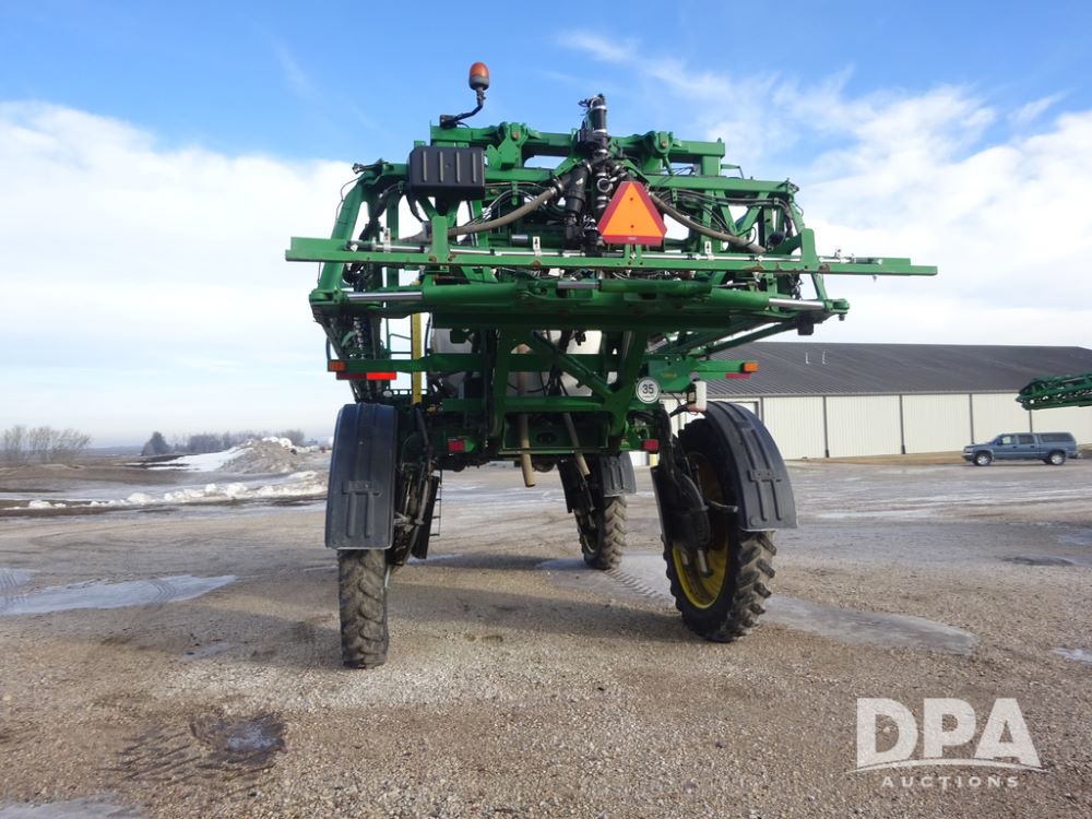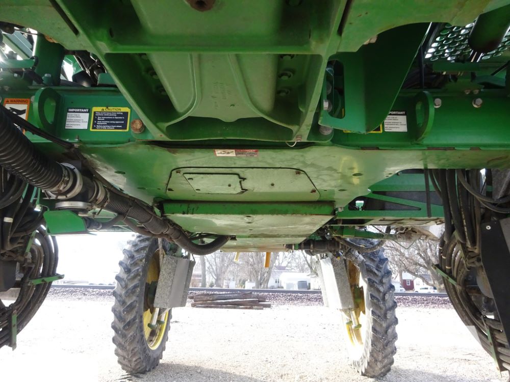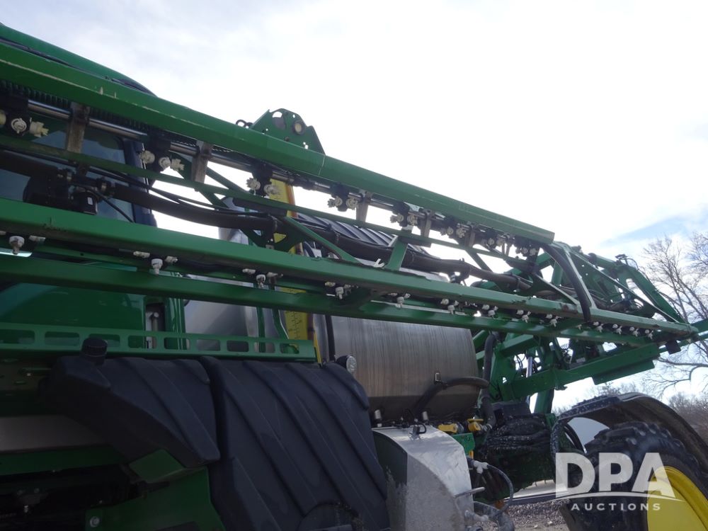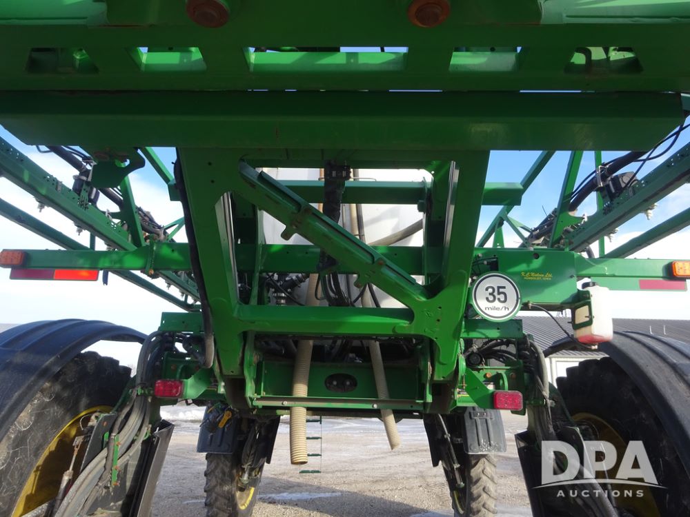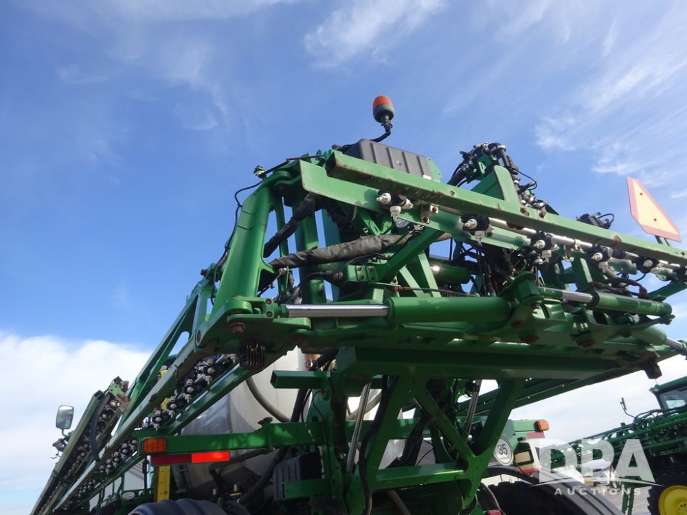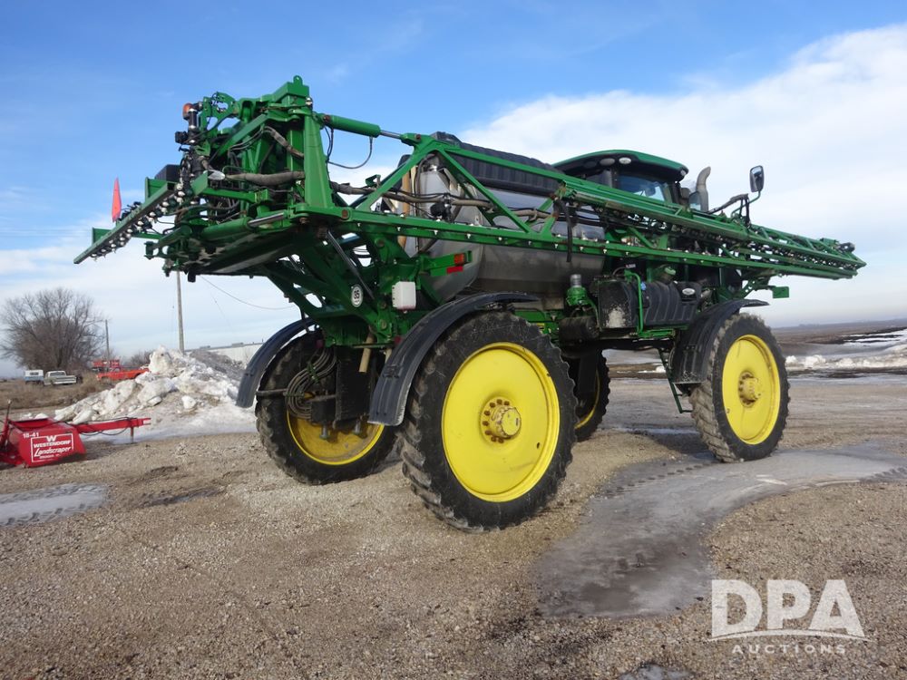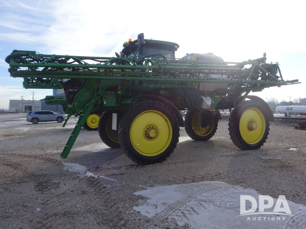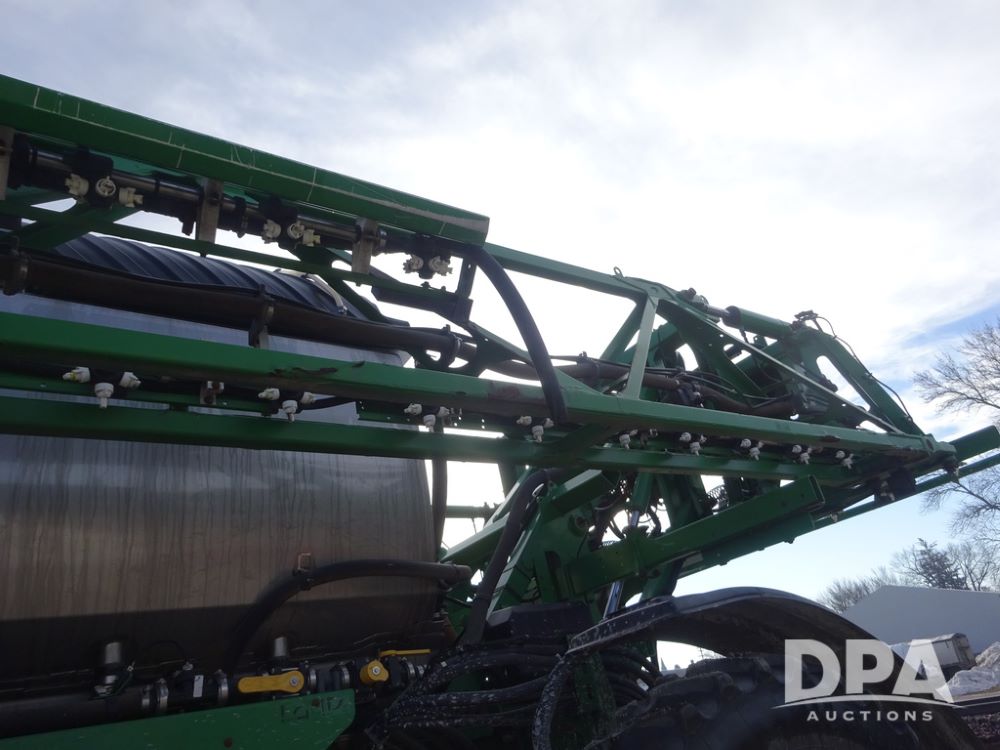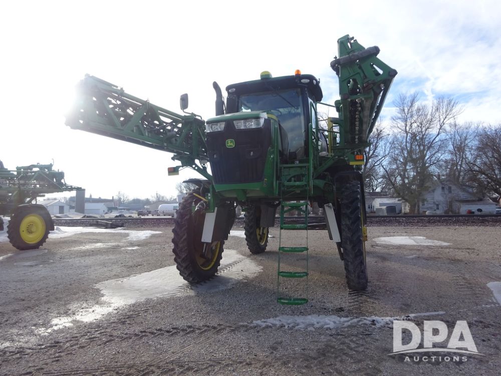 2019 John Deere R4044 Sprayer (PZ14308, Unit 811), John Deere diesel engine (S/N RG6090U066246), hydrostatic transmission, air conditioning, heat, Am/Fm radio, leather seat, buddy seat, beacon lights, 1200 gallon stainless steel liquid system, 120' boom, top poly rinse tank, stainless steel chemical inductor, automatic solution control, front fill, belly shields, Good Year Ultra Sprayer IF320/105R54 tires, fenders, rear camera, John Deere StarFire 6000 globe, John Deere monitor, shows 3,467 hours.