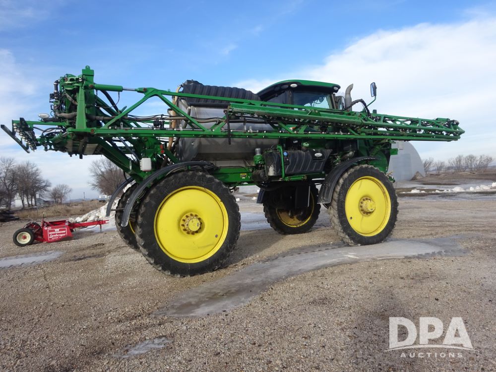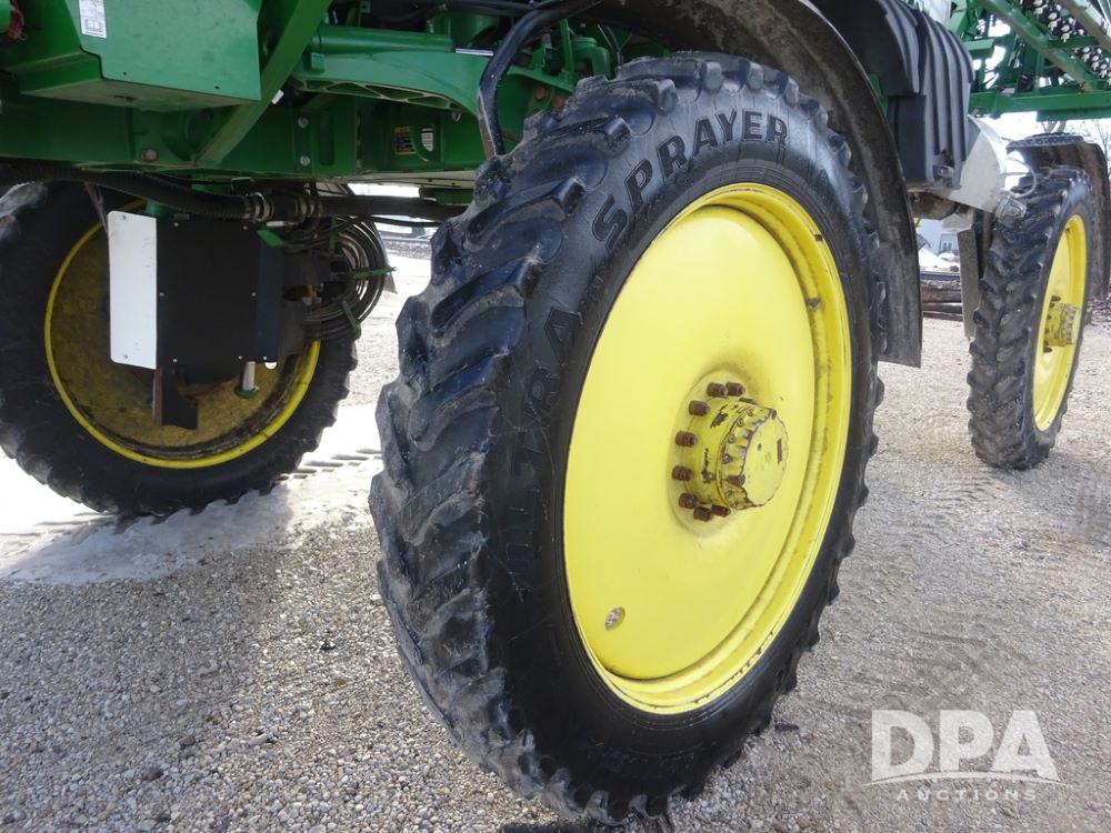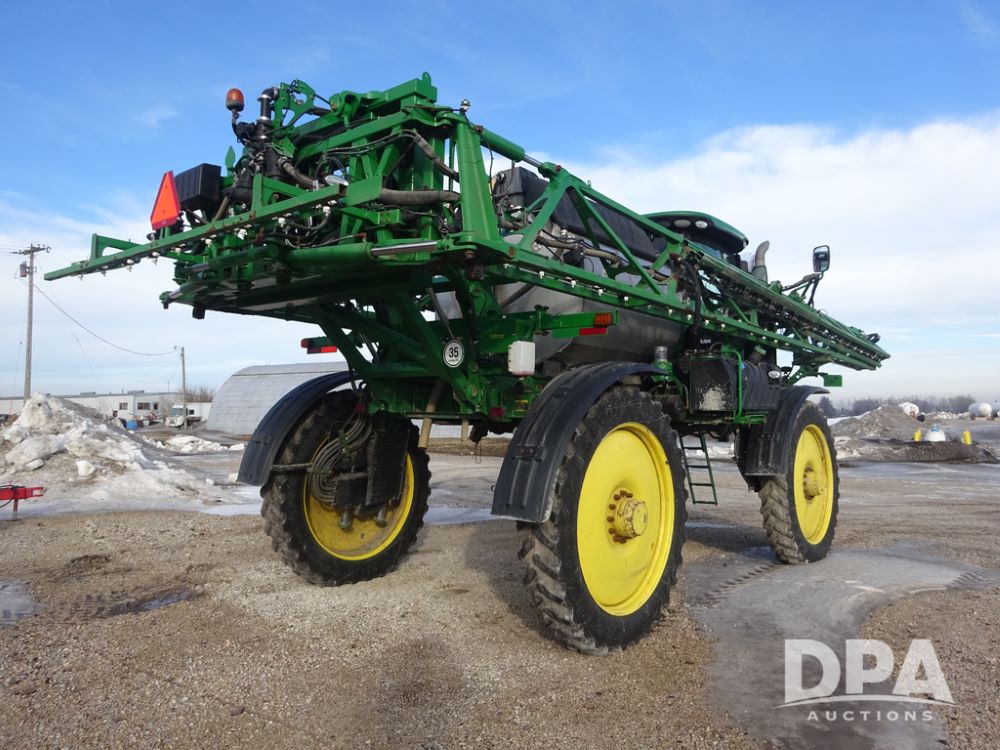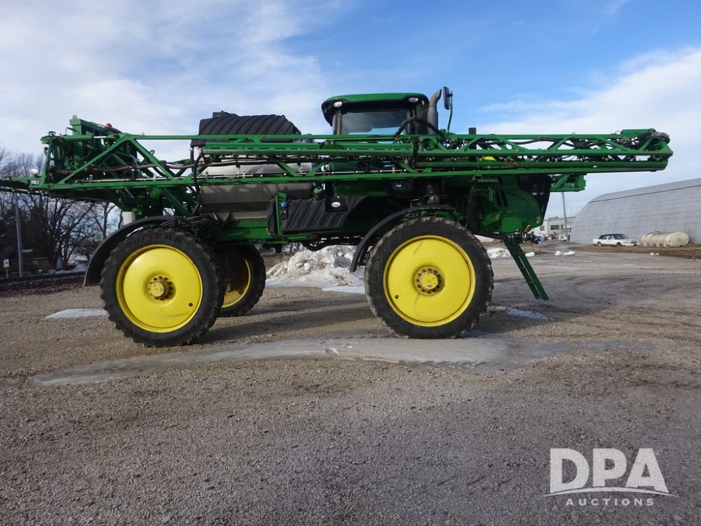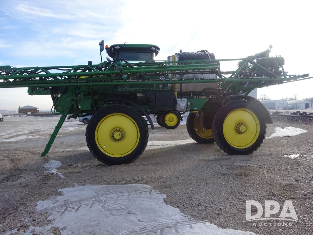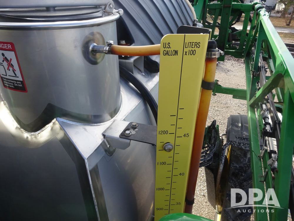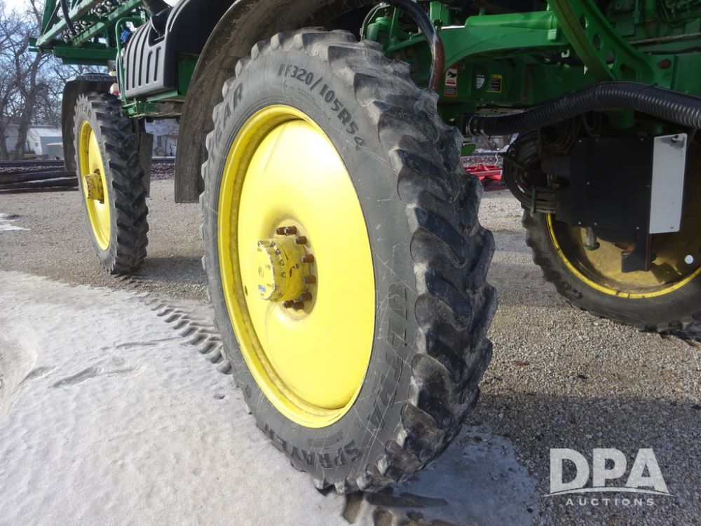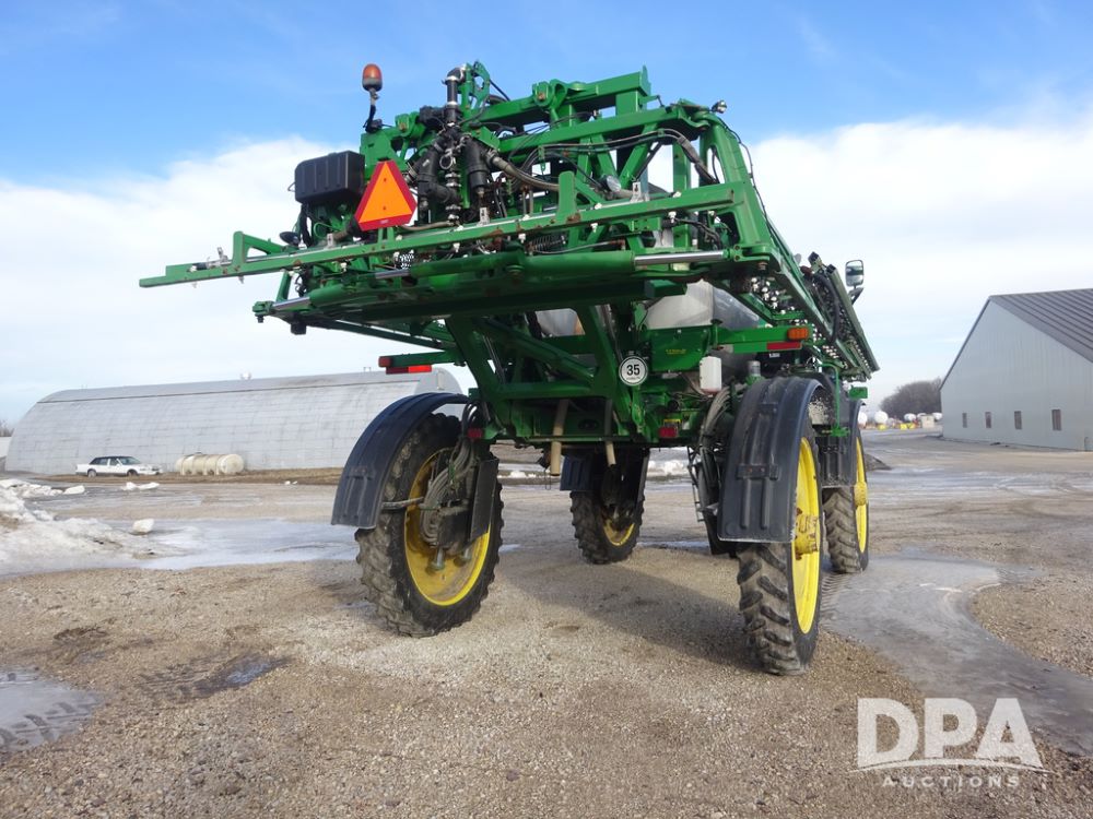 2019 John Deere R4044 Sprayer (PZ14308, Unit 811), John Deere diesel engine (S/N RG6090U066246), hydrostatic transmission, air conditioning, heat, Am/Fm radio, leather seat, buddy seat, beacon lights, 1200 gallon stainless steel liquid system, 120' boom, top poly rinse tank, stainless steel chemical inductor, automatic solution control, front fill, belly shields, Good Year Ultra Sprayer IF320/105R54 tires, fenders, rear camera, John Deere StarFire 6000 globe, John Deere monitor, shows 3,467 hours.