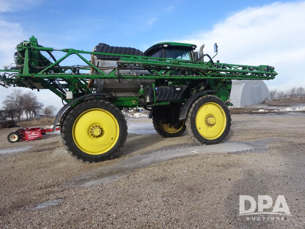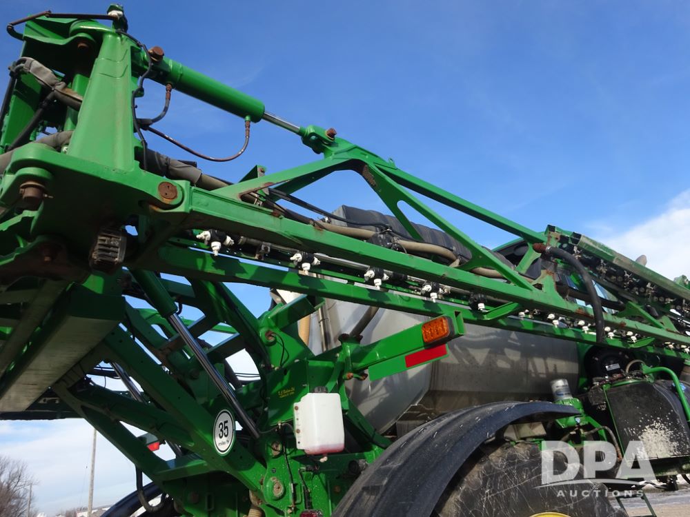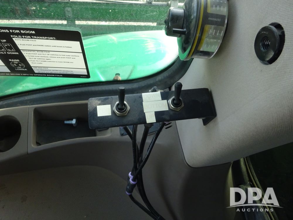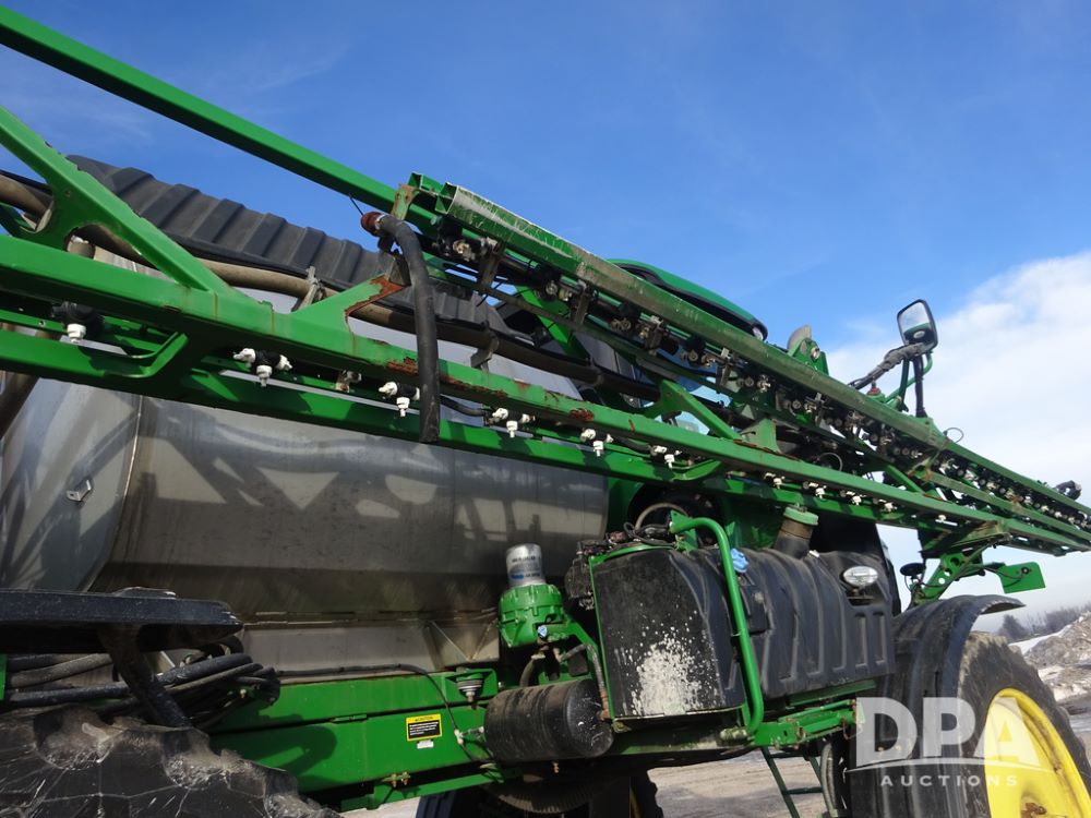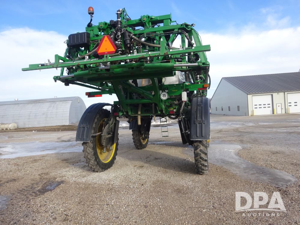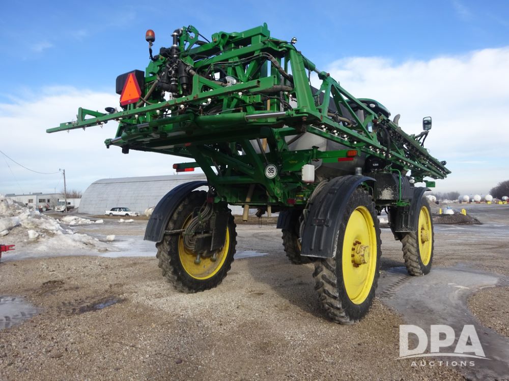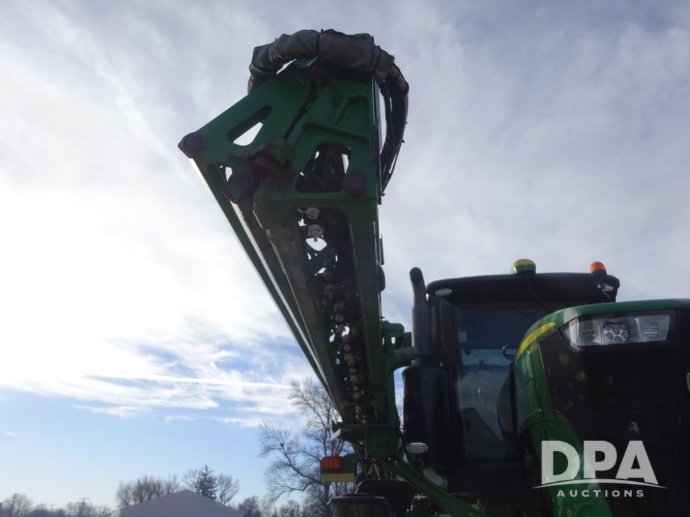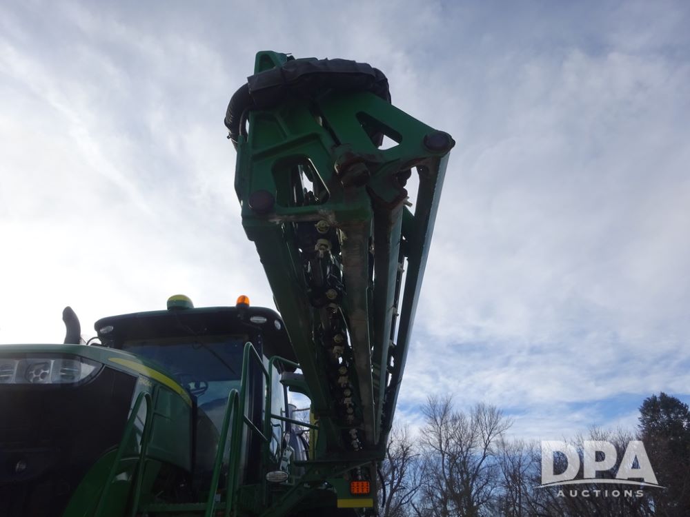 2019 John Deere R4044 Sprayer (PZ14308, Unit 811), John Deere diesel engine (S/N RG6090U066246), hydrostatic transmission, air conditioning, heat, Am/Fm radio, leather seat, buddy seat, beacon lights, 1200 gallon stainless steel liquid system, 120' boom, top poly rinse tank, stainless steel chemical inductor, automatic solution control, front fill, belly shields, Good Year Ultra Sprayer IF320/105R54 tires, fenders, rear camera, John Deere StarFire 6000 globe, John Deere monitor, shows 3,467 hours.