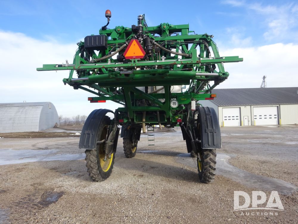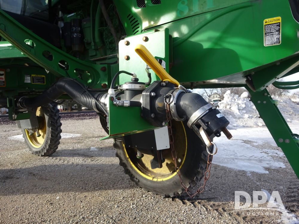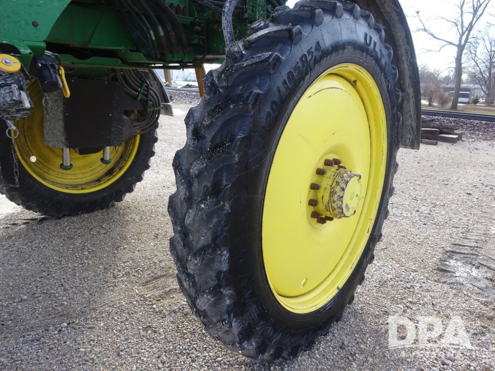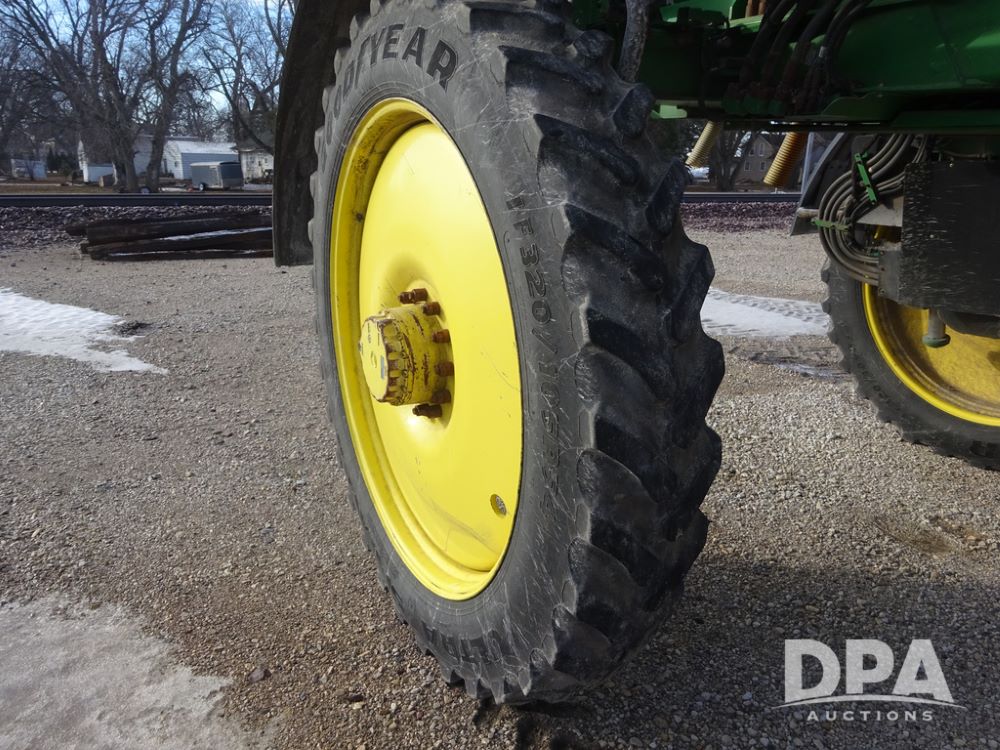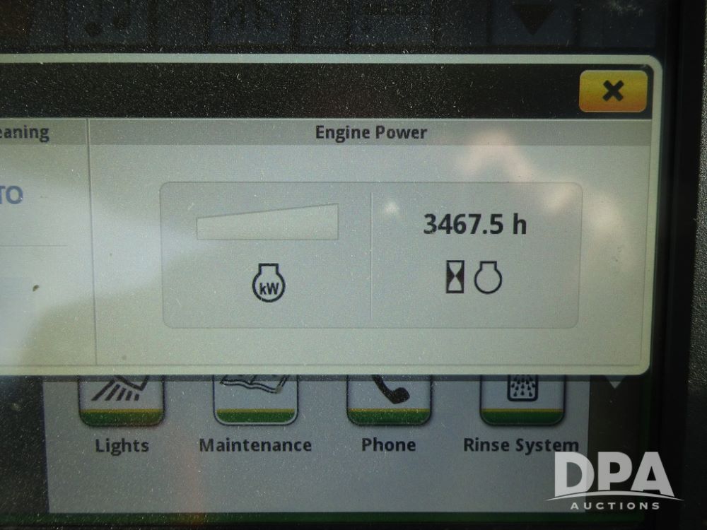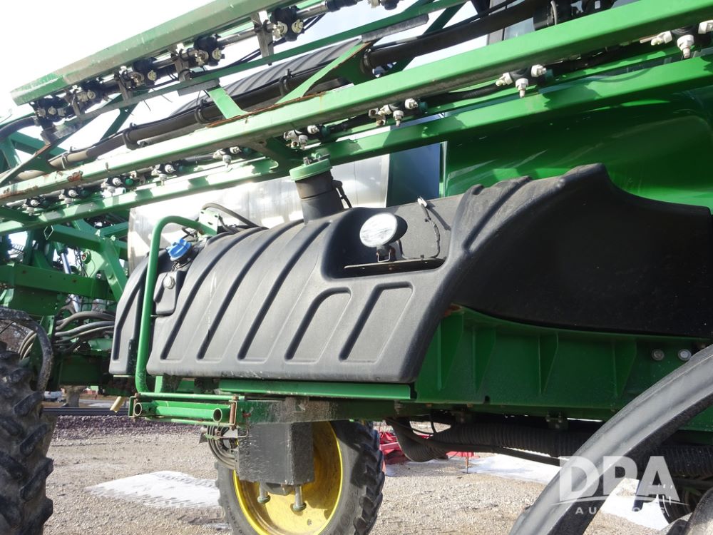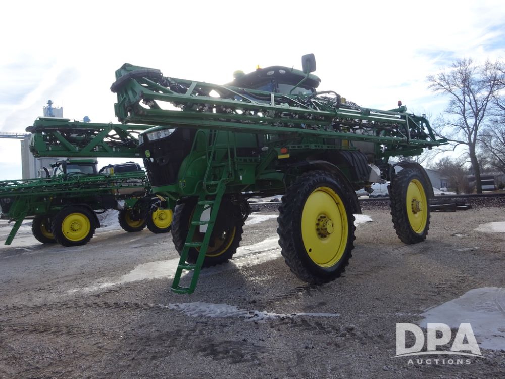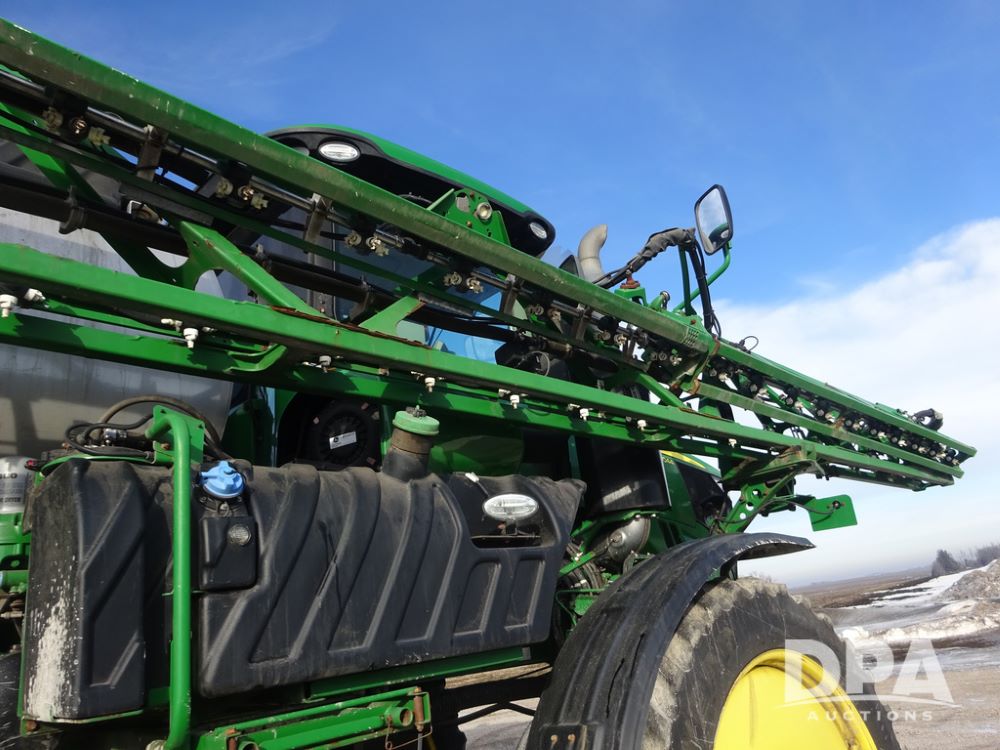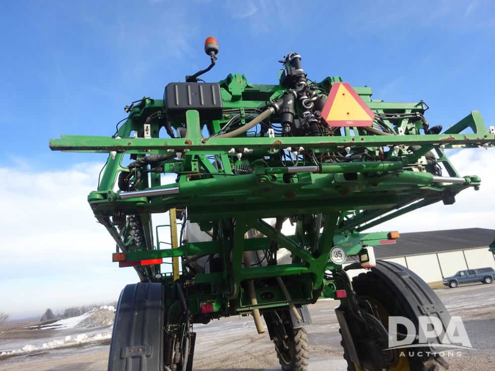 2019 John Deere R4044 Sprayer (PZ14308, Unit 811), John Deere diesel engine (S/N RG6090U066246), hydrostatic transmission, air conditioning, heat, Am/Fm radio, leather seat, buddy seat, beacon lights, 1200 gallon stainless steel liquid system, 120' boom, top poly rinse tank, stainless steel chemical inductor, automatic solution control, front fill, belly shields, Good Year Ultra Sprayer IF320/105R54 tires, fenders, rear camera, John Deere StarFire 6000 globe, John Deere monitor, shows 3,467 hours.