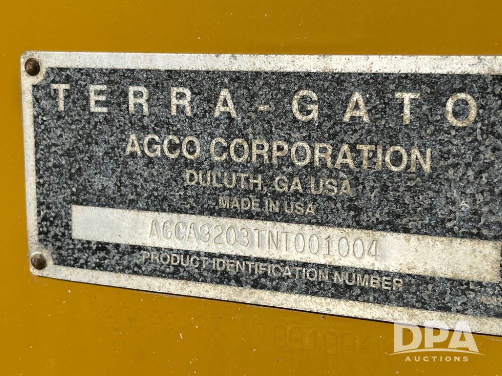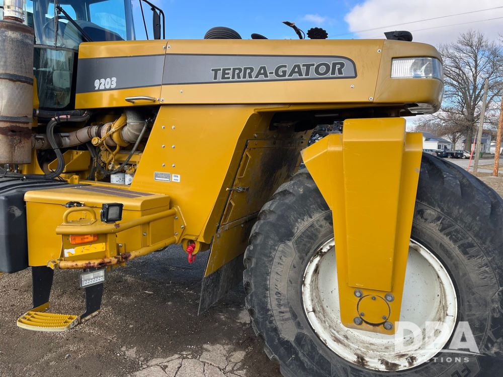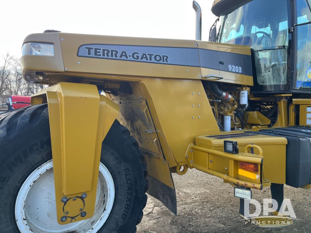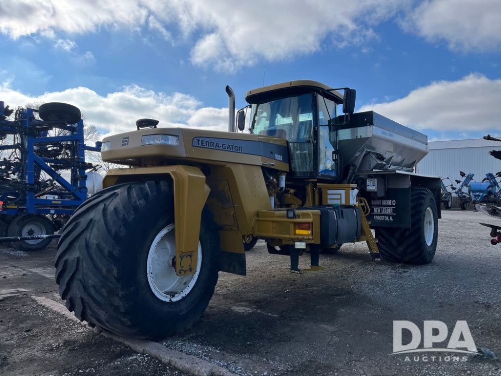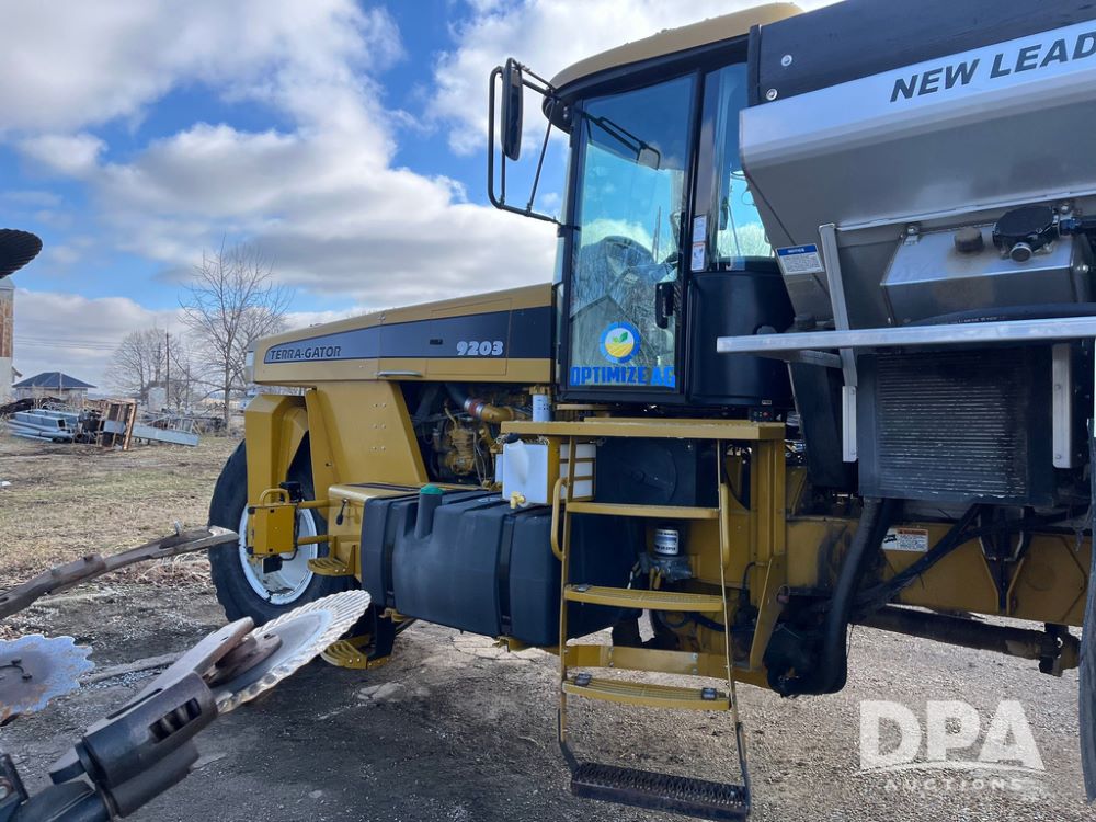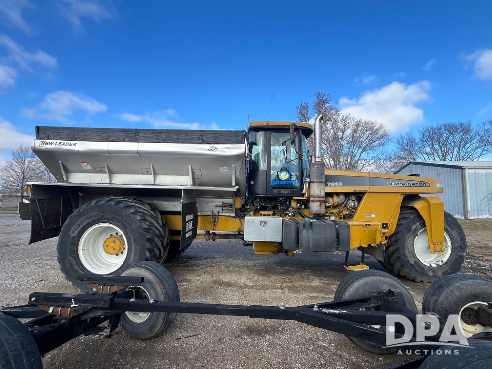 2008 Terra Gator 9203 Dry Floater (JN3653), Cat C13 diesel engine, transmission, heat, Am/Fm radio, New Leader L4000 -14 G4 stainless steel dry spreader box (S/N 135783), MultApplier Ready, slatted chain, dual spinners, hydraulic, Michelin 1000/55R32 tires, Cab Cam, New Leader GPS 6500, Raven Viper Pro monitor, approx. 9,000 hours.