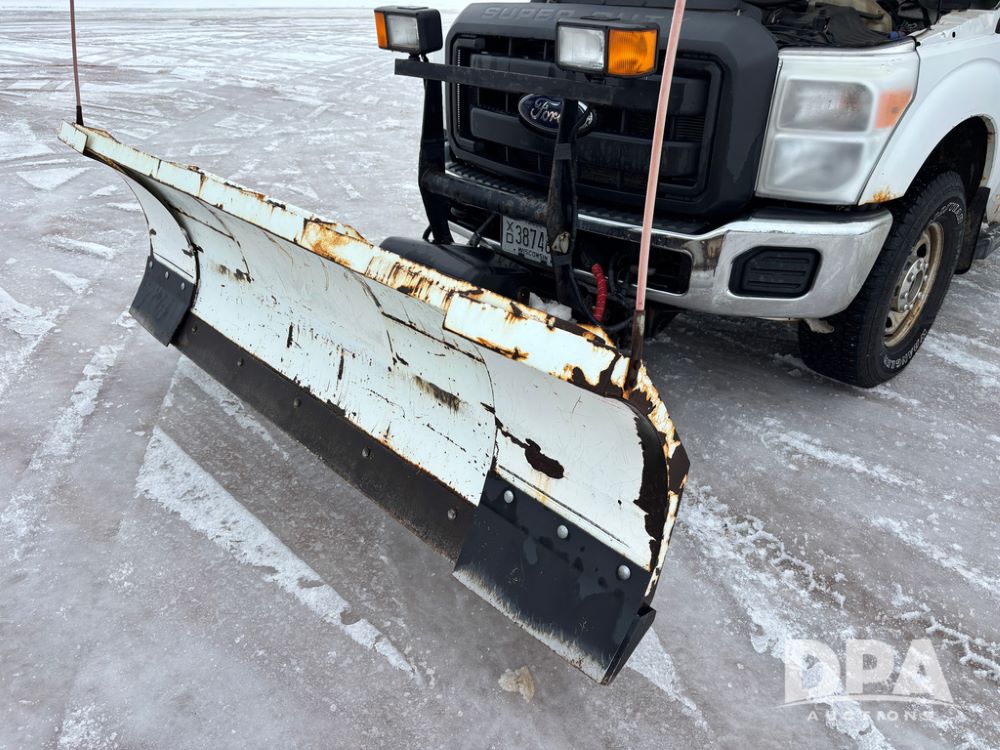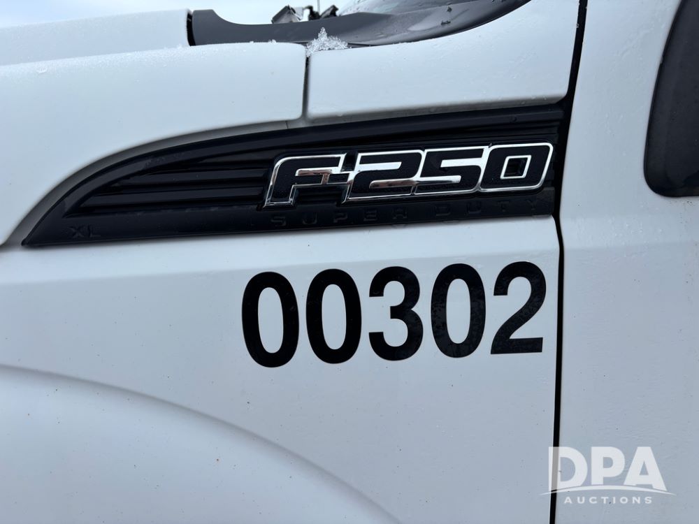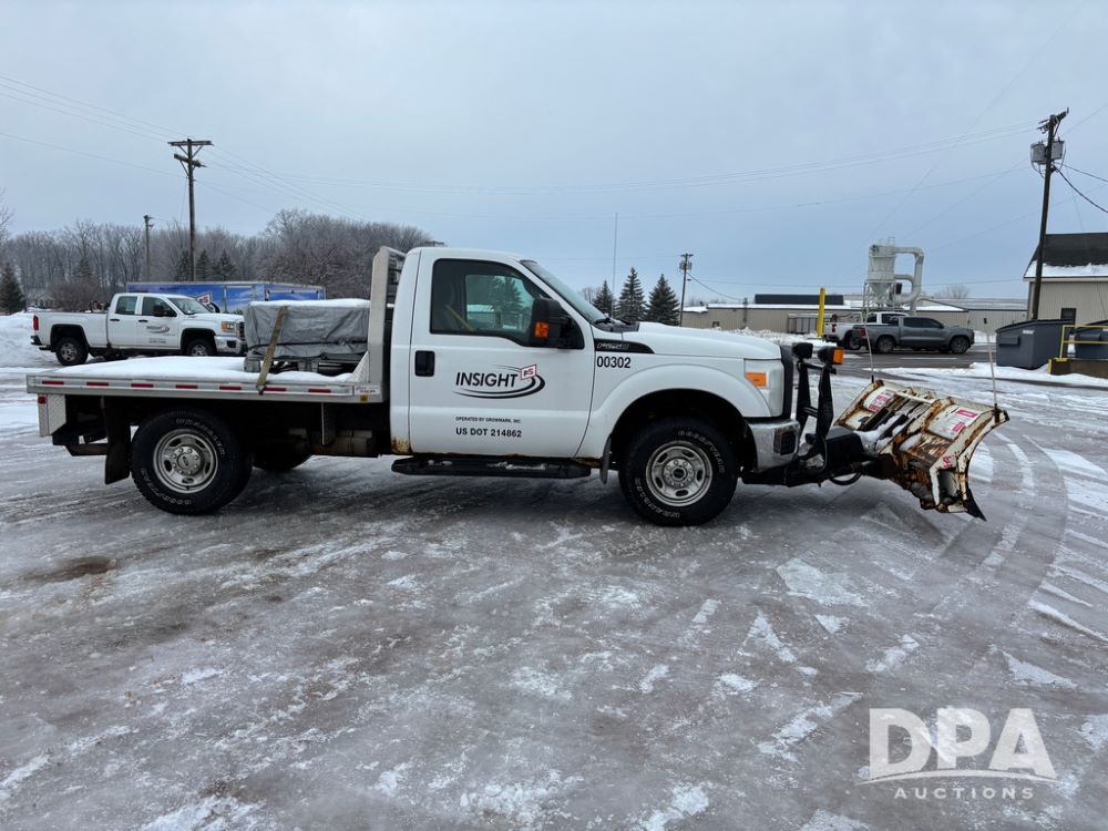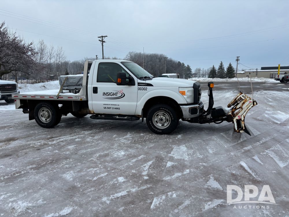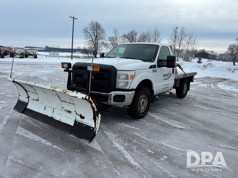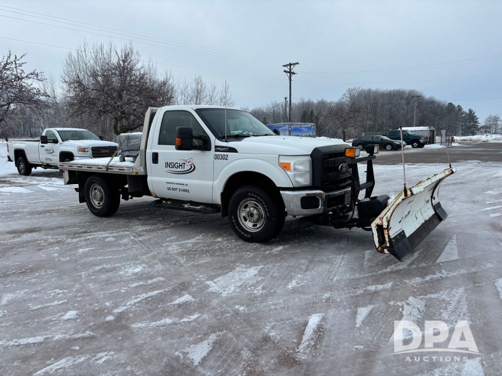 2012 Ford F250 Pickup (DR12934 Unit 0302), gas engine, automatic transmission, 4X4, Zimmerman 8' aluminum flatbed w/headache rack, Power Hitch front mounted snow plow w/cab controls, AM/FM CD radio, cruise control, rear receiver hitch, 285/70R17 tires, odometer reads 205,854 miles.